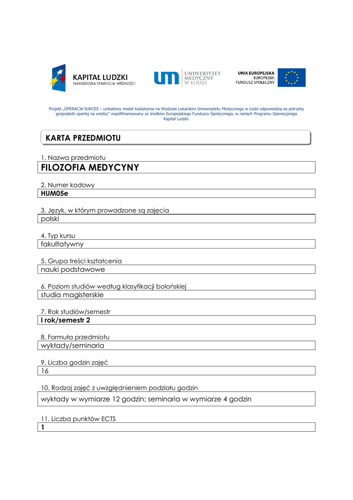 Projekt „OPERACJA SUKCES – unikatowy model kształcenia na Wydziale Lekarskim Uniwersytetu Medycznego w Łodzi odpowiedzią na potrzeby gospodarki opartej na wiedzy” współfinansowany ze środków Europejskiego Funduszu Społecznego, w ramach Programu Operacyjnego Kapitał Ludzki. KARTA PRZEDMIOTU 1. Nazwa przedmiotu FILOZOFIA MEDYCYNY 2. Numer kodowy HUM05e 3. Język, w którym prowadzone są zajęcia polski 4. Typ kursu fakultatywny 5. Grupa treści kształcenia nauki podstawowe 6. Poziom studiów według klasyfikacji bolońskiej studia magisterskie 7. Rok studiów/semestr I rok/semestr 2 8. Formuła przedmiotu wykłady/seminaria 9. Liczba godzin zajęć 16 10. Rodzaj zajęć z uwzględnieniem podziału godzin wykłady w wymiarze 12 godzin; seminaria w wymiarze 4 godzin 11. Liczba punktów ECTS 1 12. Jednostka dydaktyczna prowadząca przedmiot Zakład Bioetyki Katedra Nauk Humanistycznych 13. Imię i nazwisko osoby egzaminującej lub zaliczającej przedmiot Dr hab. n. hum. prof. nadzw. Kazimierz Szewczyk 14. Imię i nazwisko osoby prowadzącej wykłady dr Anna Alichniewicz 15. Osoby prowadzące zajęcia dr Anna Alichniewicz, dr Monika Michałowska, dr Anna Szczęsna, dr Joanna Turek, dr Waldemar Kwiatkowski, mgr Iwonna Rapałło, mgr Mikołaj Grochulski 16. Wymagania wstępne i wymagania równoległe nie dotyczy 17. Zaliczenie przedmiotu jest wymagane przed rozpoczęciem zajęć z nie dotyczy 18. Cele i założenia nauczania przedmiotu Przedstawienie idei filozoficznych mających wpływ na kształt i tendencje współczesnej medycyny. Wyrobienie ogólnej kultury umysłowej studentów. Przedstawienie głównych idei i zagadnień filozofii medycyny. Przedstawienie podstaw filozoficzno-etycznych etyki lekarskiej. Zaznajomienie z aparatem pojęciowym i językiem filozofii medycyny. Wyrobienie zdolności rozumienia i interpretacji tekstów filozoficznych. Wyrobienie nawyku krytycznego myślenia. Wyrobienie umiejętności posługiwania się językiem filozoficznym. Wyrobienie zdolności formułowania argumentów i dyskutowania problemów filozoficznomoralnych. 19. Metody dydaktyczne wykłady multimedialne, interaktywne: podczas wykładów studenci będą zapraszani do rozmowy i będą zachęcani do zadawania pytań; seminaria będą dyskusją poprzedzoną krótką prezentacją głównych pojęć, idei i stanowisk dotyczących analizowanego zagadnienia. 20. Wykaz literatury podstawowej i uzupełniającej Literatura podstawowa: • Dobro, zło i medycyna. Szewczyk K., Wyd. Naukowe PWN, Warszawa, 2001; • Filozofia medycyny. Wprowadzenie. Wulff H.R., Pedersen S.A., Rosenberg R., Wyd. Naukowe PWN, Warszawa, 1993; Literatura uzupełniająca: • Umysł, mózg i nauka. Searle J.; • Mózgi w naczyniu. Putnam H.; • O mężczyźnie, który pomylił swoją żonę z kapeluszem. Sachs O.; • Czarny mózg Piranesiego. Yourcenar M.; • Choroba jako metafora. Sontag S.; • Metafory AIDS. Sontag S.; • Pytania ostateczne, rozdz. Śmierć. Nagel T.; • Wzorce śmierci w bioetyce amerykańskie, rozdz. Śmierć, zmarły i umieranie – trzy wymiary tanatologii. Alichniewicz A. 21. Forma i warunki zaliczenia przedmiotu, w tym zasady dopuszczenia do egzaminu Zaliczenie z oceną. Warunki zaliczenia przedmiotu: − obecność na wszystkich zajęciach; − aktywność podczas zajęć; − zaliczenie końcowego testu z materiału omawianego na zajęciach. 22. Treści merytoryczne budujące wiedzę Filozofia a nauki szczegółowe. Model naukowy a filozoficzny model świata. Filozofia nauki: relacja teoria - doświadczenie, teoria – fakt, fakt absolutny i fakt względny, teorie rozwoju nauki. Filozofia medycyny – definicje. Natura medycyny. Problem inherentnego wymiaru moralnego medycyny. Metafizyka Antropologia grecka a podstawy chrześcijańska. filozoficzne Filozoficzne teorie medycyny cielesności. Hipokratejskiej. Kartezjańskie podstawy nauki nowożytnej. Mechanicyzm i redukcjonizm. Metoda analityczna. Dualizm metodologiczny nauk biologicznych i biomedycznych: wyjaśnienie przyczynowe i funkcjonalne. Problem psychofizyczny (Mind-body problem). Klasyczny problem relacji duszy i ciała a współczesny problem relacji mózgu i umysłu. Intencjonalność. Qualia. Czy mogą istnieć zombies? Superweniencja. Redukcjonizm a fenomenalizm. Kognitywizm a koneksjonizm. Test chińskiego pokoju, test Turinga. „Mózgi w naczyniu”. Ontologia choroby. Poszukiwanie metafizycznej istoty choroby. Choroba jako kara - cechy chorób, które podlegały tej interpretacji.. Choroba jako znak niedoskonałości bytu ludzkiego. Przypowieść o Hiobie. Nauczanie Starego i Nowego Testamentu. Katarktyczny i katalityczny sens choroby i cierpienia. Współczesna ontologizacja choroby. Choroba jako metafora. Fenomen romantycznej interpretacji gruźlicy i jej XXwieczne reprezentacje (metafora obłędu i raka). Powrót idei choroby jako kary za grzechy w interpretacjach AIDS. Tanatologia filozoficzna. Ontologizacja a substancjalizacja śmierci. Śmierć jako fenomen egzystencjalny o własnej ontologii u Heideggera. Śmierć jako zdarzenie graniczne. Ontologia śmierci jako progu egzystencjalnego. Fenomenologia śmierci: „Moja śmierć”, „Twoja śmierć” a „śmierć Innego”. Zło śmierci. Idea nieśmiertelności (niereligijna). Pozytywne i negatywne definicje zdrowia. Zjawisko medykalizacji kultury. 23. Efekty kształcenia – umiejętności i kompetencje Student po zakończeniu kursu filozofii medycyny powinien: − posiadać podstawową znajomość głównych zagadnień filozofii, kontrowersji i sporów filozoficznych; − mieć udoskonalone zdolności analityczne i zdolność poprawnego rozumowania; − posiadać umiejętność poprawnej argumentacji i kontrargumentacji; − mieć rozwiniętą wrażliwość intelektualną i poszerzoną świadomość konstytutywnych idei kultury zachodniej; − umieć rozpoznawać filozoficzne i kulturowe źródła współczesnych poglądów formułowanych w podstawowych i kl