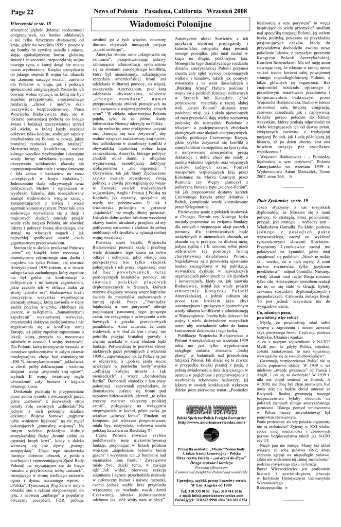 Page 22 Wierzewski ze str. 18 zrozumieć głęboki dylemat społeczności emigracyjnych, tak bardzo oddalonych ( nie tylko fizycznym dystansem) od kraju, gdzie we wrześniu 1939 r. posypały się bomby na cywilne osiedla i miasta, siejąc apokaliptyczny horror, globalną śmierć i zniszczenie, rozpoczęła się wojna nowego typu, o której dotąd nie miano nawet wyobrażenia. Książka uzmysławia do jakiego stopnia II wojna św. okazała się „końcem naszego świata”, zarówno dla Polaków w kraju, jak i polskich społeczności emigracyjnych.Postawiła ich bowiem wobec sytuacji, na którą nie byli zupełnie przygotowani, emocjonalnego rozdarcia „chcieć i móc”,w skali rzeczywiście bezprecedensowej. Praca Wojciecha Białasiewicza staje się w lekturze poruszającą podrożą do innego świata i ludzkiej rzeczywistości sprzed pół wieku, w której każdy rozdział odkrywa tylko kolejne, szokujące aspekty przebudzenia się Polonii w nowej, jakże brutalnej realności „wojny totalnej”. Monstrualnego kataklizmu, wobec którego wszelkie wyobrażalne i dostępne wtedy formy udzielania pomocy czy okazywania solidarności okazały się nieproporcjonalnie małe i wręcz śmieszne ( fala zabaw i bankietów na rzecz „cierpiących w kraju rodaków’). Jednocześnie skala odkrywanych teraz politycznych błędów i ograniczeń w wyobraźni liderów, dała nieoczekiwany asumpt środowiskom wrogim sanacji, sympatyzujących z lewicą i wręcz agentom komunistycznym. Przez taki etap szokowego wyzwalania się z iluzji i tragicznych złudzeń musiała przejść wtedy cała tutejsza Polonia, ale również liderzy i politycy świata alianckiego, aby stanąć na własnych nogach i jak najrychlej spróbować stawić czoła gigantycznym przeciwnościom. Staram się w skrócie przekazać Państwu „nerw” tej książki, która rzeczowo i dramatycznie rekonstruuje stan ducha i umysłów nie tylko Polonii, ale również Ameryki przed 1939 rokiem, a w istocie całego świata zachodniego, który zupełnie nie był gotów na konfrontacje z politycznym i militarnym zagrożeniem, jakie czekało ich w obliczu ataku ze strony „państw osi”. Białasiewicz kreśli precyzyjnie wszystkie współrzędne elementy sytuacji, która zawiodła w ślepy zaułek potężną Amerykę, chlubiąca się jeszcze, w zaślepieniu, „humanitarnymi aspektami” wyznawanej wówczas, przestarzałej doktryny izolacjonizmu i nie angażowania się w konflikty starej Europy, tak jakby zupełnie zapomniano o lekcji, którą przeszło to mocarstwo zaledwie w czasach I wojny światowej. Dla Polonii, która intensywnie wrastała w tamtejsze społeczeństwo w całym okresie międzywojnia, chcąc być ostentacyjnie „100 % zamerykanizowana”, jakkolwiek w chwili próby deklaracjami i wieloma akcjami wciąż „wspierała kraj ojców”, wybuch II wojny światowej nagle uświadomił cały bezsens i tragizm obranego kursu. Doskonale punktują to przypomniane przez autora rysunki z ówczesnych gazet, gdzie „cartoons” z pierwszych stron pełniły rolę swoistych „editorials”.Na jednym z nich polonijny działacz deklaruje Wujowi Samowi „najpierw tobie winienem lojalność” na tle mgieł pokazujących „atmosferę wojenną”. Na innym rodzina polonijna ślubuje amerykańskiej fladze „bronić ciebie do ostatniej kropli krwi”, kiedy z daleka wznoszą się już dymy „pożogi europejskiej”. Chęci tego środowiska ilustruje dobitnie obrazek z polskim kowbojem ( reprezentującym Zjazd Rady Polonii) na zrywającym się do biegu rumaku z przytroczoną torbą „ratunek”, ruszającego w stronę wielkiego zarzewia ognia i dymu, nazwanego wprost „Polska”. Tymczasem Wuj Sam w innym obrazku stoi z rękami skrępowanymi do tyłu, z napisem „embargo” a popularny ówczesny prezydent, FDR, próbuje News of Polonia Pasadena, California Wrzesień 2008 Wiadomości Polonijne uwolnić go z tych więzów, otoczony tłumem obywateli niosących petycje „znieść embargo”... Ameryka istotnie sama „skrępowała się sznurami”, przeprowadzając ustawy zabraniajace administracji opowiadania się za stronami europejskiego konfliktu, który był nieunikniony, zakazującymi sprzedaży amerykańskiej broni ani udzielania militarnej pomocy, co więcej, zakazywała Amerykanom, pod karą odebrania obywatelstwa, włożenie „obcego munduru”, nawet przeprowadzania zbiórek pieniężnych na cele związane z wojenną potrzebą „innych stron” ! W efekcie, także tutejsza Polonia pojeła, tyle, że za późno, kiedy hitlerowskie Niemcy uderzyły na Polskę – że nie wolno im teraz praktycznie uczynić nic, „kierując się serc porywem”, aby realnie wesprzeć zaatakowany kraj ojców, bez wchodzenia w zasadniczy konflikt z obywatelską lojalnością wobec kraju zamieszkania, Ameryki, którego politycy chodzili wciaż dumni z oficjalnie wyznawanej, samobójczej doktryny izolacjonizmu i „nie ingerencji” ! Oczywiście, tak jak Stany Zjednoczone szybko musiały zrewidować swoją politykę z chwilą przystąpienia do wojny w Europie swoich tradycyjnych sojuszników, Anglii i Francji ( Polską na Kapitolu, jak czytamy, specjalnie się wtedy nie przejmowano !) tak i środowiska polonijne w gorsecie „lojalności” nie mogły dłużej pozostać. Jednakże dobrowolnie założone wcześniej okowy bardzo utrudniały przejście od ery politycznej naiwności i złudzeń do pełnej moblizacji sił i środków w sytuacji realnej wojny światowej . Pierwsza część książki Wojciecha Białasiewicza pozwala skalę i przebieg wiele dramatów tego czasu na nowo odkryć i uchwycić, gdyż oferuje ona perspektywę nie tylko skupisk polonijnych i ich prasy, organizacji oraz ad hoc po woł ywanych teraz patriotycznych komitetów pomocy, ale również polskich placówek dyplomatycznych w Stanach, których trzeźwe diagnozy wnoszą wręcz kapitalne światło do materiałów zachowanych z tamtej epoki. Praca „”Pomiędzy lojalności