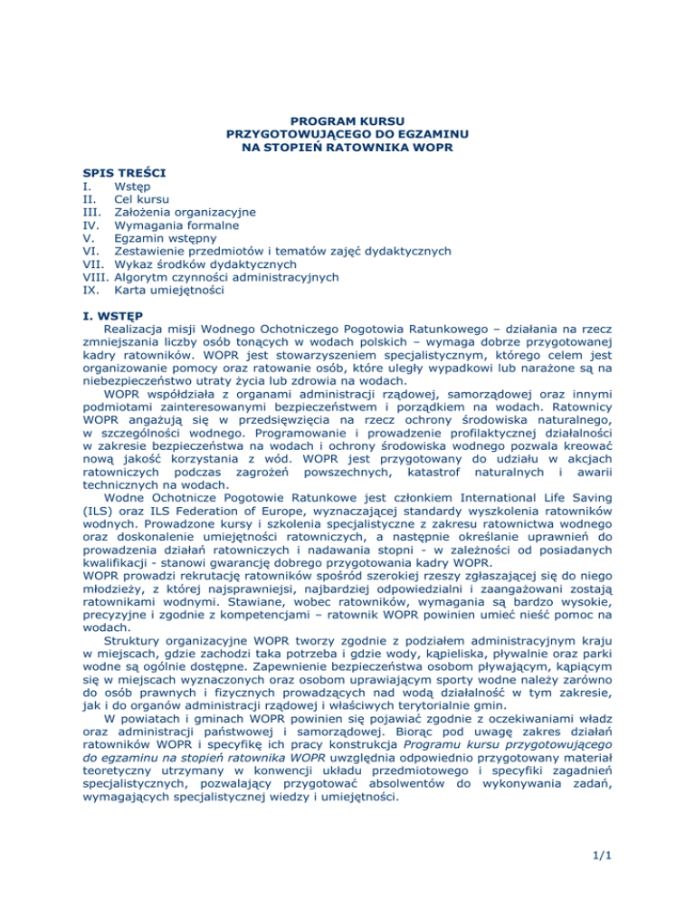 PROGRAM KURSU PRZYGOTOWUJĄCEGO DO EGZAMINU NA STOPIEŃ RATOWNIKA WOPR SPIS TREŚCI I. Wstęp II. Cel kursu III. ZałoŜenia organizacyjne IV. Wymagania formalne V. Egzamin wstępny VI. Zestawienie przedmiotów i tematów zajęć dydaktycznych VII. Wykaz środków dydaktycznych VIII. Algorytm czynności administracyjnych IX. Karta umiejętności I. WSTĘP Realizacja misji Wodnego Ochotniczego Pogotowia Ratunkowego – działania na rzecz zmniejszania liczby osób tonących w wodach polskich – wymaga dobrze przygotowanej kadry ratowników. WOPR jest stowarzyszeniem specjalistycznym, którego celem jest organizowanie pomocy oraz ratowanie osób, które uległy wypadkowi lub naraŜone są na niebezpieczeństwo utraty Ŝycia lub zdrowia na wodach. WOPR współdziała z organami administracji rządowej, samorządowej oraz innymi podmiotami zainteresowanymi bezpieczeństwem i porządkiem na wodach. Ratownicy WOPR angaŜują się w przedsięwzięcia na rzecz ochrony środowiska naturalnego, w szczególności wodnego. Programowanie i prowadzenie profilaktycznej działalności w zakresie bezpieczeństwa na wodach i ochrony środowiska wodnego pozwala kreować nową jakość korzystania z wód. WOPR jest przygotowany do udziału w akcjach ratowniczych podczas zagroŜeń powszechnych, katastrof naturalnych i awarii technicznych na wodach. Wodne Ochotnicze Pogotowie Ratunkowe jest członkiem International Life Saving (ILS) oraz ILS Federation of Europe, wyznaczającej standardy wyszkolenia ratowników wodnych. Prowadzone kursy i szkolenia specjalistyczne z zakresu ratownictwa wodnego oraz doskonalenie umiejętności ratowniczych, a następnie określanie uprawnień do prowadzenia działań ratowniczych i nadawania stopni - w zaleŜności od posiadanych kwalifikacji - stanowi gwarancję dobrego przygotowania kadry WOPR. WOPR prowadzi rekrutację ratowników spośród szerokiej rzeszy zgłaszającej się do niego młodzieŜy, z której najsprawniejsi, najbardziej odpowiedzialni i zaangaŜowani zostają ratownikami wodnymi. Stawiane, wobec ratowników, wymagania są bardzo wysokie, precyzyjne i zgodnie z kompetencjami – ratownik WOPR powinien umieć nieść pomoc na wodach. Struktury organizacyjne WOPR tworzy zgodnie z podziałem administracyjnym kraju w miejscach, gdzie zachodzi taka potrzeba i gdzie wody, kąpieliska, pływalnie oraz parki wodne są ogólnie dostępne. Zapewnienie bezpieczeństwa osobom pływającym, kąpiącym się w miejscach wyznaczonych oraz osobom uprawiającym sporty wodne naleŜy zarówno do osób prawnych i fizycznych prowadzących nad wodą działalność w tym zakresie, jak i do organów administracji rządowej i właściwych terytorialnie gmin. W powiatach i gminach WOPR powinien się pojawiać zgodnie z oczekiwaniami władz oraz administracji państwowej i samorządowej. Biorąc pod uwagę zakres działań ratowników WOPR i specyfikę ich pracy konstrukcja Programu kursu przygotowującego do egzaminu na stopień ratownika WOPR uwzględnia odpowiednio przygotowany materiał teoretyczny utrzymany w konwencji układu przedmiotowego i specyfiki zagadnień specjalistycznych, pozwalający przygotować absolwentów do wykonywania zadań, wymagających specjalistycznej wiedzy i umiejętności. 1/1 II. CEL KURSU Celem kursu jest przygotowanie do egzaminu na stopień Ratownika WOPR uprawniającego pełnoletniego ratownika do samodzielnej pracy na pływalniach i parkach wodnych oraz w zespole ratowników pod nadzorem ratownika wodnego na kąpieliskach, pływalniach i w parkach wodnych, a takŜe podczas zorganizowanych form turystyki oraz w czasie imprez na wodach i nad wodami, a w szczególności: 1) samoratownictwa; 2) prowadzenia działań profilaktycznych i prewencyjnych; 3) zapewnienia bezpieczeństwa na kąpieliskach, pływalniach i w parkach wodnych; 4) prowadzenia akcji ratowniczych; 5) uŜywania sprzętu ratowniczego; 6) udzielania pierwszej pomocy; 7) kształtowania postaw prozdrowotnych i proekologicznych. III. ZAŁOśENIA ORGANIZACYJNE 1. Organizatorem kursu są jednostki organizacyjne WOPR. 2. Program kursu powinien być zrealizowany w czasie od 32 do 64 jednostek dydaktycznych (jednostka dydaktyczna wynosi 45’). 3. Szczegółową ilość jednostek dydaktycznych ustala jednostka organizacyjna w zaleŜności od liczby uczestników, dostępnych pomocy dydaktycznych, warunków organizacyjnych, sprzętowych, lokalowych i atmosferycznych. 4. Zajęcia praktyczne odbywają się na wodach, na których nie ma zakazu pływania i kąpieli. 5. Kurs moŜe być zorganizowany w formie stacjonarnej lub w formie zajęć cyklicznych. 6. Za stronę formalną odpowiedzialny jest kierownik kursu. 7. Za stronę programową kursu odpowiedzialny jest prowadzący kurs instruktor WOPR. 8. Kandydaci na kurs przyjmowani są po spełnieniu wymogów formalnych. 9. Kursy R WOPR naleŜy realizować zgodnie z algorytmem czynności zawierającej elementy rejestracji, realizacji, egzaminowania, rozliczania, obsługi Centralnej Ewidencji (CE) WOPR, przydzielania punktów specjalizacyjnych oraz zawiera wzory dzienników, pieczęci, identyfikatorów, zaświadczeń, regulaminów, standardów wyposaŜenia. IV. WYMAGANIA FORMALNE 1. Uczestnik ma mieć ukończony 16 rok Ŝycia. 2. Uczestnik ma posiadać: a) stopień młodszego ratownika WOPR; b) waŜną legitymację członka WOPR z poświadczeniem lekarskim o zdolności do pracy w charakterze ratownika na dany rok; c) specjalną kartę pływacką; d) patent lub uprawnienie przydatne w ratownictwie wodnym. V. SPRAWDZIAN WSTĘPNY 1. Przepłynięcie dystansu 100 m sposobem dowolnym w czasie poniŜej 1’ 50” wyłącznie na piersiach. 2. Przepłynięcie pod wodą dystansu co najmniej 15m bez łamania powierzchni wody. 2/2 VI. ZESTAWIENIE PRZEDMIOTÓW I TEMATÓW ZAJĘĆ DYDAKTYCZNYCH LP 1 1 2 1 2 3 3 1 2 3 4 1 2 3 4 5 5 1 2 3 4 5 6 7 8 9 6 1 2 3 4 Tematyka zajęć Sprawdzian wstępny Egzamin praktyczny Wiadomości ogólne i profilaktyka Cel, zadania, rola i 