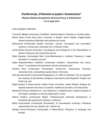 Konferencja „Polisemia umaczeniu” „Polisemia w języku j zyku i tłumaczeniu umaczeniu” Wyższa Szkoła Zarządzania Ochroną Pracy w Katowicach 12-13 maja 2014 Lista przyjętych referatów: Yousuf B. AlBader (University of Sheffield, United Kingdom): Polysemy in Kuwaiti Arabic Reima Sado Al-Jarf (King Saud University in Riyadh, Saudi Arabia): English-Arabic student translators difficulties with polysemous words Mohammad Al-Khawalda (Mutah University, Jordan): Conceptual and connotative meaning of body parts: Examples from Jordanian Arabic Jamal alQinai (Kuwait University): Convergence and Divergence in the Interpretation of Quranic Polysemy and Lexical Recurrence Rafał Augustyn (Uniwersytet Marii Curie-Skłodowskiej w Lublinie): Polysemy in legal translation: A cognitive account Agata Brajerska-Mazur (Katolicki Uniwersytet Lubelski): „Odpowiednie dać rzeczy słowo”: O przekładzie Norwidowskich technik semantycznych Karolina Broś (Uniwersytet Warszawski): Kompromis, konkurencja, koncesja: wieloznaczność z perspektywy językoznawcy i tłumacza Anita Buczek-Zawiła (Uniwersytet Pedagogiczny im. KEN w Krakowie): Can we decipher the meaning of phonetically ambiguous expressions phonologically? English and Polish say ‘yes’ Diego Burgos & Jordan Burner (Wake Forest University, United States): Bridging the disparity between the lexicon of patients, healthcare providers, and interpreters Bartłomiej Cichosz (Akademia im. Jana Długosza w Częstochowie): Cognitive aspects of the English translation of Andrzej Sapkowski’s novels Sabina Deditius (Uniwersytet Śląski): Polisemiczność jednostek leksykalnych w kontekście gier językowych nadawcy z odbiorcą Marta Dobrowolska (Uniwersytet Wrocławski): W poszukiwaniu prototypu. Polisemia czasowników bać się, obawiać się i martwić się Siergiej Grinev-Griniewicz (Uniwersytet w Białymstoku): Polysemy in language and thought Michał Hrabia (Uniwersytet Śląski): Jechać czy jeździć? Wybrane problemy dezambiguizacji znaczeniowej francuskich czasowników ruchu. Opis w ramach ujęcia zorientowanego obiektowo dla celów tłumaczenia automatycznego Roksana Kasperek (Akademia im. Jana Długosza w Częstochowie): Polysemy in drug culture via cognitive operations on the basis of English-language films Adam Kiełbik (Akademia im. Jana Długosza w Częstochowie): Morphological processes in J. Joyce's Finnegans Wake and its Polish translation Krzysztof Korżyk (Wyższa Szkoła Zarządzania Ochroną Pracy w Katowicach): Wieloznaczność i pragmatyczne mechanizmy precyzowania sensu Mirosław Koziarski (Uniwersytet im. Adama Mickiewicza w Poznaniu): Perspectives of Multilingual Lexicography and Computing the Degree of Equivalence on the Example of Technical Dictionaries Ewa Kucelman (Uniwersytet Pedagogiczny im. KEN w Krakowie): Non-verbal uses of ‘like’ in Early Modern English Kalina Labuz (Uniwersytet Jana Kochanowskiego w Kielcach): Translating the Palio: an analysis of the translation from Italian to Polish Alicja Ewa Ligocka (Wyższa Szkoła Medyczna w Białymstoku): Zjawisko polisemii i homonimii w angielskiej terminologii leksykologicznej Karolina Lisczyk-Kubina (Uniwersytet Śląski): Polisemia czasowników w opisach leksykograficznych a badania semantyczne Niećko-Bukowska Bożena (Uniwersytet im. Adama Mickiewicza w Poznaniu): Charakterystyka znaczeń wyrażeń: tak naprawdę, na pewno i oczywiście Roman Ociepa (Wyższa Szkoła Zarządzania Ochroną Pracy w Katowicach): Polysemy of English and Polish suffixes: the case of the emerging suffix “-ling” and its Polish renditions Joanna Podhorodecka & Anna Ścibior-Gajewska (Uniwersytet Pedagogiczny im. KEN w Krakowie): What is like like – Polysemous senses and grammatical categories Joanna Podhorodecka (Uniwersytet Pedagogiczny im. KEN w Krakowie): Polysemy in the non-finite complementation of the verbs like and love Monika Porwoł (Państwowa Wyższa Szkoła Zawodowa w Raciborzu): Opening Pandora’s box: polysemy in the dental (texts) translation Anna Riccio (University of Naples “L’Orientale”, Italy): Verb patterns in French and Italian Medical Discourse Aleksey Arkadievich Romanov & Olga Vladimirovna Novoselova (Tver State Agricultural Academy, Russia): Polysemy in the threat discourse Agnieszka Solska (Uniwersytet Śląski): The interpretive mechanism(s) of ambiguitybased wordplay Tatiana Szczygłowska (Akademia Techniczno-Humanistyczna w Bielsku-Białej): Polysemous senses of the body part terms head, eye and nose motivated by cognitive processes: a corpus-driven analysis Artur świątek (Uniwersytet Pedagogiczny im. KEN w Krakowie): The perception of selected polysemous expressions by Polish students of English Philology