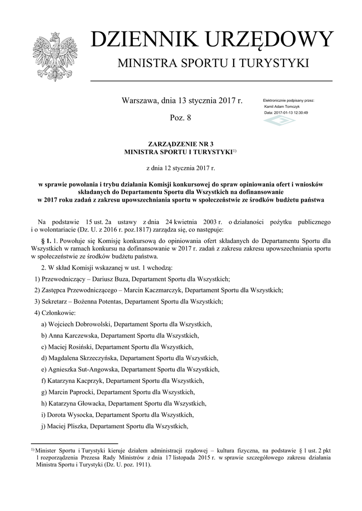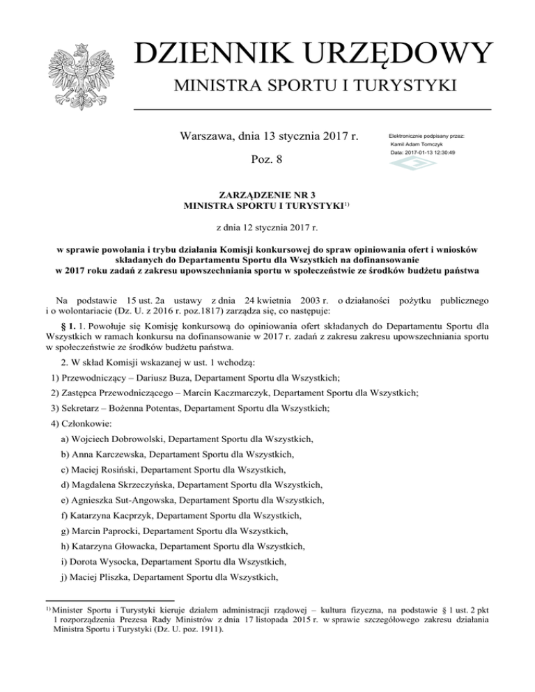 DZIENNIK URZĘDOWY MINISTRA SPORTU I TURYSTYKI Warszawa, dnia 13 stycznia 2017 r. Elektronicznie podpisany przez: Kamil Adam Tomczyk Poz. 8 Data: 2017-01-13 12:30:49 ZARZĄDZENIE NR 3 MINISTRA SPORTU I TURYSTYKI1) z dnia 12 stycznia 2017 r. w sprawie powołania i trybu działania Komisji konkursowej do spraw opiniowania ofert i wniosków składanych do Departamentu Sportu dla Wszystkich na dofinansowanie w 2017 roku zadań z zakresu upowszechniania sportu w społeczeństwie ze środków budżetu państwa Na podstawie 15 ust. 2a ustawy z dnia 24 kwietnia 2003 r. o działaności pożytku publicznego i o wolontariacie (Dz. U. z 2016 r. poz.1817) zarządza się, co następuje: § 1. 1. Powołuje się Komisję konkursową do opiniowania ofert składanych do Departamentu Sportu dla Wszystkich w ramach konkursu na dofinansowanie w 2017 r. zadań z zakresu zakresu upowszechniania sportu w społeczeństwie ze środków budżetu państwa. 2. W skład Komisji wskazanej w ust. 1 wchodzą: 1) Przewodniczący – Dariusz Buza, Departament Sportu dla Wszystkich; 2) Zastępca Przewodniczącego – Marcin Kaczmarczyk, Departament Sportu dla Wszystkich; 3) Sekretarz – Bożenna Potentas, Departament Sportu dla Wszystkich; 4) Członkowie: a) Wojciech Dobrowolski, Departament Sportu dla Wszystkich, b) Anna Karczewska, Departament Sportu dla Wszystkich, c) Maciej Rosiński, Departament Sportu dla Wszystkich, d) Magdalena Skrzeczyńska, Departament Sportu dla Wszystkich, e) Agnieszka Sut-Angowska, Departament Sportu dla Wszystkich, f) Katarzyna Kacprzyk, Departament Sportu dla Wszystkich, g) Marcin Paprocki, Departament Sportu dla Wszystkich, h) Katarzyna Głowacka, Departament Sportu dla Wszystkich, i) Dorota Wysocka, Departament Sportu dla Wszystkich, j) Maciej Pliszka, Departament Sportu dla Wszystkich, 1) Minister Sportu i Turystyki kieruje działem administracji rządowej – kultura fizyczna, na podstawie § 1 ust. 2 pkt 1 rozporządzenia Prezesa Rady Ministrów z dnia 17 listopada 2015 r. w sprawie szczegółowego zakresu działania Ministra Sportu i Turystyki (Dz. U. poz. 1911). Dziennik Urzędowy Ministra Sportu i Turystyki –2– Poz. 8 _______________________________________________________________________________________________________________ k) Marian Sypniewski, Polski Komitet Olimpijski. 3. Komisja ulega rozwiązaniu z końcem 2017 r. 4. Komisja wskazana w ust. 1 prowadzi postępowanie konkursowej”, stanowiącym załącznik Nr 1 do zarządzenia. zgodnie z „Regulaminem prac Komisji 5. Wzór „Protokołu oceny oferty” z zakresu upowszechniania sportu w społeczeństwie ze środków budżetu państwa stanowi załącznik Nr 2 do zarządzenia. § 2. Zarządzenie wchodzi w życie z dniem następującym po dniu ogłoszenia. Minister Sportu i Turystyki Witold Bańka Dziennik Urzędowy Ministra Sportu i Turystyki –3– Poz. 8 _______________________________________________________________________________________________________________ Załącznik Nr 1 do Zarządzenia Nr 3 Ministra Sportu i Turystyki z dnia 12 stycznia 2017 r. Regulamin prac Komisji konkursowej § 1. 1. Komisja oceniająca, zwana dalej „Komisją”, obraduje na posiedzeniach zamkniętych. 2. Posiedzenia Komisji prowadzi Przewodniczący lub Zastępca Przewodniczącego, a w przypadku ich nieobecności, wyznaczony przez Przewodniczącego członek Komisji. 3. Sekretarz Komisji nadzoruje prowadzenie dokumentacji z prac Komisji. Po zakończeniu prac Komisji, sekretarz przekazuje dokumentację do Departamentu Sportu dla Wszystkich. 4. Obsługę administracyjną Komisji zapewnia Departament Sportu dla Wszystkich. § 2. 1. Komisja opracowuje propozycje dofinansowania zadań w 2017 r. dotyczących sportu dla wszystkich w ramach upowszechniania sportu w społeczeństwie, dofinansowanych ze środków budżetu państwa, w formie protokołu zbiorczego. 2. Propozycja dofinansowania, o której mowa w ust. 1 przygotowywana jest przez Komisję na podstawie pozytywnych - pod względem formalnym i merytorycznym – protokołów oceny ofert sporządzonych przez członków Komisji. 3. Oferty niespełniające wymogów formalnych nie podlegają ocenie merytorycznej. 4. Protokół oceny oferty jest sporządzany z uwzględnieniem przyjętych kryteriów merytorycznych i wartości punktowych. Maksymalna suma wynosi 100 punktów. 5. Zaopiniowana pozytywnie pod względem merytorycznym jest oferta, która otrzymała w protokole oceny oferty co najmniej 60 punktów. 6. Komisja opracowuje propozycje dofinansowania uwzględniając wysokość środków budżetu państwa przeznaczonych na realizację ww. zadania, kierując się w szczególności oceną zawartą w protokole oceny oferty oraz priorytetami i kryteriami ogłoszonego konkursu. 7. Komisja podejmuje decyzję dotyczącą propozycji dofinansowania zwykłą większością głosów, w obecności co najmniej 5 członków Komisji. § 3. 1. Komisja oceniająca przekazuje protokół zbiorczy do Departamentu Ekonomiczno-Finansowego w celu potwierdzenia posiadanych środków finansowych nie później niż 7 dni od daty posiedzenia Komisji. 2. W przypadku przekroczenia stanu dostępnych środków finansowych, Departament Ekonomiczno Finansowy informuje o tym Departament Sportu dla Wszystkich oraz zwraca protokół zbiorczy celem ponownego rozpatrzenia i dokonania ewentualnej korekty. 3. Departament Ekonomiczno-Finansowy, po potwierdzeniu posiadanych środków finansowych, przekazuje protokół zbiorczy Ministrowi Sportu i Turystyki, w terminie 7 dni od daty jego otrzymania. 4. Ostatecznego rozstrzygnięcia konkursu dokonuje Minister Sportu i Turystyki. Stanowi to podstawę do zawarcia umowy z wybranym podmiotem, zgodnie z zatwierdzonym protokołem zbiorczym. § 4. Wyniki konkursu, wraz z informacją o przeznaczeniu i wysokości kwoty przyznanej dotacji zamieszcza się w Biuletynie Informacji Publicznej Ministerstwa Sportu i Turystyki bip.msit.gov.pl, w siedzibie Ministerstwa Sportu i Turystyki na tablicy og