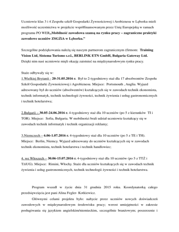 Uczniowie klas 3 i 4 Zespołu szkół Gospodarki Żywnościowej i Arobiznesu w Lęborku mieli możliwość uczestnictwa w projekcie współfinansowanym przez Unię Europejską w ramach programu PO WER„Mobilność zawodowa szansą na rynku pracy – zagraniczne praktyki zawodowe uczniów ZSGŻiA w Lęborku.” Szczególne podziękowania należą się naszym partnerom zagranicznym (firmom: Training Vision Ltd, Sistema Turismo s.r.l., BERLINK ETN GmbH, Bulgaria Gateway Ltd. Dzięki nim nasi uczniowie mięli okazję zaistnieć na międzynarodowym rynku pracy. Staże odbywały się w: 1.Wielkiej Brytanii - 20-31.05.2016 r. Był to 2-tygodniowy staż dla 17 absolwentów Zespołu Szkół Gospodarki Żywnościowej i Agrobiznesu. Miejsce: Portsmouth , Anglia. Wyjazd adresowany był do uczniów (absolwentów) kształcących się w zawodach technik ekonomista, technik informatyk, technik technologii żywności, technik żywienia i usług gastronomicznych i technik hotelarstwa; 2.Bułgarii – 30.05-24.06.2016 r. 4-tygodniowy staż dla 10 uczniów (po 5 z kierunków TI i TOR). Miejsce: Sofia, Bułgaria. W mobilności brali udział uczniowie kształcący się w zawodach technik informatyk i technik organizacji reklamy; 3.Niemczech – 6.06-1.07.2016 r. 4-tygodniowy staż dla 10 uczniów (po 5 z TE i TH). Miejsce: Berlin, Niemcy. Wyjazd adresowany do uczniów kształcących się w zawodach technik ekonomista, technik hotelarstwa i technik handlowiec; 4. we Włoszech – 30.06-15.07.2016 r. 4-tygodniowy staż dla 10 uczniów (po 5 z TTŻ i TżiUG). Miejsce: Rimini, Włochy. Staże dla uczniów kształcących się w zawodach technik żywienia i usług gastronomicznych, technik technologii żywności i technik hotelarstwa. Program wszedł w życie dnia 31 grudnia 2015 roku. Koordynatorką całego przedsięwzięcia jest pani Alina Fegler- Kotkiewicz. Głównymi celami projektu było: nabycie przez uczniów nowych doświadczeń zawodowych w międzynarodowym środowisku pracy; wzrost umiejętności w zakresie posługiwania się językiem angielskim/niemieckim, szczególnie branżowym; poszerzenie i pogłębienie wiedzy teoretycznej uzyskanej w szkole. Równie ważne były także: wzrost motywacji do nauki oraz swoboda poruszania się po rynku pracy. W ramach projektu wsparcie otrzymało 47 uczniów kształcących się w zawodach technik hotelarstwa, technik handlowiec, technik organizacji reklamy, technik technologii żywności, technik ekonomista, technik żywienia i usług gastronomicznych i technik informatyk. Kolejne 30 osób będzie miało okazję wyjechać na praktyki zagraniczne w bieżącym roku szkolnym. Uczniowie, którzy zostali zaakceptowaniu do projektu, zdobyli doświadczenie, dzięki któremu będą doskonale przygotowani do pracy w zawodzie, który wybrali i będą w stanie wpisać się w zmieniające się potrzeby rynku pracy. W projekcie główny nacisk położono na doskonalenie nauki języków obcych. Dzięki wyjazdom zagranicznym uczniowie nabierają pewności siebie, swobody w posługiwaniu się językiem angielskim/niemieckim. Poprzez bezpośredni kontakt z pracodawcami oraz obcojęzycznymi rówieśnikami poszerzają swoje horyzonty, otwierają się na nowe możliwości oraz uczą odpowiedzialności. Warto podkreślić, również, iż taki wyjazd uczy kluczowych umiejętności, m. in. jak zaplanować czas, jak racjonalnie wydawać pieniądze oraz w jaki sposób reagować na stresujące sytuacje. Ważna jest tu tez umiejętność pracy w grupie, reagowania na niespodziewane sytuacje oraz odnajdywania się w nowych sytuacjach. Podczas całego pobytu nad grupą wyjeżdżających czuwał opiekun – nauczyciel Zespołu Szkół Gospodarki Żywnościowej i Agrobiznesu oraz mentor (opiekun zagraniczny) ściśle współpracujący z partnerem organizującym praktyki zawodowe. Zgodnie z wcześniejszymi ustaleniami, uczniowie pracowali 8 godzin dziennie. Przysługiwały im 2 wolne dni w tygodniu. W ramach przyznanych środków uczestnicy projektu mieli zagwarantowane: bezpłatne zajęcia przygotowujące do udziału w projekcie, zajęcia językowe, kulturowe, pedagogiczne oraz szkolenie BHP. Prócz tego, transport zagraniczny, noclegi, kieszonkowe na wyżywienie i bilet miesięczny na komunikację miejską, ubezpieczenie, zwiedzanie miasta, w którym przebywali oraz najbliższych okolic, opiekę ze strony szkoły i instytucji przyjmującej. Każda z grup biorących udział w wymianie miała też zagwarantowana jedną długą wycieczkę, która pozwoliła na dokładniejsze poznanie kultury i zabytków konkretnego kraju. Po powrocie z praktyk, wszyscy uczniowie jednogłośnie stwierdzili, że była to wyprawa ich życia. Staże zagraniczne realizowane były w ramach praktyk zawodowych zgodnych ze szkolnym programem nauczania. Po zakończeniu praktyk uczestnicy projektu otrzymali: • Zaświadczenie o ukończeniu stażu zagranicznego, tzw. Certyfikat praktyki zawodowej Firmy: wystawiony przez firmę goszczącą. • Certyfikat praktyki zawodowej - wystawiony na koniec programu każdemu uczestnikowi przez naszych partnerów - firmy pośredniczące. • Europass Mobility. Uczniowie Zespołu Szkół Gospodarki Żywnościowej i Agrobiznesu w Lęborku świetnie wywiązali się z powierzonych im zadań. Kilkoro z nich dostało propozycję stałej pracy w miejscu odbywania praktyk. Jeden absolwent zdecydował się na podjęcie wyzwania i kilka dni temu rozpoczął pracę w firmie, w której odbywał staż zagraniczny. Wszystkim uczestnikom projektu życzymy powodzenia i wielu sukcesów w życiu zawodowym! Wyjazd na staże zagraniczne jest w pełni bezpłatny, a wszelkie koszty zostały pokryte z funduszy uzyskanych z Unii Europejskiej.