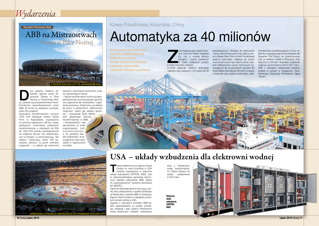 Wydarzenia Korea Południowa, Kolumbia, Chiny Republika Południowej Afryki ABB na Mistrzostwach Świata w Piłce Nożnej Automatyka za 40 milionów W pierwszym kwartale tego roku firma ABB podpisała kontrakt o wartości 40 mln dolarów na dostawę systemów automatyki i elektryki dźwigów portowych. Z leceniodawcą jest spółka Shanghai Zhenhua Heavy Industries Co. Ltd., a umowa dotyczy dźwigów i suwnic portowych w trzech potężnych portach w Korei, Kolumbii i Chinach. Kontrakt obejmuje: systemy automatyki i elektryki oraz związane z nimi prace dla 38 bezobsługowych dźwigów do stertowania i ośmiu suwnic bramowych typu ship-to-shore w Busan New Port w Korei Południowej; systemy automatyki i elektryki dla dwóch suwnic bramowych typu ship-to-shore i czterech elektrycznych suwnic bramowych poruszających się na gumowych oponach dla Santa Marta International Terminal Company w Kolumbii oraz systemy automatyki i elek- tryki dla trzech przeładowujących 2,5 tys. ton ładunku na godzinę ogromnych dźwigów dla Tangshan Port Group, do rozładowywania rudy ze statków i barek w Shougang Jingtang Port w Chinach. Wszystkie urządzenia mają być uruchomione w 2010 i 2011 roku. ABB z sukcesem zrealizowała podobne projekty w portach w Singapurze, Tokio, Hamburgu, Kaohsiung, Rotterdamie, Tajpej i Busan. Stadion Soccer City w Johannesburgu D Fot. na kolumnach: Arch. ABB; 2010 World Cup -Shine 2010, Goldorak, René C. Nielsen, Warren Rohner/ Wikimedia Commons wa potężne stadiony piłkarskie, główne areny Mistrzostw Świata w Piłce Nożnej w Południowej Afryce, zasilane są za pośrednictwem transformatorów wyprodukowanych przez ABB. W sumie na obiektach zainstalowano 26 urządzeń. Dwanaście transformatorów suchych 1200 kVA obsługuje stadion Green Point w Kapsztadzie, wyposażony w ruchome zadaszenie i 68 tys. miejsc siedzących. Czternaście podobnych transformatorów o zakresach od 500 do 1000 kVA zostało zainstalowanych na stadionie Soccer City zlokalizowanym w Soweto, w Johannesburgu. Ten stadion, mieszczący około 100 tys. widzów, wybrano na punkt centralny rozgrywek – tu odbyła się ceremonia otwarcia i zamknięcia mistrzostw, a także najważniejsze mecze. – Nasze transformatory suche są zaprojektowane tak, by stwarzały jak najmniejsze zagrożenie dla środowiska i zagrożenie pożarowe. Dzięki temu są idealne do pracy w publicznych, zatłoczonych miejscach, takich jak obiekty sportowe – powiedział Tarak Mehta, szef globalnego biznesu transformatorów w ABB. – Niezawodność i bezpieczeństwo to znaki rozpoznawcze tych t r a n s f o r m a t o r ó w, a my jesteśmy bardzo zadowoleni, że te urządzenia miały swój udział w tegorocznym mundialu. USA – układy wzbudzenia dla elektrowni wodnej T Ceremonia otwarcia mistrzostw na stadionie Soccer City 10 Dzisiaj Lipiec 2010 rzecia elektrownia na zaporze Grand Coulee na rzece Kolumbia w USA zostanie wyposażona w statyczne układy wzbudzenia UNITROL 6800. Jest to najnowocześniejsza generacja statycznych układów wzbudzenia ABB, oparta na wysokosprawnym systemie sterowania AC 800PEC. Ogromne doświadczenie to kluczowy czynnik, który zadecydował, iż spółka US Bureau of Reclamation wybrała ABB na dostawcę. Zapora Grand Coulee to największy producent energii wodnej w USA. Zgodnie z warunkami kontraktu ABB będzie odpowiedzialna za projekt, produkcję, instalację i testy sześciu chłodzonych wodą statycznych układów wzbudzenia wraz z chłodzonymi wodą transformatorami. Całość dostaw ma zostać zrealizowana w 2013 roku. Statyczny układ wzbudzenia UNITROL 6800 Lipiec 2010 Dzisiaj 11