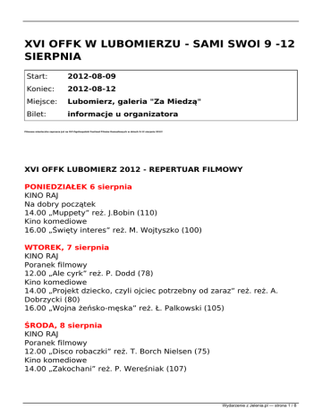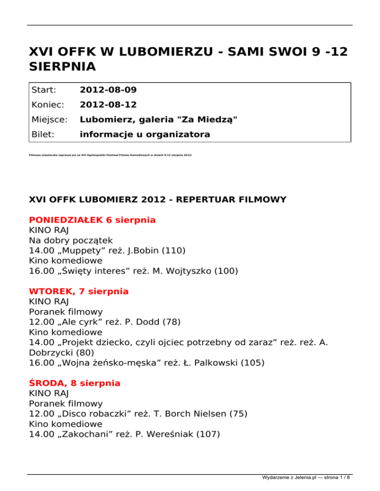 XVI OFFK W LUBOMIERZU - SAMI SWOI 9 -12 SIERPNIA Start: 2012-08-09 Koniec: 2012-08-12 Miejsce: Lubomierz, galeria "Za Miedzą" Bilet: informacje u organizatora Filmowe miasteczko zaprasza już na XVI Ogólnopolski Festiwal Filmów Komediowych w dniach 9-12 sierpnia 2012! XVI OFFK LUBOMIERZ 2012 - REPERTUAR FILMOWY PONIEDZIAŁEK 6 sierpnia KINO RAJ Na dobry początek 14.00 „Muppety” reż. J.Bobin (110) Kino komediowe 16.00 „Święty interes” reż. M. Wojtyszko (100) WTOREK, 7 sierpnia KINO RAJ Poranek filmowy 12.00 „Ale cyrk” reż. P. Dodd (78) Kino komediowe 14.00 „Projekt dziecko, czyli ojciec potrzebny od zaraz” reż. reż. A. Dobrzycki (80) 16.00 „Wojna żeńsko-męska” reż. Ł. Palkowski (105) ŚRODA, 8 sierpnia KINO RAJ Poranek filmowy 12.00 „Disco robaczki” reż. T. Borch Nielsen (75) Kino komediowe 14.00 „Zakochani” reż. P. Wereśniak (107) Wydarzenie z Jelenia.pl — strona 1 / 8 16.00 „Los numeros” reż. R. Zatorski (80) 18.00 „Och Karol 2” reż. P. Wereśniak (105) CZWARTEK, 9 sierpnia KINO RAJ Poranek filmowy 10.00 „Mniam” reż. Aun Hoe Goh (93) Przegląd filmów konkursowych 12.00 „Listy do M” reż. M. Okorn (120) 14.15 „Wyręczony - zaręczony” reż. P. Matwiejczyk (90) 16.30 „Pokaż kotku co masz w środku” reż. S. Kryński (93) Kino komediowe 18.00 „Złoto dezerterów” reż. J. Majewski (87) 19.30 „Jak się pozbyć cellulitu” reż. A. Saramonowicz (111) Kino pod gwiazdami ok. 23.15 „Sami swoi” reż. S. Chęciński (78) PIĄTEK, 10 sierpnia KINO RAJ Poranek filmowy 10.00 „Gnomeo i Julia” reż. K. Asbury, W. Paszkowski (80) Przegląd filmów konkursowych 12.00 „Kop głębiej” reż. K. Szołajski (86) 14.30 „Sztos 2” reż. O. Lubaszenko (99) Kino komediowe 16.15 "Milczenie jest złotem" reż. E. Pytka (98) 18.00 „Zgorszenie publiczne” reż. M. Pyrkowski (86) 19.45 „Milion dolarów” reż. J. Kondratiuk (107) Kino pod gwiazdami ok. 23.30 „Śniadanie do łóżka” reż. K. Lang (85) – ZŁOTY GRANAT 2011 OŁTARZ KINA - GALERIA ZA MIEDZĄ 21.00 Pokaz nagrodzonych filmów ZAWLECZKA 2011 „Wszystko” reż. I. Kondefer - Złota Zawleczka 2011 „Drżące Trąby” reż. N. Brożyńska – Srebrna Zawleczka 2011 i Zawleczka Publiczności „ MC. Człowiek z winylu” reż. B. Warwas – Brązowa Zawleczka 2011 „Lord Vader na emeryturze” reż. M. Paszczyk – Brązowa Zawleczka 2011 22.00 Kino nocne - pokaz specjalny: „80 milionów” reż. W. Krzystek Wydarzenie z Jelenia.pl — strona 2 / 8 (105) 23.50 Konkurs Śmiesznego Kina Niezależnego ZAWLECZKA 2012 - I blok filmów konkursowych od 2.00 Kino dla wytrwałych - Pokaz filmów nagrodzonych w konkursie GRAND OFF 2011 - I blok SOBOTA, 11 sierpnia KINO RAJ Poranek filmowy 10.00 „Latająca maszyna” reż. M. Clapp (76) Przegląd filmów konkursowych 12.00 „Twoja stara. Baśń” reż. Ł. Jedynasty (82) 14.30 „Baby są jakieś inne” reż. M. Koterski (90) 16.15 „Święta krowa” reż. J. Węgrzyn (90) Kino komediowe 18.00 „Śluby panieńskie” reż. F. Bajon (100) 20.00 „Weekend” reż. C. Pazura (120) Kino pod gwiazdami ok. 23.30 „Kołysanka” reż. J. Machulski (95) - GRANATOWY I SREBRNY GRANAT 2011 OŁTARZ KINA - GALERIA ZA MIEDZĄ 21.11 Kino nocne - pokaz specjalny: „Wszystkie kobiety Mateusza” reż. A. „Baron” Więcek (104) 23.11 Konkurs Śmiesznego Kina Niezależnego ZAWLECZKA 2012 - II blok filmów konkursowych ok. 1.00 Kino nocne – pokaz specjalny: „Zakład” reż. Teresa Kotlarczyk (110) NIEDZIELA, 12 sierpnia KINO RAJ Poranek filmowy 10.00 „Auta 2” reż. B. Lewis, J. Lasseter (102) Przegląd filmów konkursowych 12.00 „Niebo” reż. P. Sarbinowski, P. Żukowski (71) 14.30 „Wyjazd integracyjny” reż. P. Angerman (85) Kino komediowe 16.15 „Rzeź” reż. R. Polański (89) 18.00 „Wino truskawkowe” reż. D. Jabłoński (118) 20.15 „Statyści” reż. M. Kwieciński (118) Wydarzenie z Jelenia.pl — strona 3 / 8 Kino pod gwiazdami ok. 23.00 Film - zdobywca Złotego Granatu 2012 OŁTARZ KINA - GALERIA ZA MIEDZĄ 21.11 Konkurs Śmiesznego Kina Niezależnego ZAWLECZKA 2012 Pokaz nagrodzonych filmów ok. 22.11 Kino nocne - pokazy specjalne: „Bandyta” reż. M. Dejczer (90) ok. 23.45 Kino dla wytrwałych - Pokaz filmów nagrodzonych w konkursie GRAND OFF 2011 - II blok Uwaga! Organizatorzy zastrzegają sobie prawo do zmian w programie. W przypadku złej pogody nocne projekcje z kina pod gwiazdami przeniesone zostaną do festiwalowego Kina Raj. Bilety na projekcje filmów do nabycia przed seansami. XVI OFFK Lubomierz 2012 - PROGRAM WYDARZEŃ CZWARTEK - 9 sierpnia 12.10 Inauguracja Festiwalu - rozpoczęcie projekcji konkursowych festiwalowe Kino RAJ 19.11 Otwarcie wystawy fotografii Jarosława Sosińskiego z planu zdjęciowego filmu “80 milionów” - Galeria Za Miedzą 20.11 Koncert DesOrient - Filmowo, etnicznie, poważnie, niepoważnie (Galeria Za Miedzą) 22.00 Swojska Zabawa Pod Kasztanami z zespołem Comentic 23.15 Kino pod gwiazdami: “Sami Swoi” reż. S. Chęciński PIĄTEK - 10 sierpnia 14.30 - 16.00 Blok koncertów amatorskich: Skauci z Nielestna, Kargulinki z Lubomierza, Comentic z Wlenia 17.00 Spotkania twórców kina (Galeria Za Miedzą) 18.00 Koncert Nocne Boogie 19.11 Koncert muzyki filmowej MICHAŁA LORENCA w wykonaniu Orkiestry Symfonicznej Filharmonii Dolnośląskiej pod dyrekcją Tadeusza Karolaka z udziałem muzyków zespołu DesOrient. W programie m.in. muzyka z filmów: „Bandyta”, „Zakochani”, „Ojciec Mateusz”, „Śluby panieńskie” , „Zabić Sekala”, „Różyczka”, „Jan Paweł II. Szukałem was” (Kościół p.w. WNMP i św. Maternusa) 21.00 Parada Komediantów z Orkiestrą Reprezentacyjną Miasta i Wydarzenie z Jelenia.pl — strona 4 / 8 Gminy Olszyna 21.30 Ceremonia otwarcia Festiwalu 22.00 Koncert OBSTAWA PREZYDENTA 23.30 Kino pod gwiazdami: “Śniadanie do łóżka” reż. K. Lang - Złoty Granat 2011 SOBOTA - 11 sierpnia 12.