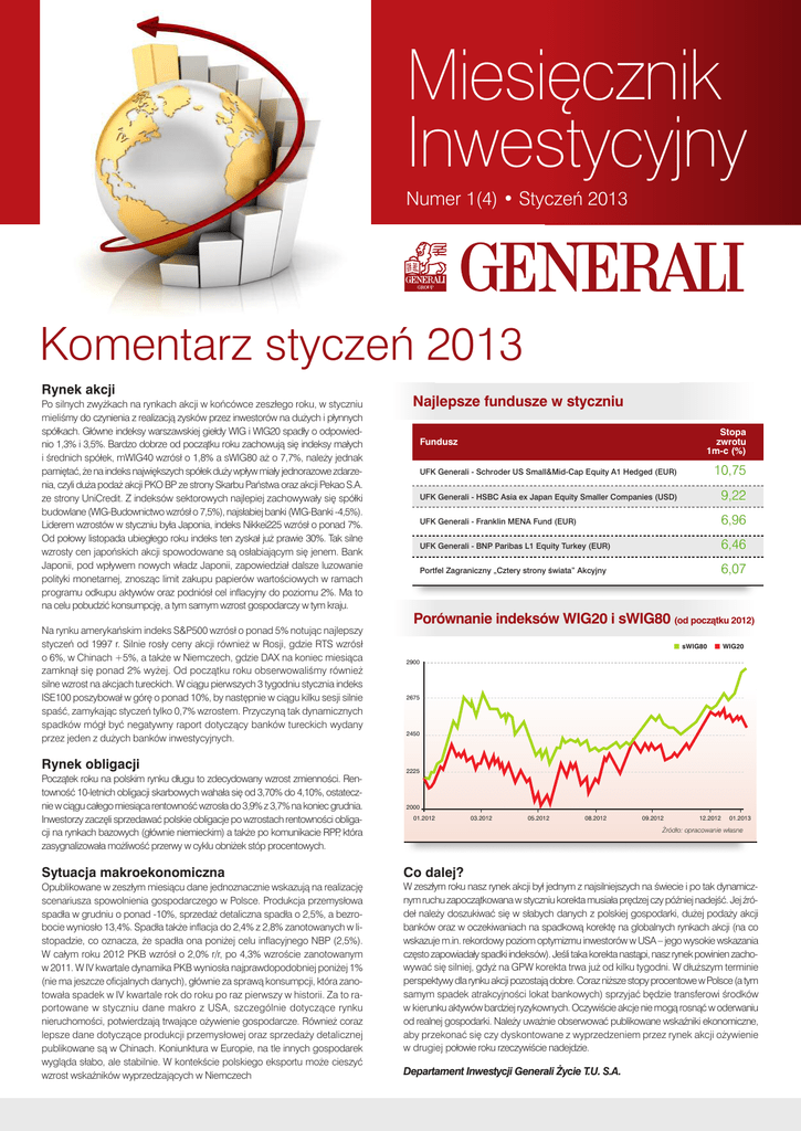 Miesi´cznik Inwestycyjny Numer 1(4) • Styczeƒ 2013 Komentarz styczeƒ 2013 Rynek akcji Po silnych zwy˝kach na rynkach akcji w koƒcówce zeszłego roku, w styczniu mieliÊmy do czynienia z realizacjà zysków przez inwestorów na du˝ych i płynnych spółkach. Główne indeksy warszawskiej giełdy WIG i WIG20 spadły o odpowiednio 1,3% i 3,5%. Bardzo dobrze od poczàtku roku zachowujà si´ indeksy małych i Êrednich spółek, mWIG40 wzrósł o 1,8% a sWIG80 a˝ o 7,7%, nale˝y jednak pami´taç, ˝e na indeks najwi´kszych spółek du˝y wpływ miały jednorazowe zdarzenia, czyli du˝a poda˝ akcji PKO BP ze strony Skarbu Paƒstwa oraz akcji Pekao S.A. ze strony UniCredit. Z indeksów sektorowych najlepiej zachowywały si´ spółki budowlane (WIG-Budownictwo wzrósł o 7,5%), najsłabiej banki (WIG-Banki -4,5%). Liderem wzrostów w styczniu była Japonia, indeks Nikkei225 wzrósł o ponad 7%. Od połowy listopada ubiegłego roku indeks ten zyskał ju˝ prawie 30%. Tak silne wzrosty cen japoƒskich akcji spowodowane sà osłabiajàcym si´ jenem. Bank Japonii, pod wpływem nowych władz Japonii, zapowiedział dalsze luzowanie polityki monetarnej, znoszàc limit zakupu papierów wartoÊciowych w ramach programu odkupu aktywów oraz podniósł cel inflacyjny do poziomu 2%. Ma to na celu pobudziç konsumpcj´, a tym samym wzrost gospodarczy w tym kraju. Na rynku amerykaƒskim indeks S&P500 wzrósł o ponad 5% notujàc najlepszy styczeƒ od 1997 r. Silnie rosły ceny akcji równie˝ w Rosji, gdzie RTS wzrósł o 6%, w Chinach +5%, a tak˝e w Niemczech, gdzie DAX na koniec miesiàca zamknàł si´ ponad 2% wy˝ej. Od poczàtku roku obserwowaliÊmy równie˝ silne wzrost na akcjach tureckich. W ciàgu pierwszych 3 tygodniu stycznia indeks ISE100 poszybował w gór´ o ponad 10%, by nast´pnie w ciàgu kilku sesji silnie spaÊç, zamykajàc styczeƒ tylko 0,7% wzrostem. Przyczynà tak dynamicznych spadków mógł byç negatywny raport dotyczàcy banków tureckich wydany przez jeden z du˝ych banków inwestycyjnych. Rynek obligacji Poczàtek roku na polskim rynku długu to zdecydowany wzrost zmiennoÊci. RentownoÊç 10-letnich obligacji skarbowych wahała si´ od 3,70% do 4,10%, ostatecznie w ciàgu całego miesiàca rentownoÊç wzrosła do 3,9% z 3,7% na koniec grudnia. Inwestorzy zacz´li sprzedawaç polskie obligacje po wzrostach rentownoÊci obligacji na rynkach bazowych (głównie niemieckim) a tak˝e po komunikacie RPP, która zasygnalizowała mo˝liwoÊç przerwy w cyklu obni˝ek stóp procentowych. Najlepsze fundusze w styczniu Stopa zwrotu 1m-c (%) Fundusz UFK Generali - Schroder US Small&Mid-Cap Equity A1 Hedged (EUR) 10,75 UFK Generali - HSBC Asia ex Japan Equity Smaller Companies (USD) 9,22 UFK Generali - Franklin MENA Fund (EUR) 6,96 UFK Generali - BNP Paribas L1 Equity Turkey (EUR) 6,46 Portfel Zagraniczny „Cztery strony Êwiata” Akcyjny 6,07 Porównanie indeksów WIG20 i sWIG80 (od poczàtku 2012) n sWIG80 n WIG20 2900 2675 2450 2225 2000 01.2012 03.2012 05.2012 08.2012 09.2012 12.2012 01.2013 ˚ródło: opracowanie własne Sytuacja makroekonomiczna Co dalej? Opublikowane w zeszłym miesiàcu dane jednoznacznie wskazujà na realizacj´ scenariusza spowolnienia gospodarczego w Polsce. Produkcja przemysłowa spadła w grudniu o ponad -10%, sprzeda˝ detaliczna spadła o 2,5%, a bezrobocie wyniosło 13,4%. Spadła tak˝e inflacja do 2,4% z 2,8% zanotowanych w listopadzie, co oznacza, ˝e spadła ona poni˝ej celu inflacyjnego NBP (2,5%). W całym roku 2012 PKB wzrósł o 2,0% r/r, po 4,3% wzroÊcie zanotowanym w 2011. W IV kwartale dynamika PKB wyniosła najprawdopodobniej poni˝ej 1% (nie ma jeszcze oficjalnych danych), głównie za sprawà konsumpcji, która zanotowała spadek w IV kwartale rok do roku po raz pierwszy w historii. Za to raportowane w styczniu dane makro z USA, szczególnie dotyczàce rynku nieruchomoÊci, potwierdzajà trwajàce o˝ywienie gospodarcze. Równie˝ coraz lepsze dane dotyczàce produkcji przemysłowej oraz sprzeda˝y detalicznej publikowane sà w Chinach. Koniunktura w Europie, na tle innych gospodarek wyglàda słabo, ale stabilnie. W kontekÊcie polskiego eksportu mo˝e cieszyç wzrost wskaêników wyprzedzajàcych w Niemczech W zeszłym roku nasz rynek akcji był jednym z najsilniejszych na Êwiecie i po tak dynamicznym ruchu zapoczàtkowana w styczniu korekta musiała pr´dzej czy póêniej nadejÊç. Jej êródeł nale˝y doszukiwaç si´ w słabych danych z polskiej gospodarki, du˝ej poda˝y akcji banków oraz w oczekiwaniach na spadkowà korekt´ na globalnych rynkach akcji (na co wskazuje m.in. rekordowy poziom optymizmu inwestorów w USA – jego wysokie wskazania cz´sto zapowiadały spadki indeksów). JeÊli taka korekta nastàpi, nasz rynek powinien zachowywaç si´ silniej, gdy˝ na GPW korekta trwa ju˝ od kilku tygodni. W dłu˝szym terminie perspektywy dla rynku akcji pozostajà dobre. Coraz ni˝sze stopy procentowe w Polsce (a tym samym spadek atrakcyjnoÊci lokat bankowych) sprzyjaç b´dzie transferowi Êrodków w kierunku aktywów bardziej ryzykownych. OczywiÊcie akcje nie mogà rosnàç w oderwaniu od realnej gospodarki. Nale˝y uwa˝nie obserwowaç publikowane wskaêniki ekonomiczne, aby przekonaç si´ czy dyskontowane z wyprzedzeniem przez rynek akcji o˝ywienie w drugiej połowie roku rzeczywiÊcie nadejdzie. Departament Inwestycji Generali ˚ycie T.U. S.A. Wyniki ubezpieczeniowych funduszy kapitałowych WartoÊç jednostki z dnia: 31.01.2013 WartoÊç jednostki (PLN) 1-mies. zmiana (%) 3-mies. zmiana (%) Fundusz Agresywny 29,131 -0,48 6,49 Fundusz Agresywny Emerytalny 25,880 -0,59 6,16 Fundusz Emerytalny Generali Agresywny 25,880 -0,59 6,16 Fundusz Generali Agresywny 15,909 -0,50 6,43 UFK Generali Agresywny Plus 15,909 -0,50 6,43 UFK Generali - Alior Aktywnej Selekcji 93,790 3,01 4,91 5,11 -1,84 - - UFK Generali - Alior Short Equity 82,640 3,48 -7,35 -15,49 -12,33 - - UFK Generali - Arka BZ WBK Akcji 33,530 0,42