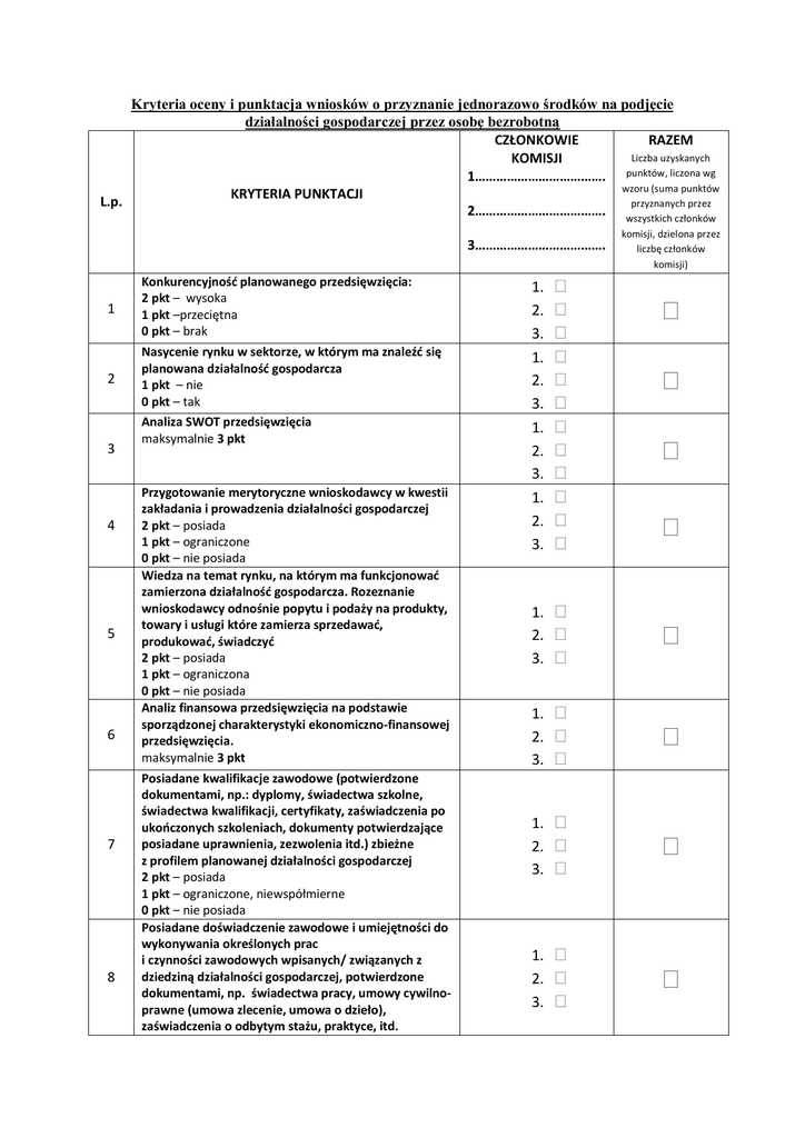 Kryteria oceny i punktacja wniosków o przyznanie jednorazowo środków na podjęcie działalności gospodarczej przez osobę bezrobotną CZŁONKOWIE RAZEM Liczba uzyskanych KOMISJI punktów, liczona wg 1………………………………. wzoru (suma punktów KRYTERIA PUNKTACJI L.p. przyznanych przez 2………………………………. wszystkich członków 3………………………………. 1 2 3 4 5 6 7 8 Konkurencyjność planowanego przedsięwzięcia: 2 pkt – wysoka 1 pkt –przeciętna 0 pkt – brak Nasycenie rynku w sektorze, w którym ma znaleźć się planowana działalność gospodarcza 1 pkt – nie 0 pkt – tak Analiza SWOT przedsięwzięcia maksymalnie 3 pkt Przygotowanie merytoryczne wnioskodawcy w kwestii zakładania i prowadzenia działalności gospodarczej 2 pkt – posiada 1 pkt – ograniczone 0 pkt – nie posiada Wiedza na temat rynku, na którym ma funkcjonować zamierzona działalność gospodarcza. Rozeznanie wnioskodawcy odnośnie popytu i podaży na produkty, towary i usługi które zamierza sprzedawać, produkować, świadczyć 2 pkt – posiada 1 pkt – ograniczona 0 pkt – nie posiada Analiz finansowa przedsięwzięcia na podstawie sporządzonej charakterystyki ekonomiczno-finansowej przedsięwzięcia. maksymalnie 3 pkt Posiadane kwalifikacje zawodowe (potwierdzone dokumentami, np.: dyplomy, świadectwa szkolne, świadectwa kwalifikacji, certyfikaty, zaświadczenia po ukończonych szkoleniach, dokumenty potwierdzające posiadane uprawnienia, zezwolenia itd.) zbieżne z profilem planowanej działalności gospodarczej 2 pkt – posiada 1 pkt – ograniczone, niewspółmierne 0 pkt – nie posiada Posiadane doświadczenie zawodowe i umiejętności do wykonywania określonych prac i czynności zawodowych wpisanych/ związanych z dziedziną działalności gospodarczej, potwierdzone dokumentami, np. świadectwa pracy, umowy cywilnoprawne (umowa zlecenie, umowa o dzieło), zaświadczenia o odbytym stażu, praktyce, itd. 1. 2. 3. 1. 2. 3. 1. 2. 3. 1. 2. 3. 1. 2. 3. 1. 2. 3. 1. 2. 3. 1. 2. 3. komisji, dzielona przez liczbę członków komisji) 9 10 11 12 2 pkt – posiada 1 pkt – ograniczone 0 pkt – nie posiada Potwierdzone wstępne ustalenia z potencjalnymi odbiorcami/dostawcami w postaci m.in. wstępnych zamówień, umów, deklaracji współpracy itp. 1 pkt – posiada 0 pkt – nie posiada Udział środków własnych w przedsięwzięciu 3 pkt - powyżej 61 % środków własnych; 2 pkt - powyżej 31% do 60 % środków własnych; 1 pkt - do 30 % środków własnych; 0 pkt - brak środków własnych. Ocena założonej działalności z uwzględnieniem przewidywanego zatrudnienia całościowa obiektywna ocena komisji dotycząca zakładanej działalności (popyt i podaż lokalnego rynku na planowaną działalność, pomysł, kalkulacja wydatków na uruchomienie działalności w ramach wnioskowanych środków, przygotowanie wniosku pod względem merytorycznym i formalnym, przewidywane zatrudnienie) - maksymalnie 3 pkt Korzystanie z innych usług i instrumentów rynku pracy (maksymalnie 5 pkt.) Poradnictwo zawodowe, informacja zawodowa, Aktywne poszukiwanie pracy, Szkolenia, Przygotowanie zawodowe dorosłych, Staż, 1. 2. 3. 1. 2. 3. 1. 2. 3. 1. 2. 3. RAZEM MAKSYMALNA LICZBA PUNKTÓW DO UZYSKANIA : 29 MINIMALNA LICZBA PUNKTÓW DO UZYSKANIA, ABY WNIOSEK ZOSTAŁ ROZPATRZONY POZYTYWNIE : 13 1. …………………….……….. podpis członka komisji 2. …………….……………….. podpis członka komisji 3. ……………………….…….. podpis członka komisji OPINIA KOMISJI …………………………………………………………………………………………………………………………………………………………… …………………………………………………………………………………………………………………………………………………………… …………………………………………………………………………………………………………………………………………………………… …………………………………………………………………………………………………………………………………………………………… …………………………………………………………………………………………………………………………………………………………… 1. …………………….……….. podpis członka komisji 2. …………….……………….. 3. ……………………….…….. podpis członka komisji podpis członka komisji