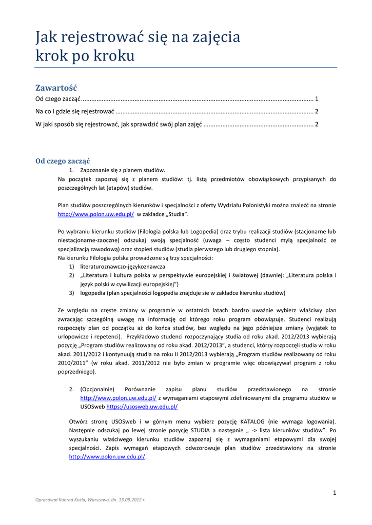 Jak rejestrować się na zajęcia krok po kroku Zawartość Od czego zacząć ....................................................................................................................................... 1 Na co i gdzie się rejestrować ................................................................................................................... 2 W jaki sposób się rejestrować, jak sprawdzić swój plan zajęć ................................................................ 2 Od czego zacząć 1. Zapoznanie się z planem studiów. Na początek zapoznaj się z planem studiów: tj. listą przedmiotów obowiązkowych przypisanych do poszczególnych lat (etapów) studiów. Plan studiów poszczególnych kierunków i specjalności z oferty Wydziału Polonistyki można znaleźć na stronie http://www.polon.uw.edu.pl/ w zakładce „Studia”. Po wybraniu kierunku studiów (Filologia polska lub Logopedia) oraz trybu realizacji studiów (stacjonarne lub niestacjonarne-zaoczne) odszukaj swoją specjalność (uwaga – często studenci mylą specjalność ze specjalizacją zawodową) oraz stopień studiów (studia pierwszego lub drugiego stopnia). Na kierunku Filologia polska prowadzone są trzy specjalności: 1) literaturoznawczo-językoznawcza 2) „Literatura i kultura polska w perspektywie europejskiej i światowej (dawniej: „Literatura polska i język polski w cywilizacji europejskiej”) 3) logopedia (plan specjalności logopedia znajduje sie w zakładce kierunku studiów) Ze względu na częste zmiany w programie w ostatnich latach bardzo uważnie wybierz właściwy plan zwracając szczególną uwagę na informację od którego roku program obowiązuje. Studenci realizują rozpoczęty plan od początku aż do końca studiów, bez względu na jego późniejsze zmiany (wyjątek to urlopowicze i repetenci). Przykładowo studenci rozpoczynający studia od roku akad. 2012/2013 wybierają pozycję „Program studiów realizowany od roku akad. 2012/2013”, a studenci, którzy rozpoczęli studia w roku akad. 2011/2012 i kontynuują studia na roku II 2012/2013 wybierają „Program studiów realizowany od roku 2010/2011” (w roku akad. 2011/2012 nie było zmian w programie więc obowiązywał program z roku poprzedniego). 2. (Opcjonalnie) Porównanie zapisu planu studiów przedstawionego na stronie http://www.polon.uw.edu.pl/ z wymaganiami etapowymi zdefiniowanymi dla programu studiów w USOSweb https://usosweb.uw.edu.pl/ Otwórz stronę USOSweb i w górnym menu wybierz pozycję KATALOG (nie wymaga logowania). Następnie odszukaj po lewej stronie pozycję STUDIA a następnie „ -> lista kierunków studiów”. Po wyszukaniu właściwego kierunku studiów zapoznaj się z wymaganiami etapowymi dla swojej specjalności. Zapis wymagań etapowych odwzorowuje plan studiów przedstawiony na stronie http://www.polon.uw.edu.pl/. 1 Opracował Konrad Kośla, Warszawa, dn. 13.09.2012 r. Na co i gdzie się rejestrować 1. Jakie przedmioty objęte są rejestracją Rejestracja na zajęcia dotyczy wszystkich realizowanych przez ciebie przedmiotów. Chyba, że jesteś studentem I roku studiów pierwszego stopnia. W takim przypadku zostaniesz w okresie do połowy września danego roku przypisany do grupy dziekańskiej z gotowym planem. Samodzielna rejestracja dotyczy w tym przypadku wyłącznie (w różnej ilości dla każdego kierunku i specjalności) przedmiotów ogólnouniwersyteckich, lektoratów i zajęć W-F. 2. Gdzie dokonujemy rejestracji 1) Na zajęcia tzw. wydziałowe (czyli prawie wszystkie planowe zajęcia organizowane przez Wydział Polonistyki) rejestrujesz się za pośrednictwem serwera USOSweb https://usosweb.uw.edu.pl/. Jeśli jesteś studentem I roku studiów pierwszego stopnia na te zajęcia zostałeś zapisany odgórnie. Za pośrednictwem USOSweb sprawdzasz więc tylko swój plan zajęć (wymagane logowanie). Uwaga – przyporządkowanie studentów I roku pierwszego stopnia do grup dziekańskich to czasochłonna operacja realizowana przez pracowników Sekcji Toku Studiów na przełomie miesięcy sierpnia i września. Do systemu loguj się więc dopiero od drugiego tygodnia września. 2) Na zajęcia ogólnouniwersyteckie tj.: przedmioty ogólnouniwersyteckie (potocznie OGUN), lektoraty j. obcego, W-F, egzaminy certyfikacyjne z j. obcego oraz przedmioty z gr. uprawnień pedagogicznych rejestrujesz się w serwisie rejestracji żetonowej (USOS UL) http://rejestracja.usos.uw.edu.pl/. W jaki sposób się rejestrować, jak sprawdzić swój plan zajęć 1. W jaki sposób się rejestrować Odszukaj przewodnik do rejestracji w serwisie USOSownia: http://usosownia.uw.edu.pl/. USOSweb http://usosownia.uw.edu.pl/sites/default/files/podreczniki/usosweb-rej.pdf USOS UL http://usosownia.uw.edu.pl/sites/default/files/podreczniki/ul-rej-zetonowa.pdf 1) Rejestracja w USOSweb (bezpośrednia do grup) w dużym skrócie: a. sprawdź na stronie http://www2.polon.uw.edu.pl/sts/ harmonogram rejestracji wydziałowej, b. otwórz stronę USOSweb https://usosweb.uw.edu.pl/ i zaloguj się, c. wybierz w górnym menu pozycję DLA STUDENTÓW, d. na ekranie pojawią się do wyboru dwie opcje MOJE STUDIA oraz REJESTRACJE – wybierz pozycję REJESTRACJE, e. na ekranie wyświetlą sie dostępne dla ciebie grupy rejestracyjne. Wybierz grupę rejestracyjną np. „Rejestracja na minimum polonistyczne - spec. literaturoznawczo-język. - stacjonarne i wieczorowe”, f. jeśli rejestracja jest aktywna zarejestruj się (poprzez kliknięcie w koszyk przy nazwie przedmiotu) na wymagane zgodnie z twoim planem studiów przedmioty, g. wyloguj się z systemu, h. sprawdź w następnych dniach (nie później niż przed końcem rejestracji) czy jesteś zapisany na wszystkie wymagane przedmioty, 2) Rejestracja żetonowa w dużym skrócie: a. otwórz stronę (USOS UL) http://rejestracja.usos.uw.edu.pl/ i zaloguj się, b. wybierz w lewym menu pozycję „Harmonogram rejestracji” i zapoznaj się z nim, 2 Opracował Konrad Koś