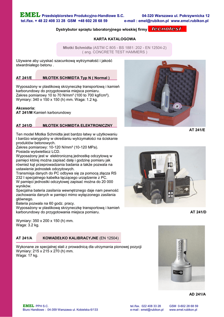 EMEL Przedsiębiorstwo Produkcyjno-Handlowe S.C. tel./fax. + 48 22 408 33 28 GSM +48 602 28 68 59 04-320 Warszawa ul. Pokrzywnicka 12 e-mail : [email protected] www.emel.rubikon.pl Dystrybutor sprzętu laboratoryjnego włoskiej firmy KARTA KATALOGOWA Młotki Schmidta (ASTM C 805 - BS 1881: 202 - EN 12504-2) ( ang. CONCRETE TEST HAMMERS ) Używane aby uzyskać szacunkową wytrzymałość i jakość stwardniałego betonu . AT 241/E MŁOTEK SCHMIDTA Typ N ( Normal ) Wyposażony w plastikową skrzyneczkę transportową i kamień karborundowy do przygotowania miejsca pomiaru. Zakres pomiarowy 10 to 70 N/mm² (100 to 700 kgf/cm²). Wymiary: 340 x 150 x 150 (h) mm. Waga: 1.2 kg. Akcesoria: AT 241/M Kamień karborundowy AT 241/D MŁOTEK SCHMIDTA ELEKTRONICZNY AT 241/E Ten model Młotka Schmidta jest bardzo łatwy w użytkowaniu i bardzo wiarygodny w określaniu wytrzymałości na ściskanie produktów betonowych. Zakres pomiarowy: 10-120 N/mm² (10-120 MPa). Posiada wyświetlacz LCD. Wyposażony jest w elektroniczną jednostkę odczytową w pamięci której można zapisać datę i godzinę pomiaru jak również kąt przeprowadzania badania a także pozwala na ustawienie jednostek odczytowych. Transmisja danych do PC odbywa się za pomocą złącza RS 232 I specjalnego kabelka łączącego urządzenie z PC. W pamięci jednostki odczytowej zapisać można do 20 000 wyników. Specjalna bateria zasilania wewnętrznego daje nam pewność zachowania danych w pamięci mimo wyłączonego zasilania głównego. Bateria pozwala na 60 godz. pracy. Wyposażony w plastikową skrzyneczkę transportową i kamień karborundowy do przygotowania miejsca pomiaru. AT 241/D Wymiary: 350 x 200 x 150 (h) mm. Waga: 3.2 kg. AT 241/A KOWADEŁKO KALIBRACYJNE (EN 12504) Wykonane ze specjalnej stali z prowadnicą dla utrzymania pionowej pozycji Wymiary: 215 x 215 x 270 (h) mm. Waga: 17 kg. AD 241/A EMEL PPH S.C. Biuro Handlowe : 04-359 Warszawa ul. Kobielska 6/133 tel./fax. 022 408 33 28 e-mail : [email protected] GSM 0-602 28 68 59 www.emel.rubikon.pl