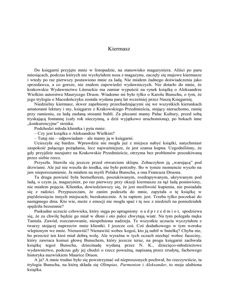 Kiermasz Do księgarni przyjęto mnie w listopadzie, na stanowisko magazyniera. Aliści po paru miesiącach, podczas których nie wychylałem nosa z magazynu, zaczęły się majowe kiermasze i wtedy po raz pierwszy postawiono mnie za ladą. Nie miałem żadnego doświadczenia jako sprzedawca, a co gorsze, nie znałem zapowiedzi wydawniczych. Nie dotarło do mnie, że krakowskie Wydawnictwo Literackie ma zamiar wypuścić na rynek książkę o Aleksandrze Wielkim autorstwa Maurycego Druon. Wiadomo mi było tylko o Karolu Bunschu, o tym, że jego trylogia o Macedończyku została wydana parę lat wcześniej przez Naszą Księgarnię. Niedzielny kiermasz, skwer zapełniony przechadzającymi się we wszystkich kierunkach amatorami lektury i my, księgarze z Krakowskiego Przedmieścia, stojący nieruchomo, ramię przy ramieniu, za ladą zasłaną stosami bubli. Za plecami mamy Pałac Kultury, przed sobą tryskającą fontannę (cały rok nieczynną, a dziś wyjątkowo uruchomioną), po bokach inne „konkurencyjne” stoiska. Podchodzi młoda klientka i pyta mnie: – Czy jest książka o Aleksandrze Wielkim? – Tutaj nie – odpowiadam – ale mamy ją w księgarni. Ucieszyła się bardzo. Wprawdzie nie mogła już z miejsca nabyć książki, natychmiast zaspokoić palącego pożądania, lecz najważniejsze, że jest szansa kupna. Uzgodniliśmy, że gdy przyjdzie nazajutrz na Krakowskie Przedmieście, otrzyma bez problemów poszukiwaną przez siebie rzecz. Przyszła. Stawiła się jeszcze przed otwarciem sklepu. Zobaczyłem ją „warującą” pod drzwiami. Ale już nie weszła do środka, nie było potrzeby. Bo w tymże momencie wyszło na jaw nieporozumienie. Ja miałem na myśli Polaka Bunscha, a ona Francuza Druona. Ta druga powieść była bestsellerem, poszukiwanym, rozdrapywanym, ukrywanym pod ladą, o czym ja, magazynier, po raz pierwszy przy okazji kiermaszu za tąż ladą postawiony, nie miałem pojęcia. Klientka, dowiedziawszy się, że jest możliwość kupienia, nie posiadała się z radości. Przypuszczam, że zanim podeszła do mnie, zapytała o tę książkę w pięćdziesięciu innych miejscach; bezskutecznie. A tu raptem: jest. Trzeba tylko poczekać do następnego dnia. Kto wie, może z emocji nie mogła spać i tę noc z niedzieli na poniedziałek spędziła bezsennie? Paskudne uczucie człowieka, który sięga po upragniony n a d p r z e d m i o t, spodziewa się, że za chwilę będzie go miał w dłoni i oto palce chwytają wiatr. Na tym polegała męka Tantala. Zawód, rozczarowanie, niespełniona nadzieja. Te wszystkie uczucia wyczytałem z twarzy stojącej naprzeciw mnie klientki. I jeszcze coś. Coś dodatkowego w tym wzroku wlepionym we mnie. Nienawiść? Nienawiść wobec kogoś, kto ją nabił w butelkę? Chyba nie, bo przecież ten ktoś miał dobrą wolę. Ale wyraźna w tych oczach niechęć wobec faceciny, który zawraca komuś głowę Bunschem, który jeszcze teraz, na progu księgarni zachwala książkę tegoż Bunscha, dziecinadę wydaną przez N. K., dziecięco-młodzieżowe wydawnictwo, podczas gdy jej chodzi o rzecz poważną, napisaną przez erudytę, fachowego historyka nazwiskiem Maurice Druon. A ja? A mnie trudno było się powstrzymać od nieproszonych pochwał, bo rzeczywiście, ta trylogia Bunscha, na którą składa się Olimpias, Parmenion i Aleksander, to moja ulubiona książka. – Pani to czytała? – zapytałem rozczarowaną kobietę. – Nie wyobrażam sobie lepszego ujęcia tego wszystkiego, co historia przekazała na temat Aleksandra Macedońskiego. Teraz już wiem, że takie gadanie mogło ją jeszcze bardziej rozdrażnić. Ot znalazł się fryzjer, co chce cię czesać do góry, gdy ty życzysz sobie – na bok; ot trafił się kelner, co ci przynosi krupnik zamiast zamówionych naleśników. Mija lat dwadzieścia parę. Podczas comiesięcznej wizyty w miejskiej bibliotece, w trakcie penetrowania półek z literaturą francuską natrafiam na grzbiet opatrzony tytułem Aleksander Wielki. Jest to właśnie jeden z tych egzemplarzy, za którymi uganiała się tamta kobieta. W stopce redakcyjnej czytamy: Wydawnictwo Literackie w Krakowie, rok wydania 1976. Biorę do ręki dawny bestseller; egzemplarz jest w doskonałym stanie, jedynie papier pożółkł przez te wszystkie lata, poza tym najmniejszych śladów zużycia. Dziewiczy tom, przez nikogo jeszcze nie czytany. A gdyby były wątpliwości co do jego dziewictwa, rozproszyć można by je łatwo, kartkując wolumin: nie wszystkie kartki były rozcięte. (Czasem gilotyna introligatorska nie obejmuje wszystkich kartek i niektóre z nich pozostają złączone, niby nietknięte wargi sromowe, jeśli już mamy trzymać się użytego poprzednio porównania.) Takie to bywają paradoksy: wtedy, w 1976, ktoś byłby skłonny zapisać duszę diabłu w zamian za ten egzemplarz, ten sam, którym tutaj nie zainteresował się pies z kulawą nogą, nie zainteresował się ani wtedy, ani przez wszystkie następne lata. Zanoszę francuską książkę do domu i w nadziei, że „co Francuz wymyśli, to Polak polubi”, zabieram się do czytania. Niestety, Francuz nie daje się polubić. Nasz Karol Bunsch o niebo lepszy. Tak twierdzę i niech mnie kaczki zdepczą, jeśli się mylę.