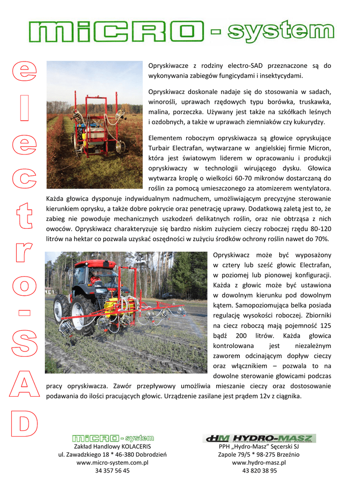 Opryskiwacze z rodziny electro-SAD przeznaczone są do wykonywania zabiegów fungicydami i insektycydami. Opryskiwacz doskonale nadaje się do stosowania w sadach, winorośli, uprawach rzędowych typu borówka, truskawka, malina, porzeczka. Używany jest także na szkółkach leśnych i ozdobnych, a także w uprawach ziemniaków czy kukurydzy. Elementem roboczym opryskiwacza są głowice opryskujące Turbair Electrafan, wytwarzane w angielskiej firmie Micron, która jest światowym liderem w opracowaniu i produkcji opryskiwaczy w technologii wirującego dysku. Głowica wytwarza kroplę o wielkości 60-70 mikronów dostarczaną do roślin za pomocą umieszczonego za atomizerem wentylatora. Każda głowica dysponuje indywidualnym nadmuchem, umożliwiającym precyzyjne sterowanie kierunkiem oprysku, a także dobre pokrycie oraz penetrację uprawy. Dodatkową zaletą jest to, że zabieg nie powoduje mechanicznych uszkodzeo delikatnych roślin, oraz nie obtrząsa z nich owoców. Opryskiwacz charakteryzuje się bardzo niskim zużyciem cieczy roboczej rzędu 80-120 litrów na hektar co pozwala uzyskad oszędności w zużyciu środków ochrony roślin nawet do 70%. Opryskiwacz może byd wyposażony w cztery lub sześd głowic Electrafan, w poziomej lub pionowej konfiguracji. Każda z głowic może byd ustawiona w dowolnym kierunku pod dowolnym kątem. Samopoziomująca belka posiada regulację wysokości roboczej. Zbiorniki na ciecz roboczą mają pojemnośd 125 bądź 200 litrów. Każda głowica kontrolowana jest niezależnym zaworem odcinającym dopływ cieczy oraz włącznikiem – pozwala to na dowolne sterowanie głowicami podczas pracy opryskiwacza. Zawór przepływowy umożliwia mieszanie cieczy oraz dostosowanie podawania do ilości pracujących głowic. Urządzenie zasilane jest prądem 12v z ciągnika. Zakład Handlowy KOLACERIS ul. Zawadzkiego 18 * 46-380 Dobrodzieo www.micro-system.com.pl 34 357 56 45 PPH „Hydro-Masz” Sęcerski SJ Zapole 79/5 * 98-275 Brzeźnio www.hydro-masz.pl 43 820 38 95