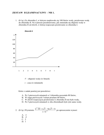 ZESTAW EGZAMINACYJNY – NR 1. 1. (0-1p.) Ze zbiornika I, w którym znajdowało się 100 litrów wody, przelewano wodę do zbiornika II. Na wykresie przedstawiono, jak zmieniała się objętość wody w zbiorniku II od chwili, w której rozpoczęto przelewanie ze zbiornika I. Zbiornik II V 120 100 80 60 40 20 1 2 3 4 5 6 7 8 t V – objętość wody (w litrach) t – czas (w minutach) Które z zadań poniżej jest prawdziwe: A. B. C. D. Po 3 pierwszych minutach w I zbiorniku pozostało 80 litrów, W ciągu pierwszych 5 minut przelano 60 litrów, W chwili rozpoczęcia przelewania w zbiorniku II nie było wody, Po 5 pierwszych minutach w obu zbiornikach było tyle samo wody. 3 2. (0-1p.) Wyrażenie A. B. C. D. -1 -2 2 1 − 64 + ( 3 − 1)( 3 + 1) po uproszczeniu wynosi: 2010 (−1) 3 2 < − 2 x + 3 jest: 5 2 x− 3. (0-1p.) Największą liczbą całkowitą spełniającą nierówność A. B. C. D. 1 -2 0 -1 4. (0-1p.) Średnia arytmetyczna liczb a,b,c wynosi 20. Wobec tego średnia arytmetyczna liczb a-7, b+8, c-7 wynosi: A. 21 B. 17 C. 18 D. 19 5. (0-1p.) Pole powierzchni działki budowlanej wynosi w rzeczywistości 25 arów. Pole powierzchni rysunku tej działki wynosi 25cm2. Rysunek działki zrobiono w skali: A. 1 : 10000 B. 1 : 100 C. 1 : 1000 D. 1 : 1000000 6. (0-1p.) Pani Celina kupiła za x zł. czajnik elektryczny i o 50% droższe od niego żelazko. Za całe zakupy zapłaciła 176 zł. Cenę czajnika można obliczyć przy pomocy równania: A. 176 = x + x + 1,5 B. 176 = x + 2,5x C. 176 = x + 1,5x D. 176 = x + 0,5 2 3 7. (0-1p.) Odwrotnością liczby postaci: 4 + 2,2 ⋅ , jest liczba: 3 22 22 A. 3 149 B. 30 3 C. 22 30 D. 149 8. (0-1p.) Poniżej ej na rysunku jest przedstawiona flaga Szwajcarii. Figura posiada: A. B. C. D. Dokładnie dwie osie symetrii Dokładnie trzy osie symetrii Dokładnie cztery osie symetrii Nie posiada osi symetrii 9. (0-2p.) Wiadomo, że w równaniu postaci v (4 + t)) = 120, niewiadome v oraz t są dodatnie i oznaczająą prędkość prę (w km/h) i czas (w h). Wyznacz z podanego równania niewiadomą t oraz podaj jej wartość wa największą, jeżeli eli minimalna prę prędkość wynosi 10 km/h, a maksymalna 20 km/h ? ść jednego z boków prostokąta prostok zwiększono kszono o 25%. O ile procent należy 10. (0-3p.) Długość skrócić drugi z jego boków, aby pole prostokąta prostok ta nie uległo zmianie? Odpowiedź uzasadnij. 11. (0-2p.) Wąż ogrodowy nawinięto nawini na bęben w kształcie walca o śśrednicy rednicy 42 cm tak, że powstała jedna warstwa. Ile pełnych obrotów wykonał bęben, b jeżeli żeli wąż wąż ma długość 22 20 metrów? Do obliczeń przyjmij π = . Wykonaj niezbędne obliczenia 7 12. (0-4p.) Montażż instalacji gazowej w samochodzie kosztuje 1900 zł. Samochód spala średnio rednio 7 litrów benzyny lub 9 litrów gazu na każde 100 km drogi. Oblicz, po ilu miesiącach cach jazdy samochodu tylko na gazie, zwrócą się koszty instalacji. Przyjmujemy, że w ciągu ągu miesiąca samochód przejeżdża średnio 1500 km, cena 1 litra gazu = 2 zł., a cena 1 litra benzyny = 4,50 zł. Zapisz niezbędne obliczenia. ZESTAW EGZAMINACYJNY – NR 2 Zadanie 1 ( 0 - 1 ) Podróżnik , pokonując dziennie taką samą długość trasy , przebył w ciągu 24 dni 2400 km . O ile dni dłużej trwałaby podróż , gdyby przebywał dziennie o 20 km mniej ? A . o 6 dni B . o 30 dni C . o 4 dni D . o 20 dni Zadanie 2 ( 0 - 1 ) Tadeusz zjadł dwie trzecie czwartej części czekolady . W zjedzonym kawałku były 4 kostki czekolady . Cała czekolada liczyła : A . 16 kostek B . 6 kostek C . 24 kostki D . 8 kostek Zadanie 3 ( 0 - 1 ) Ile sześciennych klocków o krawędzi 1 dm potrzeba do ułożenia sześciennej bryły ( całkowicie wypełnionej klockami o krawędzi 3 dm ? A . 3 B . 9 C . 18 D . 27 Zadanie 4 ( 0 - 1 ) Na prostokątnej działce o bokach 40 m na 50 m poprowadzono wzdłuż całej długości ścieżkę równoległą do dłuższego boku . Jaka jest szerokość tej ścieżki , jeżeli jej powierzchnia jest równa 75 m˛ ? A . 1,25 m B . 2/3 m C . 0,5 m D . 1,5 m Informacja do zadania 5 i 6 . W publikacjach na temat odchudzania można znaleźć wzór na obliczenie “ idealnej wagi ” człowieka : c = 0,75 w ─ 62,5 ; gdzie c - masa ciała w kilogramach , w - wzrost w centymetrach Zadanie 5 ( 0 - 1 ) Zosia ma 166 cm wzrostu . Zgodnie z tym wzrostem jej masa ciała powinna być równa : A . 65 kg B . 58,5 kg C . 62 kg D . 78 kg Zadania 6 ( 0 - 1 ) Masa ciała Michała jest równa 66,5 kg i jest to zgodne z wzorem “ idealna waga “ . Wzrost Michała jest równy : A . 1,58 m B . 1,6 m C . 180 cm D . 172 cm Zadanie 7 ( 0 - 1 ) Jeżeli w soku rozcieńczonym wodą jest cztery razy więcej wody niż soku , to sok w tym napoju stanowi : A . 10% B . 15% C . 20% D . 25% Zadanie 8 ( 0 - 1 ) Jeden hektar to pole kwadratu o boku 100 m , jeden ar to pole kwadratu o boku 10 m . Poniżej podano powierzchnie czterech gruntów uprawnych . Który z nich jest największy ? A . 10 ha B . 1000 m˛ C . 100 a D . 1 km˛ ZADANIA OTWARTE Zadanie 9 ( 0 - 4 ) Na trzy pierwsze nagrody w konkursie piosenkarskim przeznaczono 1200 złotych . Zdecydowano , że nagroda druga będzie niższa o 400 złotych od pierwszej , a nagroda trzecia niższa o 100 złotych od drugiej . Oblicz , układając i rozwiązując odpowiednie równanie , ile złotych otrzyma laureat pierwszej nagrody . Ile złotych przeznaczono na drugą i trzecią nagrodę ? Informacja do zadania 10 i 11 Trawnik szkolny ma kształt trapezu równoramiennego , którego boki mają długości : 50 m , 50 m , 50 m , 110 m .Uczniowie otrzymali zadanie oszacowania , jakie jest na nim zagęszczenie mniszka lekarskiego . Wybrali przypadkowo ( losowo ) 5 fragmentów trawnika - każdy o powierzchni 1 m˛ - i policzyli rosnące na nich mniszki lekarskie . Otrzymali następujące wyniki : 34 , 30 , 84 , 12 , 24 . Zadanie 10 ( 0 - 2 ) Oblicz średnią liczbę mniszków lekarskich przypadającą na 1 m˛ wybran