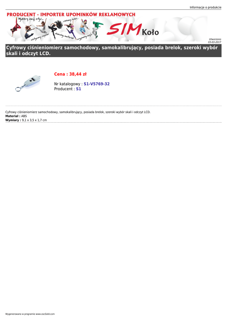Informacje o produkcie Utworzono 03-03-2017 Cyfrowy ciśnieniomierz samochodowy, samokalibrujący, posiada brelok, szeroki wybór skali i odczyt LCD. Cena : 38,44 zł Nr katalogowy : S1-V5769-32 Producent : S1 Cyfrowy ciśnieniomierz samochodowy, samokalibrujący, posiada brelok, szeroki wybór skali i odczyt LCD. Materiał : ABS Wymiary : 9,1 x 3,5 x 1,7 cm Wygenerowano w programie www.oscGold.com