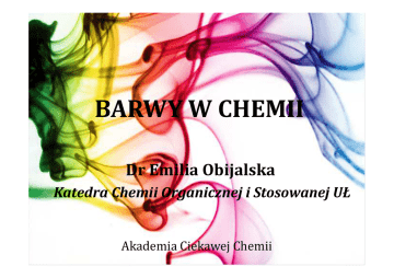 BARWY W CHEMII Dr Emilia Obijalska Katedra Chemii Organicznej i Stosowanej UŁ Akademia Ciekawej Chemii Czym jest światło? Wzrok człowieka reaguje na fale elektromagnetyczne w zakresie 380-760nm. Potocznie nazywa się tak widzialną część promieniowania elektromagnetycznego (promieniowanie widzialne odbierane przez siatkówkę oka) Dualizm korpuskularno-falowy: światło jednocześnie traktuje się jako falę elektromagnetyczną oraz jako strumień cząstek (fotony) Czym jest światło? Rozszczepienie światła białego przez pryzmat Fala elektromagnetyczna przechodząc przez granicę ośrodków ulega załamaniu. Prędkość rozchodzenia się fali zależy od częstotliwości i fale o różnej częstotliwości załamują się pod różnymi kątami, co jest przyczyną rozszczepienia wiązki światła białego na składowe. Rozszczepienie światła w przyrodzie - tęcza Tęcza powstaje gdy promienie słoneczne padające zza pleców obserwatora załamują się i odbijają w kroplach wody znajdujących się w powietrzu. Tęcza główna: światło słoneczne najpierw załamuje się w kropli deszczu, a potem część wiązki odbija się od tylnej warstwy i ponownie załamuje się a następnie wychodzi na zewnątrz w postaci pasma barw. Tęcza wtórna (barwy ułożone odwrotnie): powstaje z promieni, które dwukrotnie ulegną odbiciu wewnątrz kropli deszczu Dlaczego widzimy kolory? Związki absorbują światło zakres nm absorbowane światło barwa związku 400-435 fioletowe żółto-zielona █ 435-480 niebieskie żółta █ 480-490 niebiesko-zielone pomarańczowa █ 490-500 zielono-niebieskie czerwona █ 500-560 zielone purpurowa █ 560-580 żółto-zielone fioletowa █ 580-595 żółte niebieska █ 595-605 pomarańczowe niebiesko-zielona █ 605-750 czerwone zielono-niebieska █ Wrażenie barwy tworzy się poprzez odbicie od przedmiotu (barwnika) nie pochłoniętych fragmentów widma światła białego. Takie promieniowanie pozbawione części, która uległa absorpcji przez obiekt staje się światłem barwnym. Dlaczego widzimy kolory? Związki absorbują światło ‘koło barw’ Wrażenie barwy tworzy się poprzez odbicie od przedmiotu (barwnika) nie pochłoniętych fragmentów widma światła białego. Takie promieniowanie pozbawione części, która uległa absorpcji przez obiekt staje się światłem barwnym. Doświadczenie •Rozszczepienie światła białego •Absorpcja światła przez roztwór substancji barwnej Dlaczego związki absorbują światło? Fotony z zakresu światła widzialnego i ultrafioletu są absorbowane powodując przejścia elektronów ze stanu podstawowego do wzbudzonego. Elektron to ładunek ujemny orbitujący wokół dodatnio naładowanego jądra (oscylujący dipol). Jeśli częstość drgania dipola odpowiada częstości światła wtedy zachodzi absorpcja promieniowania. widmo UV-Vis Widma UV-Vis są ‘zapisem graficznym’ ilości absorbowanego promieniowania o danej długości fali. związki barwne nieorganiczne zawierające jony metali grup pobocznych organiczne zawierające sprzężony układ elektronów π związki kompleksowe L Mn+ atom (jon) centralny C Cn L M L n+ N N L L LK = 6 L ligand (z wolną parą elektronową) L np.: H2O, NH3, CN-, OH- O O N nieorganiczno-organiczne kompleksy metali z ligandami organicznymi (zawierającymi sprzężony układ elektronów π) N Przejścia elektronowe – związki organiczne H H H H H H O Różnica między energią orbitali π i π* zmniejsza się wraz z wydłużeniem sprzężonego układu wiązań podwójnych; absorbowana fala o większej długości (mniejsza energia potrzebna do wzbudzenia elektronu). Barwne związki organiczne chromofor ( z łac. chroma – barwa, foros – niosący) część cząsteczki, która jest bezpośrednio odpowiedzialna za absorpcje promieniowania ( z zakresu światła widzialnego) a tym samym za występowanie barwy chromofory C Cn N N polienowy azowy O O chinoidowy N N iminochinoidowy auksochrom ugrupowanie atomów, które wprowadzone do cząsteczki związku organicznego powoduje nasilenie jego barwy np.: grupy –OH, –NH2, –SH β-Karoten pomarańczowy barwnik w marchewce W cząsteczkach posiadających dużą liczbę sprzężonych wiązań π (i wolnych par elektronowych n) różnica energii między stanem podstawowym i wzbudzonym staje się na tyle mała, że absorpcja zachodzi w regionie widzialnym widma elektromagnetycznego. β-Karoten: •system 11 sprzężonych wiązań π •absorpcja niebieskiego światła (obserwowana barwa pomarańczowa) Związki azowe NO2 OH N NH2 N N N żółcień aniliniowa czerwień para NO2 NH2 OH N N OH czerń eriochromowa Reakcje sprzęgania soli diazoniowych R R Ar NH2 HNO2, HCl ~0oC Ar _ + N N Cl Ar R = NH2, NR2, OH, OR N N Doświadczenie •Otrzymywanie związku azowego Doświadczenie •Otrzymywanie związku azowego OH OH NH2 HNO2, HCl ~0oC _ + N N Cl N N Wskaźniki pH CH3 N _ CH3 _ N + CH3 H N OH N N _ O3S H+ N O3S forma zasadowa pH > 4.4 kolor żółty forma kwasowa pH < 3.2 kolor czerwony oranż metylowy HO O OH OH _ O O O O H+ O forma zasadowa pH > 10 kolor różowy forma kwasowa pH < 8.3 bezbarwna fenoloftaleina CH3 Antocyjany - wskaźniki pH występujące w przyrodzie R2 OH OH R2 _ OH + O HO O O R1 OR OR R1 OR H+ OR forma kwasowa forma zasadowa kolor czerwony kolor zielony lub niebieski Doświadczenie •Zmiana barwy wskaźników pH Barwniki w żywności Barwnik niebieski •maksimum absorpcji przy 630 nm •absorpcja promieniowania pomarańczowego Barwnik czerwony •maksimum absorpcji przy 524 nm •absorpcja promieniowania zielonego Substancja barwna vs. barwnik Nie każdy związek barwny to barwnik! Barwnik: przenika w głąb włókna (lub innego materiału barwionego) i jest odporny na wymywanie (pranie) oraz działanie promieni słonecznych. auksochrom chromofor grupa umożliwiająca wiązanie z podłożem Barwnik: substancja rozpuszczalna w stosowanym medium; w postaci rozpuszczonej przenika nośnik (po czym ewentualn