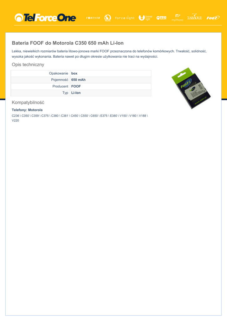 Bateria FOOF do Motorola C350 650 mAh Li-Ion Lekka, niewielkich rozmiarów bateria litowo-jonowa marki FOOF przeznaczona do telefonów komórkowych. Trwałość, solidność, wysoka jakość wykonania. Bateria nawet po długim okresie użytkowania nie traci na wydajności. Opis techniczny Opakowanie box Pojemność 650 mAh Producent FOOF Typ Li-Ion Kompatybilność Telefony: Motorola C236 \ C350 \ C359 \ C375 \ C380 \ C381 \ C450 \ C550 \ C650 \ E375 \ E380 \ V150 \ V180 \ V188 \ V220