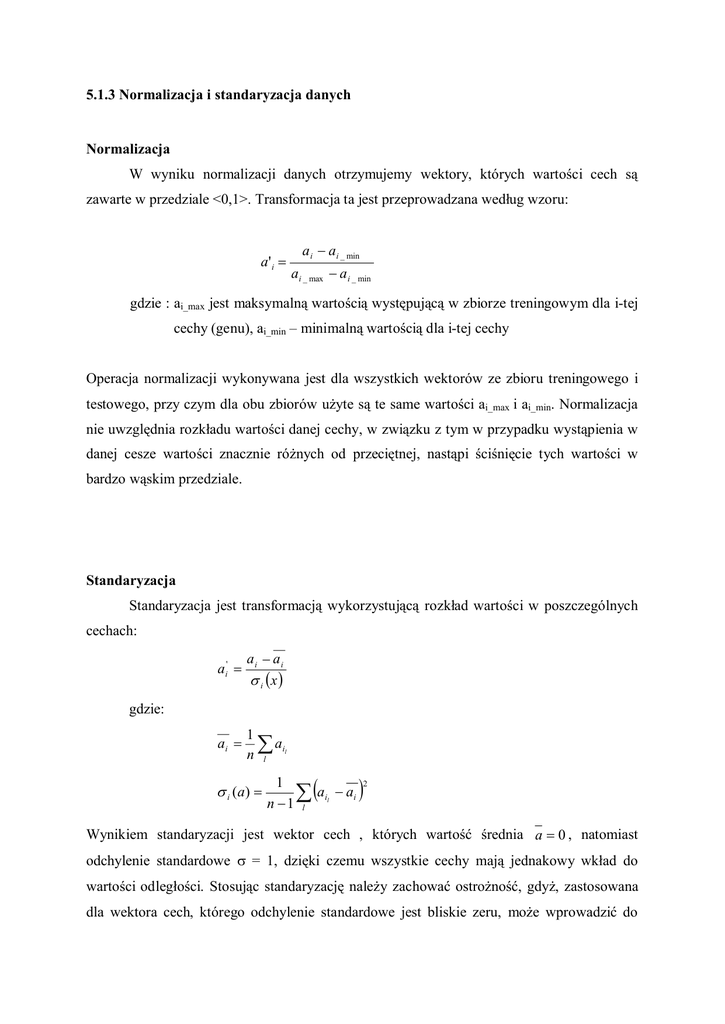 5.1.3 Normalizacja i standaryzacja danych Normalizacja W wyniku normalizacji danych otrzymujemy wektory, których wartości cech są zawarte w przedziale <0,1>. Transformacja ta jest przeprowadzana według wzoru: a' i a i ai _ min ai _ max a i _ min gdzie : ai_max jest maksymalną wartością występującą w zbiorze treningowym dla i-tej cechy (genu), ai_min – minimalną wartością dla i-tej cechy Operacja normalizacji wykonywana jest dla wszystkich wektorów ze zbioru treningowego i testowego, przy czym dla obu zbiorów użyte są te same wartości ai_max i ai_min. Normalizacja nie uwzględnia rozkładu wartości danej cechy, w związku z tym w przypadku wystąpienia w danej cesze wartości znacznie różnych od przeciętnej, nastąpi ściśnięcie tych wartości w bardzo wąskim przedziale. Standaryzacja Standaryzacja jest transformacją wykorzystującą rozkład wartości w poszczególnych cechach: ai' ai ai i x ai 1 ai n l l gdzie: i ( a) 1 ail ai n 1 l 2 Wynikiem standaryzacji jest wektor cech , których wartość średnia a 0 , natomiast odchylenie standardowe = 1, dzięki czemu wszystkie cechy mają jednakowy wkład do wartości odległości. Stosując standaryzację należy zachować ostrożność, gdyż, zastosowana dla wektora cech, którego odchylenie standardowe jest bliskie zeru, może wprowadzić do danych duży szum. Poza tym w przypadku gdy = 0, będziemy mieli wielkość nieokreśloną (dzielenie przez 0), dlatego też przed zastosowaniem tej transformacji należy usunąć (p. 5.1.5) tzw. „płaskie wzorce” (flat pattern).