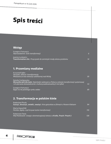 Panoptikum nr 15 (22) 201 6 Spis treści Wstęp Grzegorz Fortuna Jr. Wprowadzenie: Szok transformacji Joanna Łuniewicz Transformation chic. Przyczynek do semiotyki mody okresu przełomu 6 14 1. Przemiany medialne Krzysztof Jajko Skrzynki, talerze i transformacja. Młodzieńcze lata telewizji satelitarnej nad Wisłą 30 Natalia Szeligowska Wszystko jest dla ludzi. Najmłodsi widzowie w Polsce w okresie transformacji systemowej i ich pierwsze doświadczenia z kulturą audiowizualną (i nie tylko) 53 Grzegorz Fortuna Jr. Elgaz na tle polskiego rynku wideo 69 2. Transformacja w polskim kinie Radosław Pisula Suszyć, skruszyć, zmielić, zważyć. Kino gatunków w filmach z Panem Kleksem 94 Marta Hauschild Pontiac Agaty, czyli krzywe lustra transformacji 110 Katarzyna Taras Mój Pasikowski. Uwagi o dramaturgizacji obrazu w Krollu, Psach i Psach 2128 4 spis treści 3. Disco polo Krzysztof Kornacki Disco polo na ekranie. Kinofilska fantazja 144 Monika Rawska O, Małgorzato, będzie na bogato. Dynamika swojskości i światowości w ikonografii wideoklipów disco polo 160 Szymon Makuch W poszukiwaniu przełomu. Rola Gali Piosenki Popularnej i Chodnikowej w historii disco polo 178 4. Varia Krystyna Weiher Polak Mazurowi wilkiem. Czy Róża Wojciecha Smarzowskiego jest filmem antypolskim? 190 Dagmara Rode Post-? Uwagi o Ars Electronica 2015 199 Noty o autorach 208 Contents210 5 spis treści