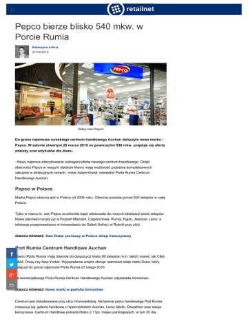 Pepco bierze blisko 540 mkw. w Porcie Rumia Katarzyna Łabuz 27/03/2015 Sklep sieci Pepco Do grona najemców rumskiego centrum handlowego Auchan dołączyła nowa marka Pepco. W salonie otwartym 20 marca 2015 na powierzchni 538 mkw. znajduje się oferta odzieży oraz artykułów dla domu. - Nowy najemca zdecydowanie wzbogacił ofertę naszego centrum handlowego. Dzięki obecności Pepco w naszym obiekcie klienci mają możliwość zrobienia kompleksowych zakupów w atrakcyjnych cenach - mówi Adam Kozioł, menedżer Portu Rumia Centrum Handlowego Auchan. Pepco w Polsce Marka Pepco obecna jest w Polsce od 2004 roku. Obecnie posiada ponad 600 sklepów w całej Polsce. Tylko w marcu br. sieć Pepco uruchomiła bądź relokowała do nowych lokalizacji sześć sklepów. Nowe placówki ruszyły już w Poznań Marcelin, Częstochowa, Rumia, Rypin, Jaworze, Lipno, a relokacje przeprowadzono w Inowrocławiu do Galerii Solnej i w Rybnik przy ulicy. ZOBACZ RÓWNIEŻ: Sieć Duka: pierwszy w Polsce sklep franczyzowy Port Rumia Centrum Handlowe Auchan Klienci Portu Rumia mają obecnie do dyspozycji blisko 80 sklepów m.in. takich marek, jak C&A, H&M, Orsay czy New Yorker. Wyposażenie wnętrz oferuje natomiast sklep marki Duka, który dołączył do grona najemców Portu Rumia 27 lutego 2015. Za komercjalizację Portu Rumia Centrum Handlowego Auchan odpowiada Immochan. ZOBACZ RÓWNIEŻ: Nowe marki w porfolio Immochan Centrum jest zlokalizowane przy ulicy Grunwaldzkiej. Na terenie parku handlowego Port Rumia mieszczą się: galeria handlowa z hipermarketem Auchan, Leroy Merlin, Decathlon oraz stacja benzynowa. Centrum Handlowe posiada blisko 2,1 tys. miejsc parkingowych, w tym 30 dla niepełnosprawnych. Zostało otwarte w 2007 roku. Obiekt należy do Immochan. Pepco "Port Rumia" Najemcy Udostępnij na RETAILNET Newsletter dla profesjonalistów rynku centrów handlowych: najemców i deweloperów Email Zapisz się! ← Klub CrossFit ruszy w Galerii Rumia Podobne artykuły Nowe marki w porfolio Immochan Marka Ecco w Porcie Rumia eSmoking World w Porcie Rumia Port Rumia uatrakcyjnia ofertę handlową Nowy najemca w Porcie Rumia CH Auchan Immochan: sklep z męską odzieżą w Porcie Rumia CH Auchan Najnowsze wiadomości NAJEMCY Galeria Pestka poszerza ofertę 27/03/2015 NAJEMCY Klub CrossFit ruszy w Galerii Rumia 27/03/2015 NAJEMCY Lancerto debiutuje w Elblągu i zdradza dalsze plany otwarć 27/03/2015 REKLAMA NAJEMCY By o la la…! otwiera drugi salon w Krakowie 27/03/2015 MULTICHANNEL RETAILING Polski startup chce zrewolucjonizować sprzedaż FMCG 27/03/2015 NAJEMCY Ruszył pierwszy w Polsce sklep outletowy Michael Kors 27/03/2015 RETAILNET Newsletter dla profesjonalistów rynku centrów handlowych: najemców i deweloperów Email Zapisz się! Dołącz do nas Dołącz do nas Portal rynku centrów i nieruchomości handlowych w Polsce. Codziennie nowe informacje o inwestycjach, najemcach, rozwoju sieci handlowych oraz technologiach handlu detalicznego. Portal oferuje codzienny Wydawca newsletter. Evigo sp. z o.o. sp.k. Zielna 37 | 00-108 Warszawa | POLAND tel. +48 225 212 000 Kontakt z redakcją Copyright by Evigo: centrum handlowe i galeria handlowa (c) 2015 | Polityka Prywatności