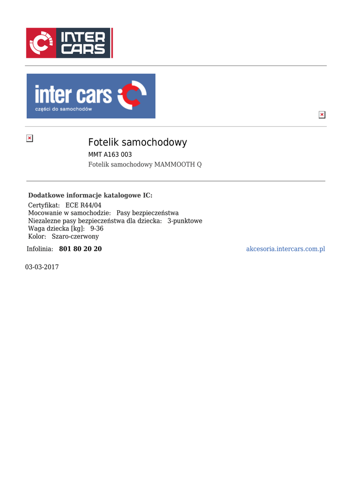 Fotelik samochodowy MMT A163 003 Fotelik samochodowy MAMMOOTH Q Dodatkowe informacje katalogowe IC: Certyfikat: ECE R44/04 Mocowanie w samochodzie: Pasy bezpieczeństwa Niezalezne pasy bezpieczeństwa dla dziecka: 3-punktowe Waga dziecka [kg]: 9-36 Kolor: Szaro-czerwony Infolinia: 801 80 20 20 03-03-2017 akcesoria.intercars.com.pl