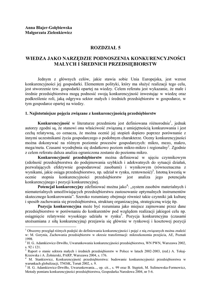 Anna Blajer-Gołębiewska Małgorzata Zielenkiewicz ROZDZIAŁ 5 WIEDZA JAKO NARZĘDZIE PODNOSZENIA KONKURENCYJNOŚCI MAŁYCH I ŚREDNICH PRZEDSIĘBIORSTW Jednym z głównych celów, jakie stawia sobie Unia Europejska, jest wzrost konkurencyjności jej gospodarki. Elementem polityki, który ma służyć realizacji tego celu, jest stworzenie tzw. gospodarki opartej na wiedzy. Celem referatu jest wykazanie, że małe i średnie przedsiębiorstwa mogą podnosić swoją konkurencyjność inwestując w wiedzę oraz podkreślenie roli, jaką odgrywa sektor małych i średnich przedsiębiorstw w gospodarce, w tym gospodarce opartej na wiedzy. 1. Najistotniejsze pojęcia związane z konkurencyjnością przedsiębiorstw Konkurencyjność w literaturze przedmiotu jest definiowana różnorodnie1, jednak autorzy zgodni są, że stanowi ona właściwość związaną z umiejętnością konkurowania i jest cechą relatywną, co oznacza, że można ocenić jej stopień dopiero poprzez porównanie z innymi uczestnikami życia gospodarczego o podobnym charakterze. Oceny konkurencyjności można dokonywać na różnym poziomie procesów gospodarczych: mikro, mezo, makro, mega/meta. Czasami wyodrębnia się dodatkowo poziom mikro-mikro i regionalny2. Zgodnie z celem referatu dalsza analiza ograniczona zostanie do poziomu mikro. Konkurencyjność przedsiębiorstw można definiować w ujęciu czynnikowym (zdolność przedsiębiorstwa do podejmowania szybkich i adekwatnych do sytuacji działań, pozwalających efektywnie gospodarować zasobami) i wynikowym (równoznaczna z wynikami, jakie osiąga przedsiębiorstwo, np. udział w rynku, rentowność)3. Istotną kwestią w ocenie stopnia konkurencyjności przedsiębiorstw jest analiza jego potencjału konkurencyjnego i pozycji konkurencyjnej. Potencjał konkurencyjny zdefiniować można jako4: „system zasobów materialnych i niematerialnych umożliwiających przedsiębiorstwu zastosowanie optymalnych instrumentów skutecznego konkurowania”. Szeroko rozumiany obejmuje również takie czynniki jak kulturę i sposób zachowania się przedsiębiorstwa, strukturę organizacyjną, strategiczną wizję itp. Pozycja konkurencyjna może być rozumiana jako miejsce zajmowane przez dane przedsiębiorstwo w porównaniu do konkurentów pod względem realizacji jakiegoś celu np. osiągnięcie relatywnie wysokiego udziału w rynku5. Pozycja konkurencyjna (czasami utożsamiana z siłą konkurencyjną) przejawia się głównie w rynkowej i kosztowej pozycji 1 Obszerny przegląd różnych podejść do definiowania konkurencyjności i pojęć z nią związanych można znaleźć w: M. Gorynia, Zachowania przedsiębiorstw w okresie transformacji: mikroekonomia przejścia, AE, Poznań 1998. 2 H. G. Adamkiewicz-Drwiłło, Uwarunkowania konkurencyjności przedsiębiorstwa, WN PWN, Warszawa 2002, s. 92 i 121. 3 Raport o stanie sektora małych i średnich przedsiębiorstw w Polsce w latach 2002-2003, (red.) A. TokajKrzewska i A. Żołnierski, PARP, Warszawa 2004, s. 176. 4 M. Stankiewicz, Konkurencyjność przedsiębiorstwa: budowanie konkurencyjności przedsiębiorstwa w warunkach globalizacji, TNOiK, Toruń 2002, s. 9. 5 H. G. Adamkiewicz-Drwiłło, Uwarunkowania..., op. cit.., s. 99 oraz B. Stępień, M. Sulimowska-Formowicz, Metody pomiaru konkurencyjności przedsiębiorstwa, Gospodarka Narodowa 2004, nr 5-6. Wiedza jako narzędzie podnoszenia konkurencyjności małych i średnich przedsiębiorstw 51 przedsiębiorstwa, utrwalonej marce, rentowności i sytuacji finansowej, rozwoju techniki i technologii. Instrumenty, jakimi przedsiębiorstwo może zapewniać sobie odpowiednią pozycję konkurencyjną, to między innymi jakość i cena produktów, ich odmienność w stosunku do dóbr oferowanych przez rywali, a także elastyczność dostosowywania produktów do oczekiwań i potrzeb klientów. Również stosowana reklama, zwiększanie dostępności produktu, poszerzanie asortymentu i zakresu świadczonych usług przed- i posprzedażowych są czynnikami, które wykorzystują firmy6, aby pozyskiwać i utrzymywać przewagę konkurencyjną. Nie bez znaczenia pozostaje również kształtowanie marki produktu i wizerunku firmy7. Odpowiedni potencjał i silna pozycja pozwalają firmie zdobyć – za pomocą adekwatnych instrumentów – przewagę konkurencyjną nad rywalami. Jeżeli tendencja ta jest stała można mówić o wysokiej konkurencyjności przedsiębiorstwa. Konkurencyjność przedsiębiorstw zależy zarówno od czynników zewnętrznych (w dużym stopniu od przedsiębiorstwa niezależnych), jak i wewnętrznych (na które przedsiębiorstwo ma znacznie większy wpływ)8. Wewnętrzne czynniki składające się na potencjał przedsiębiorstwa, na podstawie których firma może dążyć do zapewnienia sobie wysokiej pozycji konkurencyjnej, dotyczą9: • sfery informacyjnej: zalicza się tu informacje dotyczące konkurentów, również prognoz ich zachowań w przyszłości, a także znajomość aktualnej sytuacji na rynku oraz prognozowanych kierunków rozwoju, jak również informacje dotyczące obecnych i przyszłych potrzeb konsumentów; • sfery działalności badawczo-rozwojowej, w tym środków przeznaczonych na tę działalność, jakości badań, wyposażenia aparaturowego itp.; • sfery produkcji: stosowanych technologii, jakości kapitału rzeczowego i kwalifikacji pracowników, systemu zarządzania produkcją, komputeryzacji procesów; • sfery zarządzania jakością: m. in. certyfikatów jakości, systemów zapewniania i kontroli jakości wytwarzanych dóbr; • sfery zaopatrzenia, tj. powiązań z dostawcami, optymalizacji dostaw, dostępu do zasobów i lokalizacji firmy, systemów logistycznych; • sfery dystrybucji, czyli zasięgu i gęstości sieci dystrybucji, sposobów powiązania z odbiorcami, lokalizacji w stosunku do rynków zbytu; • sfery marketingu: rodzaju i zakresu stosowanych instrumentów marketingowych, budżetu przeznaczanego na marketingową dzia