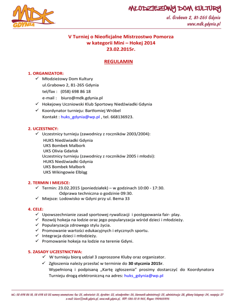 V Turniej o Nieoficjalne Mistrzostwo Pomorza w kategorii Mini – Hokej 2014 23.02.2015r. REGULAMIN 1. ORGANIZATOR: Młodzieżowy Dom Kultury ul.Grabowo 2, 81-265 Gdynia tel/fax : (058) 698 86 18 e-mail : [email protected] Hokejowy Uczniowski Klub Sportowy Niedźwiadki Gdynia Koordynator turnieju: Bartłomiej Wróbel Kontakt : [email protected] , tel. 668136923. 2. UCZESTNICY: Uczestnicy turnieju (zawodnicy z roczników 2003/2004): HUKS Niedźwiadki Gdynia UKS Bombek Malbork UKS Olivia Gdańsk Uczestnicy turnieju (zawodnicy z roczników 2005 i młodsi): HUKS Niedźwiadki Gdynia UKS Bombek Malbork UKS Wikingowie Elbląg 2. TERMIN I MIEJSCE: Termin: 23.02.2015 (poniedziałek) – w godzinach 10:00 - 17:30. Odprawa techniczna o godzinie 09:30. Miejsce: Lodowisko w Gdyni przy ul. Bema 33 4. CELE: Upowszechnianie zasad sportowej rywalizacji i postępowania fair- play. Rozwój hokeja na lodzie oraz jego popularyzacja wśród dzieci i młodzieży. Popularyzacja zdrowego stylu życia. Promowanie wartości edukacyjnych i etycznych sportu. Integracja dzieci i młodzieży. Promowanie hokeja na lodzie na terenie Gdyni. 5. ZASADY UCZESTNICTWA: W turnieju biorą udział 3 zaproszone Kluby oraz organizator. Zgłoszenia należy przesłać w terminie do 30 stycznia 2015r. Wypełnioną i podpisaną „Kartę zgłoszenia” prosimy dostarczyć do Koordynatora Turnieju drogą elektroniczną na adres: [email protected] Drużyny przyjeżdżają z trenerami oraz opiekunami grup. Trenerzy oraz opiekunowie grup sprawują nadzór nad zawodnikami podczas trwania Turnieju: w czasie meczu oraz w przerwie pomiędzy meczami, w szczególności dbają o porządek i czystość powierzonych im szatni zawodniczych. Zgłoszenie udziału w Turnieju jest równoznaczne z wyrażeniem zgody na nieodpłatne prawo do zapisu udziału dowolną techniką i wykorzystywanie zapisanego materiału do celów edukacyjnych i popularyzatorskich, oraz publikacji. Nadesłanie karty zgłoszenia jest równoznaczne z akceptacją niniejszego Regulaminu Uczestnicy Turnieju przyjeżdżają na koszt własny. Każdy zawodnik musi posiadać aktualną książeczkę zdrowia!!! 6. SYSTEM ROZGRYWEK: Rocznik 2003/2004 Formacje 3 osobowe (składy minimum 3x3 zawodników +1 bramkarz) 30 minut gry na lodowisku (zmiany, co 90 sekund na gwizdek sędziego stolikowego 3x6 zmian bez zatrzymywania czasu) Rocznik 2005-2007 Formacje 3 osobowe (składy minimum 3x3 zawodników + 1 bramkarz) 30 minut gry na lodowisku (zmiany, co 90 sekund na gwizdek sędziego stolikowego 3x6 zmian bez zatrzymywania czasu) Wszystkie roczniki grają jedną tercję 30 minutową bez zmian stron. W przypadku kary wchodzi na lód dodatkowy zawodnik z formacji przeciwnej (do czasu końca zmiany!). Punktacja w meczu: 3 punkty - wygrany, 1 punkt - remis i 0 punktów przegrany W przypadku równej ilości punktów o miejscu w grupach decydują kolejno: wynik bezpośredniego meczu, stosunek bramek, większa liczba zdobytych bramek, mniejsza liczba straconych bramek Bramki pełnowymiarowe Obowiązuje zakaz gry ciałem !!! 7. NAGRODY: Puchar i dyplom dla drużyny za miejsca I-III. Pamiątkowe medale za udział w turnieju dla wszystkich zawodników. Bartłomiej Wróbel Kamila Hamerska Koordynator Turnieju Kierownik Działu Tańca, Sportu i Rekreacji