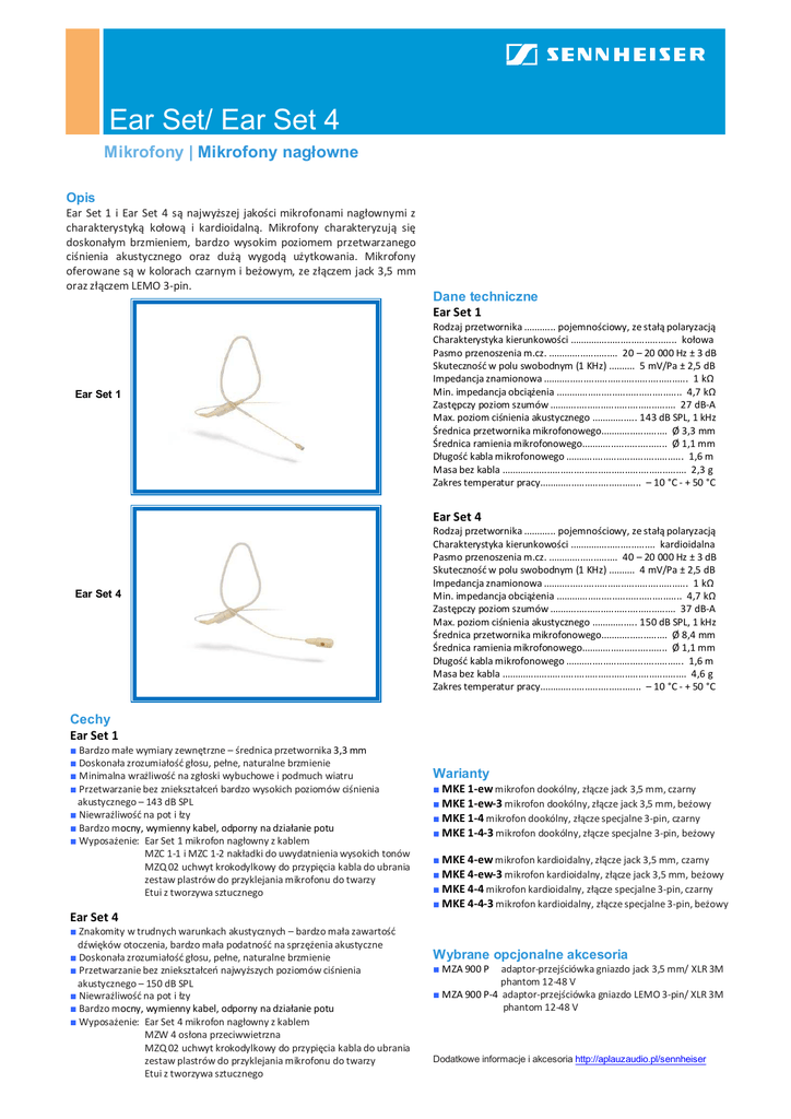 Ear Set/ Ear Set 4 Mikrofony | Mikrofony nagłowne Opis Ear Set 1 i Ear Set 4 są najwyższej jakości mikrofonami nagłownymi z charakterystyką kołową i kardioidalną. Mikrofony charakteryzują się doskonałym brzmieniem, bardzo wysokim poziomem przetwarzanego ciśnienia akustycznego oraz dużą wygodą użytkowania. Mikrofony oferowane są w kolorach czarnym i beżowym, ze złączem jack 3,5 mm oraz złączem LEMO 3-pin. Ear Set 1 Dane techniczne Ear Set 1 Rodzaj przetwornika ............ pojemnościowy, ze stałą polaryzacją Charakterystyka kierunkowości ........................................ kołowa Pasmo przenoszenia m.cz. .......................... 20 – 20 000 Hz ± 3 dB Skuteczność w polu swobodnym (1 KHz) .......... 5 mV/Pa ± 2,5 dB Impedancja znamionowa ...................................................... 1 kΩ Min. impedancja obciążenia ............................................... 4,7 kΩ Zastępczy poziom szumów ............................................... 27 dB-A Max. poziom ciśnienia akustycznego ................. 143 dB SPL, 1 kHz Średnica przetwornika mikrofonowego......................... Ø 3,3 mm Średnica ramienia mikrofonowego................................ Ø 1,1 mm Długość kabla mikrofonowego ............................................ 1,6 m Masa bez kabla ..................................................................... 2,3 g Zakres temperatur pracy...................................... – 10 °C - + 50 °C Ear Set 4 Ear Set 4 Rodzaj przetwornika ............ pojemnościowy, ze stałą polaryzacją Charakterystyka kierunkowości ................................ kardioidalna Pasmo przenoszenia m.cz. .......................... 40 – 20 000 Hz ± 3 dB Skuteczność w polu swobodnym (1 KHz) .......... 4 mV/Pa ± 2,5 dB Impedancja znamionowa ...................................................... 1 kΩ Min. impedancja obciążenia ............................................... 4,7 kΩ Zastępczy poziom szumów ............................................... 37 dB-A Max. poziom ciśnienia akustycznego ................. 150 dB SPL, 1 kHz Średnica przetwornika mikrofonowego......................... Ø 8,4 mm Średnica ramienia mikrofonowego................................ Ø 1,1 mm Długość kabla mikrofonowego ............................................ 1,6 m Masa bez kabla ..................................................................... 4,6 g Zakres temperatur pracy...................................... – 10 °C - + 50 °C Cechy Ear Set 1 ■ Bardzo małe wymiary zewnętrzne – średnica przetwornika 3,3 mm ■ Doskonała zrozumiałość głosu, pełne, naturalne brzmienie ■ Minimalna wrażliwość na zgłoski wybuchowe i podmuch wiatru ■ Przetwarzanie bez zniekształceń bardzo wysokich poziomów ciśnienia akustycznego – 143 dB SPL ■ Niewrażliwość na pot i łzy ■ Bardzo mocny, wymienny kabel, odporny na działanie potu ■ Wyposażenie: Ear Set 1 mikrofon nagłowny z kablem MZC 1-1 i MZC 1-2 nakładki do uwydatnienia wysokich tonów MZQ 02 uchwyt krokodylkowy do przypięcia kabla do ubrania zestaw plastrów do przyklejania mikrofonu do twarzy Etui z tworzywa sztucznego Warianty ■ MKE 1-ew mikrofon dookólny, złącze jack 3,5 mm, czarny ■ MKE 1-ew-3 mikrofon dookólny, złącze jack 3,5 mm, beżowy ■ MKE 1-4 mikrofon dookólny, złącze specjalne 3-pin, czarny ■ MKE 1-4-3 mikrofon dookólny, złącze specjalne 3-pin, beżowy ■ MKE 4-ew mikrofon kardioidalny, złącze jack 3,5 mm, czarny ■ MKE 4-ew-3 mikrofon kardioidalny, złącze jack 3,5 mm, beżowy ■ MKE 4-4 mikrofon kardioidalny, złącze specjalne 3-pin, czarny ■ MKE 4-4-3 mikrofon kardioidalny, złącze specjalne 3-pin, beżowy Ear Set 4 ■ Znakomity w trudnych warunkach akustycznych – bardzo mała zawartość dźwięków otoczenia, bardzo mała podatność na sprzężenia akustyczne ■ Doskonała zrozumiałość głosu, pełne, naturalne brzmienie ■ Przetwarzanie bez zniekształceń najwyższych poziomów ciśnienia akustycznego – 150 dB SPL ■ Niewrażliwość na pot i łzy ■ Bardzo mocny, wymienny kabel, odporny na działanie potu ■ Wyposażenie: Ear Set 4 mikrofon nagłowny z kablem MZW 4 osłona przeciwwietrzna MZQ 02 uchwyt krokodylkowy do przypięcia kabla do ubrania zestaw plastrów do przyklejania mikrofonu do twarzy Etui z tworzywa sztucznego Wybrane opcjonalne akcesoria ■ MZA 900 P adaptor-przejściówka gniazdo jack 3,5 mm/ XLR 3M phantom 12-48 V ■ MZA 900 P-4 adaptor-przejściówka gniazdo LEMO 3-pin/ XLR 3M phantom 12-48 V Dodatkowe informacje i akcesoria http://aplauzaudio.pl/sennheiser
