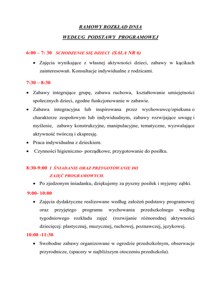 RAMOWY ROZKŁAD DNIA WEDŁUG PODSTAWY PROGRAMOWEJ 6:00 – 7: 30 SCHODZENIE SIĘ DZIECI (SALA NR 6) • Zajęcia wynikające z własnej aktywności dzieci, zabawy w kącikach zainteresowań. Konsultacje indywidualne z rodzicami. 7:30 – 8:30 • Zabawy integrujące grupę, zabawa ruchowa, kształtowanie umiejętności społecznych dzieci, zgodne funkcjonowanie w zabawie. • Zabawa integracyjna lub inspirowana przez wychowawcę/opiekuna o charakterze zespołowym lub indywidualnym, zabawy rozwijające uwagę i myślenie, zabawy konstrukcyjne, manipulacyjne, tematyczne, wyzwalające aktywność twórczą i ekspresję. • Praca indywidualna z dzieckiem. • Czynności higieniczno‐ porządkowe, przygotowanie do posiłku. 8:30-9:00 I ŚNIADANIE ORAZ PRZYGOTOWANIE DO ZAJĘĆ PROGRAMOWYCH. • Po zjedzonym śniadanku, dziękujemy za pyszny posiłek i myjemy ząbki. 9:00- 10:00 • Zajęcia dydaktyczne realizowane według założeń podstawy programowej oraz przyjętego programu tygodniowego rozkładu zajęć wychowania przedszkolnego według (rozwijanie różnorodnej aktywności dziecięcej: plastycznej, muzycznej, ruchowej, poznawczej, językowej. 10:00 ‐11:30 • Swobodne zabawy organizowane w ogrodzie przedszkolnym, obserwacje przyrodnicze, (spacery w najbliższym otoczeniu przedszkola). • Zajęcia i zabawy podejmowane z inicjatywy dzieci z wykorzystaniem zabawek ogrodowych i sprzętu sportowego. • Gry sportowe i ćwiczenia kształtujące postawę dziecka. • Gry i zabawy ruchowe w sali w przypadku złych warunków atmosferycznych. • Tworzenie sytuacji rozwijających indywidualne zdolności i zainteresowania dzieci. • Czynności higieniczno – porządkowe przygotowujące do posiłku. 11: 30- 12:00 II ŚNIADANIE • Doskonalenie umiejętności samodzielnego i estetycznego spożywania posiłku. 12:00 – 13:15 LEŻAKOWANIE • wyciszenie, relaks, słuchanie bajek, kołysanek. • Czynności porządkowe, higieniczno-sanitarne ,przygotowanie do obiadu. 13: 15 –14 : 15 OBIAD • Praca nad prawidłowym posługiwaniem się łyżką i widelcem. 14:15- 16:00 ZABAWY ZORGANIZOWANE • Zabawy dydaktyczne, utrwalające nabyte umiejętności i wiedzę w sali zabaw. Monitorowanie rozwoju dzieci, zabawa ruchowa. • Czynności porządkowo- higieniczne, przygotowanie do podwieczorku. 16:00 - 16 :30 PODWIECZOREK (SALA NR 3) 16:30 – 18 :00 ZABAWY DOWOLNE • Zabawy ruchowe, zabawy dowolnie w kącikach zainteresowań, rozchodzenie się dzieci.