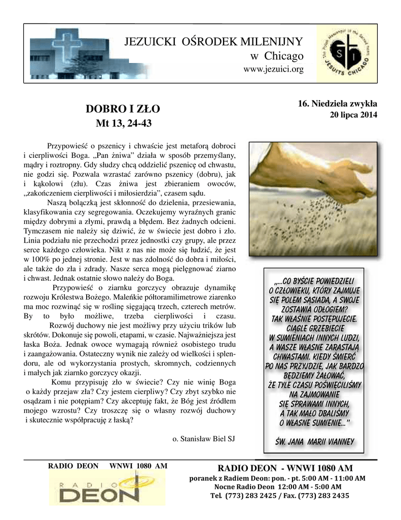 JEZUICKI OŚRODEK MILENIJNY w Chicago www.jezuici.org 16. Niedziela zwykła DOBRO I ZŁO 20 lipca 2014 Mt 13, 24-43 Przypowieść o pszenicy i chwaście jest metaforą dobroci i cierpliwości Boga. „Pan żniwa” działa w sposób przemyślany, mądry i roztropny. Gdy słudzy chcą oddzielić pszenicę od chwastu, nie godzi się. Pozwala wzrastać zarówno pszenicy (dobru), jak i kąkolowi (złu). Czas żniwa jest zbieraniem owoców, „zakończeniem cierpliwości i miłosierdzia”, czasem sądu. Naszą bolączką jest skłonność do dzielenia, przesiewania, klasyfikowania czy segregowania. Oczekujemy wyraźnych granic między dobrymi a złymi, prawdą a błędem. Bez żadnych odcieni. Tymczasem nie należy się dziwić, że w świecie jest dobro i zło. Linia podziału nie przechodzi przez jednostki czy grupy, ale przez serce każdego człowieka. Nikt z nas nie może się łudzić, że jest w 100% po jednej stronie. Jest w nas zdolność do dobra i miłości, ale także do zła i zdrady. Nasze serca mogą pielęgnować ziarno i chwast. Jednak ostatnie słowo należy do Boga. Przypowieść o ziarnku gorczycy obrazuje dynamikę rozwoju Królestwa Bożego. Maleńkie półtoramilimetrowe ziarenko ma moc rozwinąć się w roślinę sięgającą trzech, czterech metrów. By to było możliwe, trzeba cierpliwości i czasu. Rozwój duchowy nie jest możliwy przy użyciu trików lub skrótów. Dokonuje się powoli, etapami, w czasie. Najważniejsza jest łaska Boża. Jednak owoce wymagają również osobistego trudu i zaangażowania. Ostateczny wynik nie zależy od wielkości i splendoru, ale od wykorzystania prostych, skromnych, codziennych i małych jak ziarnko gorczycy okazji. Komu przypisuję zło w świecie? Czy nie winię Boga o każdy przejaw zła? Czy jestem cierpliwy? Czy zbyt szybko nie osądzam i nie potępiam? Czy akceptuję fakt, że Bóg jest źródłem mojego wzrostu? Czy troszczę się o własny rozwój duchowy i skutecznie współpracuję z łaską? o. Stanisław Biel SJ RADIO DEON WNWI 1080 AM ,,...Co byście powiedzieli o człowieku, który zajmuje się polem sąsiada, a swoje zostawia odłogiem? Tak właśnie postępujecie. Ciągle grzebiecie w sumieniach innych ludzi, a wasze własne zarastają chwastami. Kiedy śmierć po nas przyjdzie, jak bardzo będziemy żałować, że tyle czasu poświęciliśmy na zajmowanie się sprawami innych, a tak mało dbaliśmy o własne sumienie...” ŚW. JANA MARII VIANNEY RADIO DEON - WNWI 1080 AM poranek z Radiem Deon: pon. - pt. 5:00 AM - 11:00 AM Nocne Radio Deon 12:00 AM - 5:00 AM Tel. (773) 283 2425 / Fax. (773) 283 2435 PORZĄDEK MSZY ŚWIĘTYCH Poniedziałek - pi¹tek: 8:00, 18:00, 19:00 (radiowa: WCEV 1450) I piątek miesiąca: 8:00, 19:00, 20:30 Środa: 19:00 - nowenna do Matki Bożej Nieustającej Pomocy Sobota: 8:00 i 19:00 , tylko w I sobotę miesiąca o 17:00 dla chorych, Niedziela: 8:00 (radiowa), 9:30, 11:00, 13:00, 19:00, 20:30 -=- SpowiedŸ św.: od poniedziałku do soboty - 7:30 i 18:30, w niedzielę - pó³ godziny przed ka¿d¹ Msz¹ Œwiêt¹, w1. pi¹tek miesi¹ca - od 18:30 do 21:00 Adoracja Najświętszego Sakramentu - od poniedziałku do czwartku - od 18:30 do 19:00 sobota - od 18:00 do 19:00 Sanktuarium Najświętszego Serca Pana Jezusa Jezuicki Ośrodek Milenijny 5835 W. Irving Park Rd.; Chicago, IL 60634, Tel. 773 777 7000; fax 773 427 0126 www.jezuici.org e-mail: [email protected] Audycje Radia DEON: tel. 773 283 2425 Fax. 773 283 2435 www. radiodeon.com e-mail: [email protected] Biuro czynne: od poniedziałku do piątku: 8:30 - 9:00, 15:30 - 20:30 sobota: 9:30 - 20:30, niedziela: 8:30 - 14:30, 18:30 - 21:30 Biblioteka czynna: sobota: 18:00 - 19:00; niedziela: 10:30 - 14:30; 19:00 - 21:00 Kawiarenka czynna: niedz.: 10:00 - 15:00, 19:00 - 22:00 Sacred Heart Mission House 4105 N. Avers Ave., Chicago, IL 60618 Tel. 773 588 74 76; fax 773 588 65 17 Rektor Sanktuarium i Przełożony Jezuitów o. Jerzy Sermak, SJ (773-588-7476 - ext. 224) o. Józef Birecki, SJ (773-777-7000 - ext. 121) o. Jerzy Mordarski, SJ (773-588-7476 - ext. 234) o. Jerzy Karpiński, SJ (773-588-7476 - ext. 237) o. Piotr Kochanowicz, SJ (773-588-7476 - ext. 227) br. Adam Poręba, SJ (773-777-7000 - ext. 122) Wszelkie ofiary i donacje prosimy kierowaæ na adres Sanktuarium. Donacje s¹ wolne od podatku i mo¿na je odpisywaæ przy rozliczeniu z IRS. TRANSMISJE RADIOWE I INTERNETOWE od poniedziałku do piątku,transmisja Mszy Św. z godz. 19:00 Radio WCEV 1450 (www.wcev1450.com) Niedziela 9:30 www.RadioSiedeM.net w niedziele: godz 8-9, Radio WCEV 1450, oraz Polskie Radio Chicago 1030 WNVR (www.polskieradio.com) Codziennie przez całą dobę: Kamera internetowa z Sanktuarium (obraz i dźwięk; używać Internet Explorer): www.jezuici.org - link „Transmisje na żywo” – wpisać jako użytkownik i hasło: 5835 INTENCJE MSZY ŚWIĘTYCH Niedziela, 20 VII 2014 8:00 + Katarzyna Pacyniak, + + Albin i Konstancja Sypko 9:30 Zbiorowa 11:00 + Władysław Nowak w 22. rocznicę śmierci oraz zmarli z tej rodziny 13:00 w 30. rocznicę ślubu Zdzisławy i Marka Góra, podziękowanie za otrzymane łaski z prośbą o dalsze 19:00 Zbiorowa 20:30 + Zygmunt Wilk w 1. rocznicę śmierci Poniedziałek, 21 VII 8:00 + Maria Chłoń w 6. miesięcy po śmierci 18:00 + + Czesława i Bonifacy Pałasińscy, + + Irena i Włodzimierz Paczoscy 19:00 Zbiorowa Wtorek, 22 VII - św. Marii Magdaleny 8:00 z okazji urodzin Doroty Gil, o zdrowie, opiekę i prowadzenie Matki Bożej drogą do zbawienia 18:00 o uzdrowienie międzypokoleniowe w rodzinie Wojtczaków 19:00 Zbiorowa Środa, 23 VII - św. Brygidy, patronki Europy 8:00 Za Dobroczyńców Jezuickiego Ośrodka Milenijnego 18:00 o przemianę życia i dary Ducha Św. dla Anny 19:00 Zbiorowa Czwartek, 24 VII 8:00 o łaskę zdrowia i Boże błogosławieństwo dla Krzysztofa i Alicji Kucmierz w 4. rocznicę ślubu 18:00 + Zenon Nietupski w 1. rocznicę śmierci 19:00 Zbiorowa. Piątek, 25 VII - św. Jakuba, apostoła oraz św. Krz
