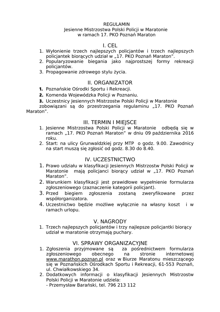 REGULAMIN Jesienne Mistrzostwa Polski Policji w Maratonie w ramach 17. PKO Poznań Maraton I. CEL 1. Wyłonienie trzech najlepszych policjantów i trzech najlepszych policjantek biorących udział w „17. PKO Poznań Maraton”. 2. Popularyzowanie biegania jako najprostszej formy rekreacji policjantów. 3. Propagowanie zdrowego stylu życia. II. ORGANIZATOR 1. Poznańskie Ośrodki Sportu i Rekreacji. 2. Komenda Wojewódzka Policji w Poznaniu. 3. Uczestnicy Jesiennych Mistrzostw Polski Policji w Maratonie zobowiązani są do przestrzegania regulaminu „17. PKO Poznań Maraton”. III. TERMIN I MIEJSCE 1. Jesienne Mistrzostwa Polski Policji w Maratonie odbędą się w ramach „17. PKO Poznań Maraton” w dniu 09 października 2016 roku. 2. Start: na ulicy Grunwaldzkiej przy MTP o godz. 9.00. Zawodnicy na start muszą się zgłosić od godz. 8.30 do 8.40. IV. UCZESTNICTWO 1. Prawo udziału w klasyfikacji Jesiennych Mistrzostw Polski Policji w Maratonie mają policjanci biorący udział w „17. PKO Poznań Maraton”. 2. Warunkiem klasyfikacji jest prawidłowe wypełnienie formularza zgłoszeniowego (zaznaczenie kategorii policjant). 3. Przed biegiem zgłoszenia zostaną zweryfikowane przez współorganizatora. 4. Uczestnictwo będzie możliwe wyłącznie na własny koszt i w ramach urlopu. V. NAGRODY 1. Trzech najlepszych policjantów i trzy najlepsze policjantki biorący udział w maratonie otrzymają puchary. VI. SPRAWY ORGANIZACYJNE 1. Zgłoszenia przyjmowane są za pośrednictwem formularza zgłoszeniowego obecnego na stronie internetowej www.marathon.poznan.pl oraz w Biurze Maratonu mieszczącego się w Poznańskich Ośrodkach Sportu i Rekreacji, 61-553 Poznań, ul. Chwiałkowskiego 34. 2. Dodatkowych informacji o klasyfikacji Jesiennych Mistrzostw Polski Policji w Maratonie udziela: - Przemysław Barański, tel. 796 213 112