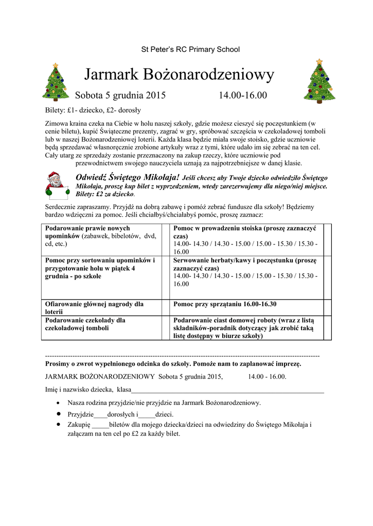 St Peter’s RC Primary School Jarmark Bożonarodzeniowy Sobota 5 grudnia 2015 14.00-16.00 Bilety: £1- dziecko, £2- dorosły Zimowa kraina czeka na Ciebie w holu naszej szkoły, gdzie możesz cieszyć się poczęstunkiem (w cenie biletu), kupić Świąteczne prezenty, zagrać w gry, spróbować szczęścia w czekoladowej tomboli lub w naszej Bożonarodzeniowej loterii. Każda klasa będzie miała swoje stoisko, gdzie uczniowie będą sprzedawać własnoręcznie zrobione artykuły wraz z tymi, które udało im się zebrać na ten cel. Cały utarg ze sprzedaży zostanie przeznaczony na zakup rzeczy, które uczniowie pod przewodnictwem swojego nauczyciela uznają za najpotrzebniejsze w danej klasie. Odwiedź Świętego Mikołaja! Jeśli chcesz aby Twoje dziecko odwiedziło Świętego Mikołaja, proszę kup bilet z wyprzedzeniem, wtedy zarezerwujemy dla niego/niej miejsce. Bilety: £2 za dziecko. Serdecznie zapraszamy. Przyjdź na dobrą zabawę i pomóż zebrać fundusze dla szkoły! Będziemy bardzo wdzięczni za pomoc. Jeśli chciałbyś/chciałabyś pomóc, proszę zaznacz: Podarowanie prawie nowych upominków (zabawek, bibelotów, dvd, cd, etc.) Pomoc przy sortowaniu upominków i przygotowanie holu w piątek 4 grudnia - po szkole Ofiarowanie głównej nagrody dla loterii Podarowanie czekolady dla czekoladowej tomboli Pomoc w prowadzeniu stoiska (proszę zaznaczyć czas) 14.00- 14.30 / 14.30 - 15.00 / 15.00 - 15.30 / 15.30 16.00 Serwowanie herbaty/kawy i poczęstunku (proszę zaznaczyć czas) 14.00- 14.30 / 14.30 - 15.00 / 15.00 - 15.30 / 15.30 16.00 Pomoc przy sprzątaniu 16.00-16.30 Podarowanie ciast domowej roboty (wraz z listą składników-poradnik dotyczący jak zrobić taką listę dostępny w biurze szkoły) -----------------------------------------------------------------------------------------------------------------------Prosimy o zwrot wypełnionego odcinka do szkoły. Pomoże nam to zaplanować imprezę. JARMARK BOŻONARODZENIOWY Sobota 5 grudnia 2015, 14.00 - 16.00. Imię i nazwisko dziecka, klasa________________________________________________________ Nasza rodzina przyjdzie/nie przyjdzie na Jarmark Bożonarodzeniowy. Przyjdzie____dorosłych i_____dzieci. Zakupię _____biletów dla mojego dziecka/dzieci na odwiedziny do Świętego Mikołaja i załączam na ten cel po £2 za każdy bilet.