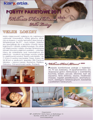 POBYTY PAKIETOWE 2011 Wellness Hotel Diana**** Velke Losiny VELKE LOSINY Mała miejscowość należąca do najstarszych uzdrowisk morawskich, której główną atrakcją są baseny z wodą termalną (siarczaną) o temperaturze 36,2°C – kryty basen. Uzdrowisko specjalizuje się w leczeniu chorób neurologicznych i układu oddechowego. Do atrakcji miejscowości należy również renesansowy zamek otoczony pięknym parkiem – udostępniany do zwiedzania oraz manufaktura papiernicza - muzeum ręcznego wyrobu papieru, elektrownia wodna. Tereny narciarskie - ok. 7-10 km 2 centra narciarskie: Oaza, Kares i ok. 25-30 km w okolicach Jesenika: (SKI Centrum Miroslav – Lipova Lazne), Ramzova, Petríkov, Ostruzna, Cervenohorske sedlo, Praded). Wellness Hotel „Diana” **** Posiada komfortowe pokoje z łazienkami, TV sat, lodówką, 14 apartamentów. Do dyspozycji gości: restauracja z wyśmienitą kuchnią, basen, jacuzzi, siłownia, kort do squasha, tenis stołowy, sauna, możliwość masaży, kąpieli perełkowych, aromatycznych, zabiegów relaksacyjnych, kawiarnia z parkietem tanecznym. Organizator: IBP „KARPATIA” Nowy Sącz, ul. Barlickiego 15 tel./fax.: (018) 444 11 00; 547 47 84 www.karpatia.pl POBYTY PAKIETOWE 2011 Wellness Hotel Diana**** Velke Losiny NAZWA PAKIETU ILOŚĆ NOCY DIANA TYDZIEŃ cena w PLN za 1 OSOBĘ w pokoju 2 osobowym/ termin ZABIEGI / ilość POSIŁKI INNE 1008 - 2 Drink powitalny, wolny wstęp na basen, jacuzzi, fitness, tenis stołowy 468 396 - 2 Drink powitalny, wolny wstęp na basen, jacuzzi, fitness, tenis stołowy 594 648 513 - 2 Drink powitalny, wolny wstęp na basen, jacuzzi, fitness, tenis stołowy 7 1386 1512 1197 1 zabieg/dzień – do wyboru (oprócz dnia wyjazdu) 2 Drink powitalny, wolny wstęp na basen, jacuzzi, fitness, tenis stołowy WELLNESS WEEKEND 2 504 540 450 1 zabieg/dzień – do wyboru (oprócz dnia wyjazdu) 2 Drink powitalny, wolny wstęp na basen, jacuzzi, fitness, tenis stołowy WELLNESS PRZEDŁUŻONY WEEKEND 3 699 756 621 1 zabieg/dzień – do wyboru (oprócz dnia wyjazdu) 2 Drink powitalny, wolny wstęp na basen, jacuzzi, fitness, tenis stołowy 1575 1 x masaż aromatyczny z okładem borowinowym, 1 x masaż klasyczny całościowy z kąpielą perełkową, 1 x masaż całościowy gorącymi kamieniami, 1 x częściowy masaż regeneracyjny, 1 x masaż stóp z kąpielą olejkową, 1 x kosmetyczny pakiet dla kobiety lub mężczyzny 2 Drink powitalny, wolny wstęp na basen, jacuzzi, fitness, tenis stołowy 1 x kąpiel perełkowa + masaż aromatyczny, 1 x sauna + klasyczny masaż częściowy, okład borowinowy + klasyczny masaż częściowy, dynaterm + klasyczny masaż częściowy, 1 x kąiel ziołowa + pakiet kosmetyczny dla kobiety lub mężczyzny. 2 Drink powitalny, wolny wstęp na basen, jacuzzi, fitness, tenis stołowy 1 zabieg/dzień – do wyboru (oprócz dnia wyjazdu) 2 UWAGA: pakiet obejmuje pobyty od niedzieli do czwartku, Drink powitalny, wolny wstęp na basen, jacuzzi, fitness, tenis stołowy - 2 UWAGA: pakiet obejmuje pobyty od niedzieli do czwartku, Drink powitalny, wolny wstęp na basen, jacuzzi, fitness, tenis stołowy pobyt w apartamencie, jedno dziecko do 15 lat – GRATIS! Dla każdego rodzica – zabieg wellness, dla dzieci w pierwszym i ostatnim dniu pobytu słodki podarunek, 2 Drink powitalny dla rodziców, wolny wstęp na basen, jacuzzi, fitness, tenis stołowy 2 Drink powitalny, wolny wstęp na basen, jacuzzi, fitness, tenis stołowy, możliwość wypożyczenia szlafroka 01.04-30.06 01.09-31.10 30.06-01.09 31.10-20.12 7 1134 1260 DIANA WEEKEND 2 432 DIANA PRZEDŁUŻONY WEEKEND 3 WELLNESS TYDZIEŃ RELAX TYDZIEŃ WELLNESS ENERGY TYDZIEŃ ROYAL QUEEN TYDZIEŃ Z RODZINĄ 7 1764 1890 7 1512 1638 1323 3 567 621 513 2 414 450 378 3 459 513 405 2 342 378 306 7 1386 1512 1260 5 1035 1125 945 2 576 648 540 RELAKS PO JAWAJSKU 3 882 954 846 1 x masaż egzotyczny do wyboru 60 min. (Jawa, Sumatra, Borneo, Hawaje), 1 x kąpiel zapachowa (drzewo sandałowe lub róża) 2 x masaż egzotyczny do wyboru 60 min. (Jawa, Sumatra, Borneo, Hawaje), 1 x kąpiel zapachowa (drzewo sandałowe lub róża) Organizator: IBP „KARPATIA” Nowy Sącz, ul. Barlickiego 15 tel./fax.: (018) 444 11 00; 547 47 84 www.karpatia.pl
