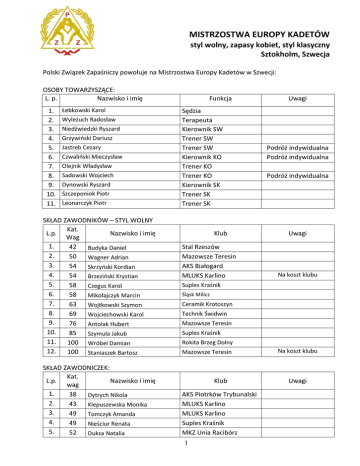 MISTRZOSTWA EUROPY KADETÓW styl wolny, zapasy kobiet, styl klasyczny Sztokholm, Szwecja Polski Związek Zapaśniczy powołuje na Mistrzostwa Europy Kadetów w Szwecji: OSOBY TOWARZYSZĄCE: L. p. Nazwisko i imię 1. 2. 3. 4. 5. 6. 7. 8. 9. 10. 11. Łebkowski Karol Wyleżuch Radosław Niedźwiedzki Ryszard Grzywiński Dariusz Jastreb Cezary Czwaliński Mieczysław Olejnik Władysław Sadowski Wojciech Dynowski Ryszard Szczeponiok Piotr Leonarczyk Piotr SKŁAD ZAWODNIKÓW – STYL WOLNY Kat. L.p. Nazwisko i imię Wag 1. 42 Budyka Daniel 2. 50 Wagner Adrian 3. 54 Skrzyński Kordian 4. 54 Brzeziński Krystian 5. 58 Czegus Karol 6. 58 Mikołajczyk Marcin 7. 63 Wojtkowski Szymon 8. 69 Wojciechowski Karol 9. 76 Antolak Hubert 10. 85 Szymula Jakub 11. 100 Wróbel Damian 12. 100 Staniaszek Bartosz SKŁAD ZAWODNICZEK: Kat. L.p. Nazwisko i imię wag 1. 38 Dytrych Nikola 2. 43 Klepuszewska Monika 3. 49 Tomczyk Amanda 4. 49 Nieściur Renata 5. 52 Duksa Natalia Funkcja Sędzia Terapeuta Kierownik SW Trener SW Trener SW Kierownik KO Trener KO Trener KO Kierownik SK Trener SK Trener SK Klub Stal Rzeszów Mazowsze Teresin AKS Białogard MLUKS Karlino Uwagi Podróż indywidualna Podróż indywidualna Podróż indywidualna Uwagi Na koszt klubu Suples Kraśnik Śląsk Milicz Ceramik Krotoszyn Technik Świdwin Mazowsze Teresin Suples Kraśnik Rokita Brzeg Dolny Mazowsze Teresin Klub AKS Piotrków Trybunalski MLUKS Karlino MLUKS Karlino Suples Kraśnik MKZ Unia Racibórz 1 Na koszt klubu Uwagi 6. 7. 8. 9. 10. 11. 12. 52 56 56 60 65 70 70 Na koszt klubu Głodek Magdalena KS Bloczek Pelplin Mytkowska Angelika ZKS Koszalin Martyka Sylwia Junior Dzierżoniów Martyka Paulina Junior Dzierżoniów Chołuj Wiktoria AKS Białogard Ciunek Ewelina Orzeł Namysłów Kaczyńska Ewelina Warmia Lidzbark Warmiński Na koszt klubu Klub Uwagi SKŁAD ZAWODNIKÓW – STYL KLASYCZNY: Kat. L.p. Nazwisko i imię wag 1. 42 Czarnecki Kamil 2. 50 Dudziński Dominik 3. 54 Petrończak Filip 4. 58 Majdański Jakub 5. 58 Mielewczyk Aleksander 6. 63 Starzyński Błażej 7. 59 Zabłocki Piotr 8. 76 Szymonowicz Szymon 9. 85 Dybka Michał 10. 100 Kurniczak Gerard 11. 63 Drewa Nikodem 12. 69 Bednarz Patryk MKZ Unia Racibórz Olimpijczyk Radom MKZ Unia Racibórz Agros Żary Cartusia Kartuzy Olimpijczyk Radom ZKS Miastko Cement Gryf Chełm PTC Pabianice KS Sobieski Poznań Cartusia Kartuzy Na koszt klubu ZUKS Łękinia Na koszt klubu brak tolerancji wagowej Zbiórka na lotnisku na dwie godziny przed planowanym odlotem. Szczegóły przelotów: I. ZAPASY – STYL WOLNY 17.07.2016 W6 1731 Gdańsk – Sztokholm Skavsta o godz. 06:00 (w Sztokholmie o 07:10); 21.07.2016 W6 1734 Sztokholm Skavsta – Gdańsk o godz. 17:20 (w Gdańsku o 18:25). * dla stylu wolnego tylko bagaż podręczny II. ZAPASY KOBIET 19.07.2016 LO 3944 Poznań – Warszawa o godz. 14:55 (w Warszawie o 15:50); 19.07.2016 LO 457 Warszawa – Sztokholm o godz. 17:00 (w Sztokholmie o 18:45); 23.07.2016 LO 456 Sztokholm - Warszawa o godz. 07:15 (w Warszawie o 08:55). 2 III. ZAPASY – STYL KLASYCZNY 21.07.2016 LO 457 Warszawa – Sztokholm o godz. 17:00 (w Sztokholmie o 18:45); 25.07.2016 LO 454 Sztokholm - Warszawa o godz. 10:10 (w Warszawie o 11:55). IV. Łebkowski Karol, Wyleżuch Radosław 17.07.2016 LO 457 Warszawa – Sztokholm o godz. 17:00 (w Sztokholmie o 18:45); 25.07.2016 LO 454 Sztokholm - Warszawa o godz. 10:10 (w Warszawie o 11:55). V. Czwaliński Mieczysław 19.07.2016 LO 457 Warszawa – Sztokholm o godz. 17:00 (w Sztokholmie o 18:45); 23.07.2016 LO 454 Sztokholm - Warszawa o godz. 10:10 (w Warszawie o 11:55). W przypadku braku możliwości uczestnictwa w zawodach prosimy o tym niezwłocznie powiadomić biuro PZZ na e-mail: [email protected] lub tel. (22) 624 81 11, 624 01 69. Zawodnik zobowiązany jest posiadać aktualne badania lekarskie oraz paszport ważny minimum 6 miesięcy. Przysługuje zwrot kosztów podróży (PKP II kl. posp. lub PKS) na podstawie załączonego biletu (bez kosztów diety i dojazdów) przesłanego zgodnie z obowiązującymi przepisami do biura PZZ w Warszawie w terminie nieprzekraczającym 14 dni od dnia zakończenia akcji. Dokumentem podróży uprawniającym do wjazdu i pobytu do 3 miesięcy na terytorium Królestwa Szwecji jest ważny paszport bądź dowód osobisty. Przed wyjazdem należy się upewnić, czy dokument jest w wystarczająco dobrym stanie technicznym i pozwala na stwierdzenie tożsamości. Ograniczenia swobodnego przemieszczania się i pobytu mogą mieć miejsce jedynie w przypadkach zagrażających bezpieczeństwu państwa lub zdrowiu publicznemu. 3