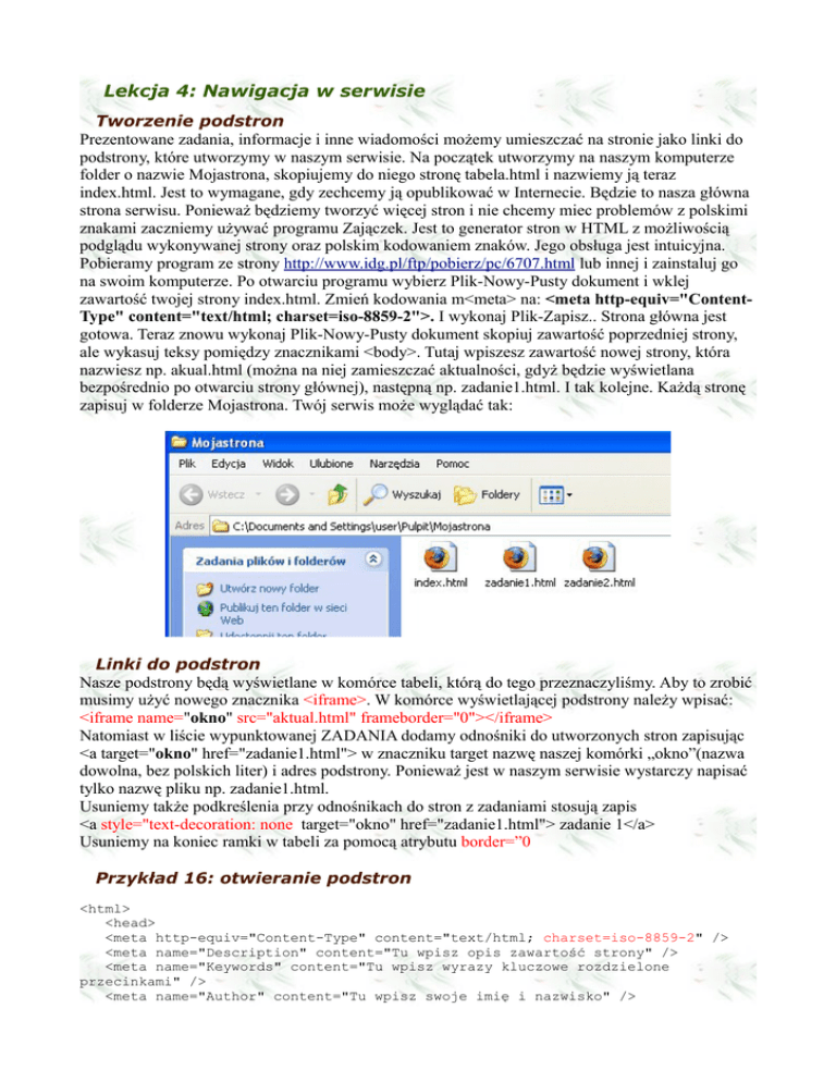Lekcja 4: Nawigacja w serwisie Tworzenie podstron Prezentowane zadania, informacje i inne wiadomości możemy umieszczać na stronie jako linki do podstrony, które utworzymy w naszym serwisie. Na początek utworzymy na naszym komputerze folder o nazwie Mojastrona, skopiujemy do niego stronę tabela.html i nazwiemy ją teraz index.html. Jest to wymagane, gdy zechcemy ją opublikować w Internecie. Będzie to nasza główna strona serwisu. Ponieważ będziemy tworzyć więcej stron i nie chcemy miec problemów z polskimi znakami zaczniemy używać programu Zajączek. Jest to generator stron w HTML z możliwością podglądu wykonywanej strony oraz polskim kodowaniem znaków. Jego obsługa jest intuicyjna. Pobieramy program ze strony http://www.idg.pl/ftp/pobierz/pc/6707.html lub innej i zainstaluj go na swoim komputerze. Po otwarciu programu wybierz Plik-Nowy-Pusty dokument i wklej zawartość twojej strony index.html. Zmień kodowania m<meta> na: <meta http-equiv="ContentType" content="text/html; charset=iso-8859-2">. I wykonaj Plik-Zapisz.. Strona główna jest gotowa. Teraz znowu wykonaj Plik-Nowy-Pusty dokument skopiuj zawartość poprzedniej strony, ale wykasuj teksy pomiędzy znacznikami <body>. Tutaj wpiszesz zawartość nowej strony, która nazwiesz np. akual.html (można na niej zamieszczać aktualności, gdyż będzie wyświetlana bezpośrednio po otwarciu strony głównej), następną np. zadanie1.html. I tak kolejne. Każdą stronę zapisuj w folderze Mojastrona. Twój serwis może wyglądać tak: Linki do podstron Nasze podstrony będą wyświetlane w komórce tabeli, którą do tego przeznaczyliśmy. Aby to zrobić musimy użyć nowego znacznika <iframe>. W komórce wyświetlającej podstrony należy wpisać: <iframe name="okno" src="aktual.html" frameborder="0"></iframe> Natomiast w liście wypunktowanej ZADANIA dodamy odnośniki do utworzonych stron zapisując <a target="okno" href="zadanie1.html"> w znaczniku target nazwę naszej komórki „okno”(nazwa dowolna, bez polskich liter) i adres podstrony. Ponieważ jest w naszym serwisie wystarczy napisać tylko nazwę pliku np. zadanie1.html. Usuniemy także podkreślenia przy odnośnikach do stron z zadaniami stosują zapis <a style="text-decoration: none target="okno" href="zadanie1.html"> zadanie 1</a> Usuniemy na koniec ramki w tabeli za pomocą atrybutu border=”0 Przykład 16: otwieranie podstron <html> <head> <meta http-equiv="Content-Type" content="text/html; charset=iso-8859-2" /> <meta name="Description" content="Tu wpisz opis zawartość strony" /> <meta name="Keywords" content="Tu wpisz wyrazy kluczowe rozdzielone przecinkami" /> <meta name="Author" content="Tu wpisz swoje imię i nazwisko" /> <title>Strona nauczyciela</title> </head> <body> <table cellspacing=0 cellpadding=2 width=100% border="0"?> <tr height=20px> <td bgcolor="#fff9e5">Logo wysokość 100px</td> <td bgcolor="#996600">Baner</td> </tr> <tr> <td valign=top> <p align="center"> <font color="#cc0000">Ciekawe linki</font><br> </p> <a target="_blank" href="http://www.wp.pl">Wirtualna Polska</a><br> <a target="_blank" href="http://www.men.gov.pl">Ministerstwo Edukacji Narodowej</a><br> <a target="_blank" href="http://www.interia.pl">Interia</a><br> <a target="_blank" href="http://www.kurnik.pl">Kurnik-rozrywka</a><br> <a target="_blank" href="http://www.styl24.pl/twojstyl.php">Twój Styl</a><br> </td> <td rowspan="2" bgcolor=#fff9e5 valign=top align="center" width=80% ><iframe name="okno" src="aktual.html" width=94% frameborder="0"></iframe></td> </tr> <tr> <td valign=top > <font color="#cc0000">Zadania</font> <ul > <li><a style="text-decoration: none” target="okno" href="zadanie1.html"> zadanie 1</a></li> <li> <a style="text-decoration: none” target="okno" href="zadanie1.html">zadanie 2</a></li> </ul> <font color="#cc0000">Informacje</font> <ul> <li> dokument tekstowy</li> <li> prezentacja</li> <li> dokument graficzny</li> </ul> </td> </tr> <tr> <td colspan="2" height=20px valign=middle align=center > <a href="mailto:[email protected]"><font color="#336600">Napisz do autora strony</font></a></td> </tr> </table> </body> </html> Zadanie 9 Po przygotowaniu podstron skopiuj przykład 18 do strony index.html i sprawdź działanie serwisu. Po otwarciu strony index.html zobaczysz różny widok w zależności od przeglądarek: W Internet Explorer W FireFox Porada: Testując wygląd tworzonej strony musisz sprawdzać widok w co najmniej dwóch przeglądarkach. Linki do dokumentów Linki do dokumentów tworzymy identycznie jak do podstron, jako adres podajemy nazwę pliku poprzedzoną nazwą folderu, w którym się znajduje np.dokumenty/rysunek.odg. Aby zachować porządek w serwisie należy umieszczać pliki w jednym folderze np. dokumenty. Zadanie zaliczeniowe nr 4: Wykonaj działający serwis zawierający co najmniej dwie podstrony i dwa dowolne dokumenty. Spakuj jako Mojastrona.zip i wyślij. Rozwiązanie powinno wyglądać tak (otwarta podstrona zadanie2.html):