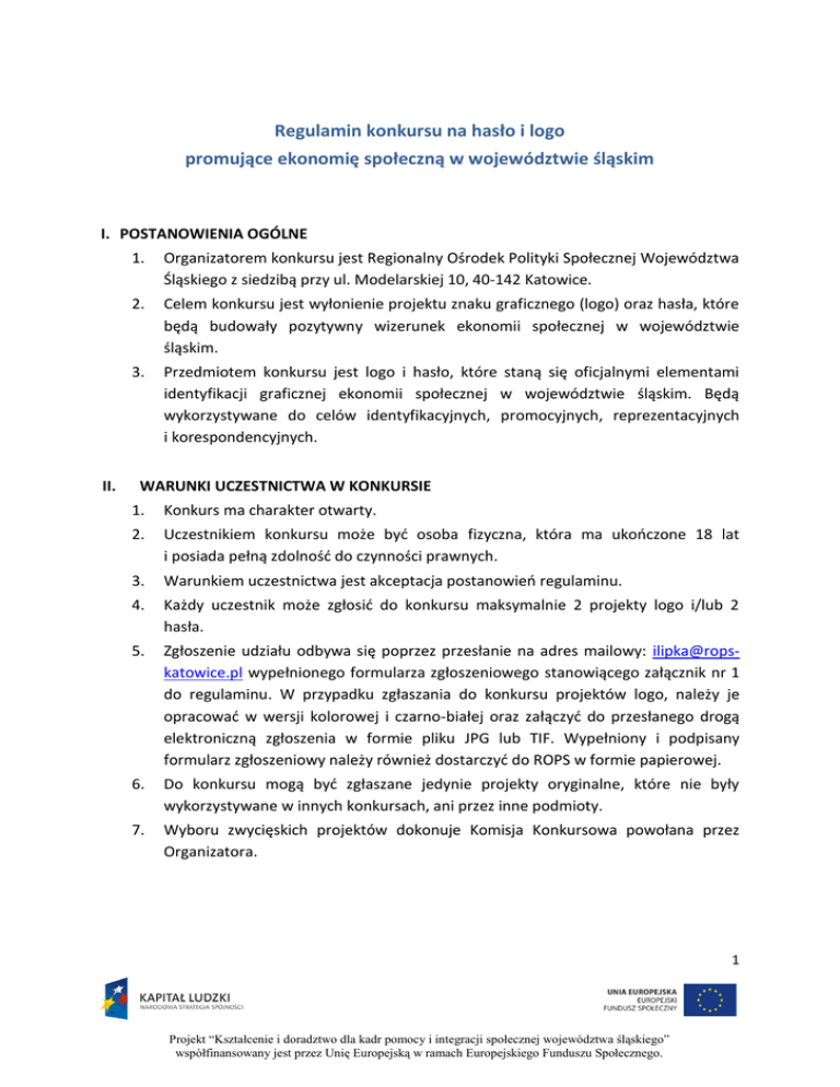 Regulamin konkursu na hasło i logo promujące ekonomię społeczną w województwie śląskim I. POSTANOWIENIA OGÓLNE II. 1. Organizatorem konkursu jest Regionalny Ośrodek Polityki Społecznej Województwa Śląskiego z siedzibą przy ul. Modelarskiej 10, 40-142 Katowice. 2. Celem konkursu jest wyłonienie projektu znaku graficznego (logo) oraz hasła, które będą budowały pozytywny wizerunek ekonomii społecznej w województwie śląskim. 3. Przedmiotem konkursu jest logo i hasło, które staną się oficjalnymi elementami identyfikacji graficznej ekonomii społecznej w województwie śląskim. Będą wykorzystywane do celów identyfikacyjnych, promocyjnych, reprezentacyjnych i korespondencyjnych. WARUNKI UCZESTNICTWA W KONKURSIE 1. Konkurs ma charakter otwarty. 2. Uczestnikiem konkursu może byd osoba fizyczna, która ma ukooczone 18 lat i posiada pełną zdolnośd do czynności prawnych. 3. Warunkiem uczestnictwa jest akceptacja postanowieo regulaminu. 4. Każdy uczestnik może zgłosid do konkursu maksymalnie 2 projekty logo i/lub 2 hasła. 5. Zgłoszenie udziału odbywa się poprzez przesłanie na adres mailowy: [email protected] wypełnionego formularza zgłoszeniowego stanowiącego załącznik nr 1 do regulaminu. W przypadku zgłaszania do konkursu projektów logo, należy je opracowad w wersji kolorowej i czarno-białej oraz załączyd do przesłanego drogą elektroniczną zgłoszenia w formie pliku JPG lub TIF. Wypełniony i podpisany formularz zgłoszeniowy należy również dostarczyd do ROPS w formie papierowej. 6. Do konkursu mogą byd zgłaszane jedynie projekty oryginalne, które nie były wykorzystywane w innych konkursach, ani przez inne podmioty. 7. Wyboru zwycięskich projektów dokonuje Komisja Konkursowa powołana przez Organizatora. 1 Projekt “Kształcenie i doradztwo dla kadr pomocy i integracji społecznej województwa śląskiego” współfinansowany jest przez Unię Europejską w ramach Europejskiego Funduszu Społecznego. III. IV. V. CZAS TRWANIA KONKURSU 1. Konkurs trwa od 1 lutego do 28 lutego 2013 r. 2. Rozstrzygnięcie konkursu nastąpi do dnia 31 marca 2013 r. 3. Organizator może przedłużyd termin nadsyłania projektów i rozstrzygnięcia konkursu, co zostanie ogłoszone na stronie internetowej www.rops-katowice.pl NAGRODY 1. Organizator przyznaje nagrody dla autorów najlepszych projektów: 2500 zł dla autora najlepszego logo oraz 2500 zł dla autora najlepszego hasła promującego ekonomię społeczną. 2. Kwoty nagród są kwotami brutto i podlegają opodatkowaniu zgodnie z obowiązującymi przepisami prawa. 3. Ogłoszenie wyników do wiadomości publicznej nastąpi za pośrednictwem strony internetowej www.rops-katowice.pl. Dodatkowo laureaci konkursu zostaną powiadomieni o wygranej drogą mailową lub telefoniczną. 4. Organizator zastrzega możliwośd nieprzyznania nagrody w wypadku, gdy w ocenie Komisji Konkursowej żaden ze zgłoszonych projektów haseł lub logo nie będzie w stopniu wystarczającym spełniad kryteriów wyboru. PROCEDURA I KRYTERIA PRZYZNAWANIA NAGRÓD 1. W skład Komisji Konkursowej wchodzą osoby powołane przez Dyrektora Regionalnego Ośrodka Polityki Społecznej Województwa Śląskiego. 2. Projekty będą oceniane według następujących kryteriów: - logo: zgodnośd z tematem, funkcjonalnośd, pomysł, walory artystyczne, łatwośd eksploatowania w różnych mediach, - hasło: zgodnośd z tematem, wywoływanie pozytywnych skojarzeo, łatwośd rozpoznania i zapamiętania, kreatywnośd, wartośd językowa hasła. 3. Decyzja Komisji Konkursowej o przyznaniu nagrody jest ostateczna i nie przysługuje od niej odwołanie. 4. Warunkiem otrzymania nagrody jest podpisanie przez laureata konkursu umowy o przeniesieniu na organizatora autorskich praw majątkowych do nagrodzonego logo i hasła, o której mowa w punkcie VI.2. W razie odmowy podpisania umowy przez laureata konkursu, nagroda może zostad przyznana uczestnikowi konkursu, którego projekt hasła lub logo uzyskał kolejno najwyższą ocenę Komisji Konkursowej. 2 Projekt “Kształcenie i doradztwo dla kadr pomocy i integracji społecznej województwa śląskiego” współfinansowany jest przez Unię Europejską w ramach Europejskiego Funduszu Społecznego. VI. VII. PRAWA AUTORSKIE 1. Autorzy haseł i logo z chwilą przystąpienia do konkursu wyrażają zgodę na udostępnienie do wiadomości publicznej projektów przez Organizatora. 2. Po rozstrzygnięciu konkursu zwycięskie hasło oraz logo w postaci znaku graficznego staną się własnością Organizatora na podstawie umowy zawartej z autorem. W umowie zostaną uregulowane wszelkie kwestie, związane z przejęciem pełni majątkowych praw autorskich do projektu oraz możliwością wykorzystania go przez Organizatora. 3. Uczestnicy konkursu ponoszą pełną odpowiedzialnośd wobec Organizatora i osób trzecich w przypadku, gdyby nadesłany projekt naruszał prawa autorskie osób trzecich. POSTANOWIENIA KOOCOWE 1. Regulamin dostępny jest na stronie internetowej www.rops-katowice.pl 2. Regulamin wchodzi w życie z dniem ogłoszenia konkursu na stronie internetowej Organizatora. 3. Organizator zastrzega sobie prawo zmiany regulaminu, a także przerwania lub odwołania konkursu. Wszelkie zmiany zostaną ogłoszone na stronie internetowej Organizatora. 4. Uczestnicy konkursu wyrażają zgodę na gromadzenie i przetwarzanie przez Organizatora danych osobowych podanych w formularzu zgłoszeniowym na potrzeby przeprowadzenia konkursu zgodnie z ustawą z dnia 29 sierpnia 2007 r. o ochronie danych osobowych (tekst jednolity Dz.U. z 2002 r., Nr 101, poz. 926 ze zm.). Uczestnicy mają prawo dostępu do swoich danych i ich poprawiania. 5. Organizator nie ponosi odpowiedzialności za szkody spowodowane podaniem błędnych lub nieaktualnych danych przez uczestników konkursu oraz za usługi poczty elektronicznej, z której korzystad będą uczestnicy. 6. We wszystkich kwestiach spornych decyduje Komisja Konkursowa. 7. Org