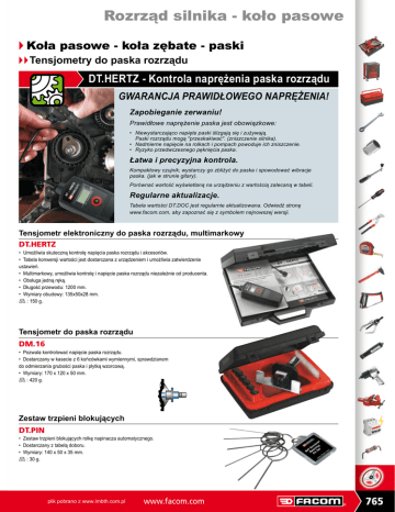 Rozrząd silnika - koło pasowe u Koła pasowe - koła zębate - paski u u Tensjometry do paska rozrządu DT.HERTZ - Kontrola naprężenia paska rozrządu GWARANCJA PRAWIDŁOWEGO NAPRĘŻENIA! Zapobieganie zerwaniu! Prawidłowe naprężenie paska jest obowiązkowe: • • • Niewystarczająco napięte paski ślizgają się i zużywają. Paski rozrządu mogą "przeskakiwać". (zniszczenie silnika). Nadmierne napięcie na rolkach i pompach powoduje ich zniszczenie. Ryzyko przedwczesnego pęknięcia paska. Łatwa i precyzyjna kontrola. Kompaktowy czujnik; wystarczy go zbliżyć do paska i spowodować wibracje paska. (jak w strunie gitary). Porównać wartość wyświetlaną na urządzeniu z wartością zalecaną w tabeli. Regularne aktualizacje. Tabela wartości DT.DOC jest regularnie aktualizowana. Odwiedź stronę www.facom.com, aby zapoznać się z symbolem najnowszej wersji. Tensjometr elektroniczny do paska rozrządu, multimarkowy DT.HERTZ • Umożliwia skuteczną kontrolę napięcia paska rozrządu i akcesoriów. • Tabela konwersji wartości jest dostarczana z urządzeniem i umożliwia zatwierdzenie ustawień. • Multimarkowy, umożliwia kontrolę i napięcie paska rozrządu niezależnie od producenta. • Obsługa jedną ręką. • Długość przewodu: 1200 mm. • Wymiary obudowy: 135x50x28 mm. D : 150 g. Tensjometr do paska rozrządu DM.16 • Pozwala kontrolować napięcie paska rozrządu. • Dostarczany w kasecie z 6 końcówkami wymiennymi, sprawdzianem do odmierzania grubości paska i płytką wzorcową. • Wymiary: 170 x 120 x 50 mm. D : 420 g. Zestaw trzpieni blokujących DT.PIN • Zestaw trzpieni blokujących rolkę napinacza automatycznego. • Dostarczany z tabelą doboru. • Wymiary: 140 x 50 x 35 mm. D : 30 g. plik pobrano z www.imbth.com.pl www.facom.com 765