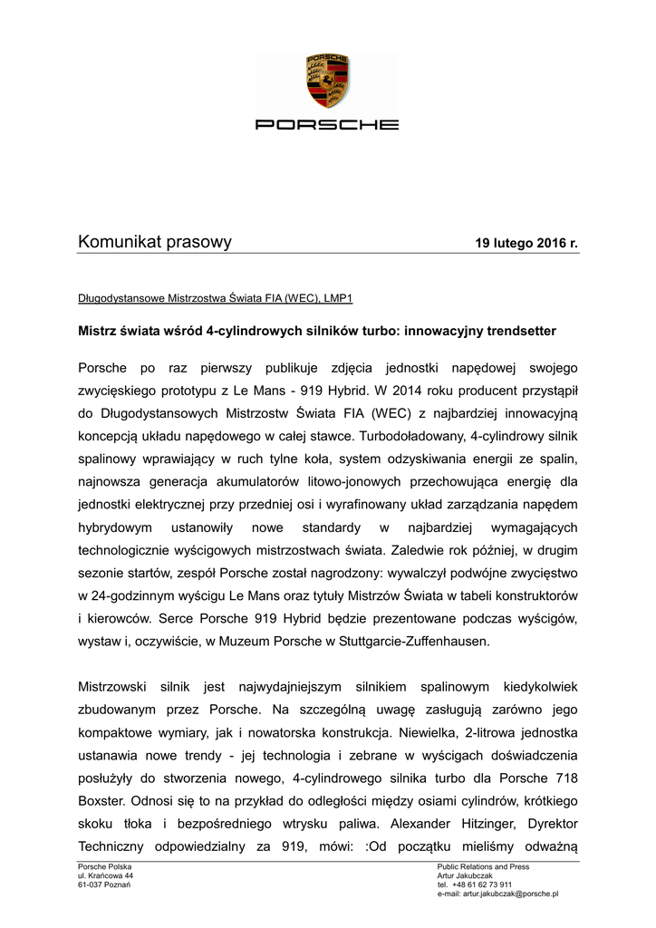 Komunikat prasowy 19 lutego 2016 r. Długodystansowe Mistrzostwa Świata FIA (WEC), LMP1 Mistrz świata wśród 4-cylindrowych silników turbo: innowacyjny trendsetter Porsche po raz pierwszy publikuje zdjęcia jednostki napędowej swojego zwycięskiego prototypu z Le Mans - 919 Hybrid. W 2014 roku producent przystąpił do Długodystansowych Mistrzostw Świata FIA (WEC) z najbardziej innowacyjną koncepcją układu napędowego w całej stawce. Turbodoładowany, 4-cylindrowy silnik spalinowy wprawiający w ruch tylne koła, system odzyskiwania energii ze spalin, najnowsza generacja akumulatorów litowo-jonowych przechowująca energię dla jednostki elektrycznej przy przedniej osi i wyrafinowany układ zarządzania napędem hybrydowym ustanowiły nowe standardy w najbardziej wymagających technologicznie wyścigowych mistrzostwach świata. Zaledwie rok później, w drugim sezonie startów, zespół Porsche został nagrodzony: wywalczył podwójne zwycięstwo w 24-godzinnym wyścigu Le Mans oraz tytuły Mistrzów Świata w tabeli konstruktorów i kierowców. Serce Porsche 919 Hybrid będzie prezentowane podczas wyścigów, wystaw i, oczywiście, w Muzeum Porsche w Stuttgarcie-Zuffenhausen. Mistrzowski silnik jest najwydajniejszym silnikiem spalinowym kiedykolwiek zbudowanym przez Porsche. Na szczególną uwagę zasługują zarówno jego kompaktowe wymiary, jak i nowatorska konstrukcja. Niewielka, 2-litrowa jednostka ustanawia nowe trendy - jej technologia i zebrane w wyścigach doświadczenia posłużyły do stworzenia nowego, 4-cylindrowego silnika turbo dla Porsche 718 Boxster. Odnosi się to na przykład do odległości między osiami cylindrów, krótkiego skoku tłoka i bezpośredniego wtrysku paliwa. Alexander Hitzinger, Dyrektor Techniczny odpowiedzialny za 919, mówi: :Od początku mieliśmy odważną Porsche Polska ul. Krańcowa 44 61-037 Poznań Public Relations and Press Artur Jakubczak tel. +48 61 62 73 911 e-mail: [email protected] koncepcję, ale była to też właściwa koncepcja. I opłaciła się”. Jak każde Porsche, 919 Hybrid zostało opracowane w centrum badań i rozwoju Porsche w Weissach. Zespół Hitzingera ściśle współpracował z inżynierami odpowiedzialnymi za auta seryjne - zwłaszcza w przypadku zagadnień związanych z układem napędowym. „Znacząco skorzystaliśmy z ich wsparcia w obszarach optymalizacji spalania i tworzenia mieszanki” - dodaje Hitzinger. Mimo całego tego pokrewieństwa silnik 919 nie jest bokserem, jak nowa generacja turbodoładowanych „czwórek” w 718 Boxster, ale jednostką widlastą z cylindrami rozwartymi pod kątem 90 stopni. W ubiegłym sezonie, gdy pomógł wywalczyć dla Porsche między innymi 17. w historii zwycięstwo w generalnej klasyfikacji 24godzinnego wyścigu Le Mans, generował moc ponad 500 KM. Tegoroczne przepisy wymusiły jednak ograniczenie ilości energii zużywanej podczas jednego okrążenia i przepływu paliwa we wszystkich prototypach. W przypadku Porsche oznacza to 8proc. zmniejszenie zapotrzebowania na benzynę, a co za tym idzie - spadek mocy poniżej 500 KM. W połączeniu z energią elektryczną z dwóch systemów odzyskiwania (energia hamowania z przednich kół oraz pochodząca ze spalin), służącą do zasilania jednostki elektrycznej przy przedniej osi, obecnie układ napędowy Porsche 919 Hybrid generuje łącznie około 900 KM. Przepisy w topowej klasie mistrzostw WEC (1. klasa prototypów Le Mans, w skrócie: LMP1) wymagają od producentów stosowania napędu hybrydowego. Wymuszają również bezpośrednie powiązanie osiągów prototypów z ich efektywnością energetyczną. Krótko mówiąc, pozwalają wykorzystywać znaczne ilości energii z systemów odzyskiwania. Pociąga to jednak za sobą proporcjonalne ograniczenie dopuszczalnej ilości paliwa przypadającej na każde okrążenie. Regulacje WEC zapewniają inżynierom dużą dozę swobody w zakresie koncepcji napędu hybrydowego. Zespoły mogą wybierać między jednostkami wysokoprężnymi i benzynowymi, wolnossącymi lub doładowanymi, mogą stosować silniki o różnej pojemności, z jednym lub dwoma systemami odzyskiwania energii. Taka dowolność daje pole do rozwijania innowacji, które mają istotny wpływ na przyszłość seryjnych aut sportowych - i to był główny powód, dla którego Porsche zdecydowało się wrócić do najwyższej ligi długodystansowych wyścigów na świecie. Tegoroczna edycja Długodystansowych Mistrzostw Świata FIA (WEC) tradycyjnie rozpoczyna się od prologu na torze Paul Richard na południu Francji. W kulminacyjnym wyścigu sezonu, na liczącym 13,629 km torze w Le Mans, po raz pierwszy od wielu lat zmierzy się aż 60 samochodów. Dłuższy jest też kalendarz mistrzostw: w 2016 roku wyścig WEC po raz pierwszy odbędzie się na torze F1 w Mexico City. Oznacza to, że łącznie zaplanowano 9 rund w 9 państwach. Poza Le Mans wszystkie wyścigi trwają po 6 godzin, a w każdym z nich wystartują po 32 samochody podzielone na 4 klasy. Kalendarz Długodystansowych Mistrzostw Świata FIA (WEC) 25-26.03 prolog, Paul Ricard (Francja) 17.04 6-godzinny wyścig na torze Silverstone (Wielka Brytania) 07.05 6-godzinny wyścig na torze Spa-Francorchamps (Belgia) 05.06 oficjalny dzień testowy w Le Mans (Francja) 18-19.06. 24-godzinny wyścig Le Mans (Francja) 24.07 6-godzinny wyścig na torze Nürburgring (Niemcy) 03.09 6-godzinny wyścig w Mexico City (Meksyk) 17.09 6-godzinny wyścig na torze COTA (Austin, Texas/USA) 16.10 6-godzinny wyścig na torze Fuji (Japonia) 06.11 6-godzinny wyścig w Szanghaju (Chiny) 19.11 6-godzinny wyścig w Bahrajnie (Bahrajn)