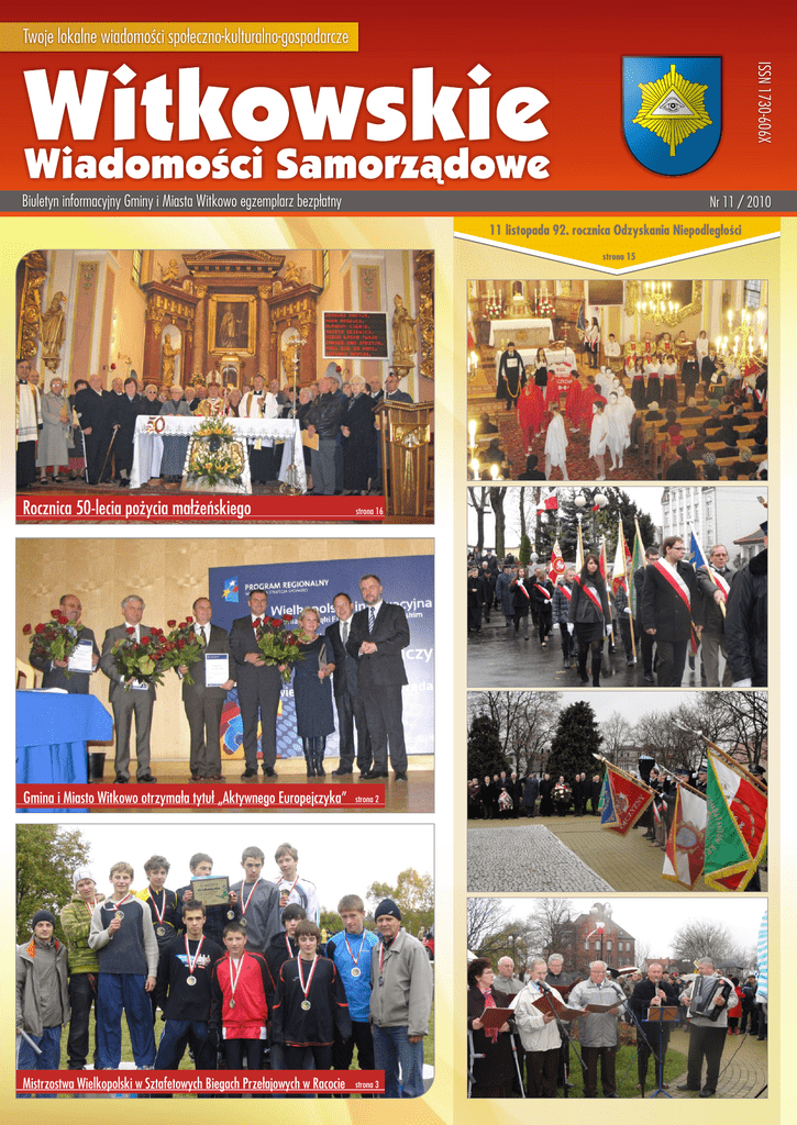 Twoje lokalne wiadomości społeczno-kulturalno-gospodarcze ISSN 1730-606X Biuletyn informacyjny Gminy i Miasta Witkowo egzemplarz bezpłatny Nr 11 / 2010 11 listopada 92. rocznica Odzyskania Niepodległości strona 15 Rocznica 50-lecia pożycia małżeńskiego strona 16 Gmina i Miasto Witkowo otrzymała tytuł „Aktywnego Europejczyka” strona 2 Mistrzostwa Wielkopolski w Sztafetowych Biegach Przełajowych w Racocie strona 3 Aktywny Europejczyk Gmina i Miasto Witkowo otrzymała tytuł „Aktywnego Europejczyka” w kategorii Jednostki Samorządu Terytorialnego - Gmina. Konkurs zorganizował Urząd Marszałkowski Województwa Wielkopolskiego w Poznaniu, a certyfikat odebrał Burmistrz - Krzysztof Szkudlarek. Na podsumowanie wdrażania w roku 2010 Wielkopolskiego Regionalnego Programu Operacyjnego Witkowo zostało uznane, jako najaktywniejszy beneficjent WRPO na lata 2007-2013 i tym samym Gmina została laureatem I miejsca w konkursie. Przy wyborze brano pod uwagę ilość realizowanych projektów, stan i prawidłowość realizacji oraz ich charakter. Gmina zrealizowała projekt zwiększający atrakcyjność turystyczną Gminy Witkowo, poprzez rewitalizację Ośrodka Wypoczynkowego w Skorzęcinie oraz projekt polegający na usprawnieniu technicznym Ochotniczej Straży Pożarnej w Witkowie, poprzez zakup samochodu ratowniczogaśniczego wraz z dodatkowym sprzętem ratowniczym. Wręczenie certyfikatów odbyło się podczas konferencji Wielkopolska innowacyjna zmiana dzięki Funduszom Europejskim, która odbyła się 8 listopada 2010 r. w auli Politechniki Poznańskiej. Podczas konferencji został przedstawiony stan wdrażania WRPO, plany dotyczące kolejnej perspektywy finansowej oraz zostały poruszone zagadnienia związane z nowymi inicjatywami Jessica i Jeremie. Otwarcie zmodernizowanej drogi powiatowej W dniu 9 listopada 2010r. nastąpiło oficjalne otwarcie zmodernizowanej drogi powiatowej Witkowo - Wiekowo - granica Powiatu Słupeckiego - Powidz. Uroczystego przecięcia wstęgi dokonali Krzysztof Ostrowski - Starosta Gnieźnieński, Dariusz Pilak - Wicestarosta Gnieźnieński oraz Krzysztof Szkudlarek - Burmistrz Gminy i Miasta Witkowo i jego zastępca Marian Burmistrz Gminy i Miasta Krzysztof Szkudlarek za pośrednictwem Starosty podziękował Radzie Powiatu Gnieźnieńskiego za podjęcie decyzji o modernizacji tego odcinka drogi. Powiedział między innymi, Gadziński. Jej poświęcenia dokonał ksiądz Stanisław Goc, Proboszcz Witkowskiej Parafii. Wśród świadków wydarzenia nie zabrakło m.in. witkowskich i gnieźnieńskich radnych, mieszkańców Witkowa oraz wykonawców inwestycji. Zmodernizowany odcinek, to sześć kilometrów nowej nawierzchni, której koszt pochłonął trzy i pół miliona złotych, z czego prawie połowa pochodziła z dofinansowania przez powiat gnieźnieński, który postarał się o pieniądze z Wojewódzkiego Regionalnego Programu Operacyjnego. że droga ta dla naszych mieszkańców jest bardzo ważna. Jej wcześniejszy stan techniczny był nieciekawy. Stwarzała zagrożenie i to było koniecznością żeby ją zmodernizować. Cieszymy się, że powiat gnieźnieński podjął taką decyzję i pozyskując również środki unijne zmodernizował ją. Obecnie droga jest poszerzona, ma ścieżkę rowerową, chodniki, a to na pewno znacznie zwiększy bezpieczeństwo kierowców i mieszkańców. (S.M.) (na) 11-2010 str. 2 Bądź bezpieczny na drodze W ramach działań profilaktycznych Urząd Gminy i Miasta w Witkowie z myślą o bezpieczeństwie najmłodszych uczniów szkół podstawowych zakupił książeczki:„Bądź bezpieczny na drodze”. Dnia 9 listopada 2010r. w Szkole Podstawowej Nr 2 i w Szkole Podstawowej Nr 3 w Witkowie odbyły się spotkania uczniów klas I i II z przedstawicielem tut. Urzędu oraz policjantami z Komisariatu Policji w Witkowie, podczas których przypomniano dzieciom o najważniejszych zasadach poruszania się na drodze i rozdano stosowne książeczki. Uczniowie natychmiast zabrali się do rozwiązywania rebusów i krzyżówek, aby móc otrzymać dyplom za zdobycie wiadomości o zasadach poruszania się na drodze oraz bezbłędne rozwiązanie wszystkich zadań zawartych w książeczce. (M.P.) Mistrzostwa Wielkopolski w Sztafetowych Biegach Przełajowych w Racocie Kolejny duży sukces odnieśli witkowscy gimnazjaliści. I tym razem sztafeta dziewcząt i chłopców nie zawiodła. Zarówno jedni, jak i drudzy znaleźli się na podium Mistrzostw Wielkopolski w Sztafetowych Biegach Przełajowych w Racocie. Mistrzostwa Powiatu w Gnieźnie były kluczem do Mistrzostw Wielkopolski. Nasi gimnazjaliści zdołali z nich awansować do finałowej rozgrywki. Chłopcy zajęli pierwsze, a dziewczęta drugie miejsce. Witkowianie stanęli na podium już szósty rok z rzędu. W Racocie wystąpiły najlepsze sztafety Wielkopolski. Witkowianie odnieśli sukces. Chłopcy zajęli drugie, a dziewczyny trzecie miejsce. Miejsca na podium w obu kategoriach zajęły ekipy z trzech miast. W kategorii chłopców kolejność była następująca: Żerków, Witkowo, Jarocin. W kategorii dziewcząt także bezkonkurencyjny był Żerków, a za nim Jarocin i Witkowo. Czternasta lokata przypadła dziewczynom z Ostrowitego, a ósma chłopcom z Ostrowitego. Wśród szkół podstawowych dobrą dwunastą pozycję zdobyła mieszana sztafeta ze Strzałkowa. Słupeckie dziewczęta z ZSE zajęły dwudzieste miejsce, a chłopcy ze strzałkowskiego ZSP dwudzieste czwarte. str. 3 Skład drużyny dziewczyn z Gimnazjum im. Adama Borysa w Witkowie: Katarzyna Kiestrzyńska, Oliwia Majchrzak, Patrycja Majchrzak, Jagoda Wojtas, Oliwia Chęś, Joanna Robaszkiewicz, Malwina Welter, Dominika Tubacka, Paulina Plucińska, Martyna Galant i rezerwowe Weronika Piniarska, Monika Zamiara, Natalia Kościecha. Skład drużyny chłopców: Marcin Kaptur, Mateusz Pietrowski, Jakub Łysiak, Mariusz Starczewski, Rafał Kaźmierczak, Szymon Grzechowiak, Jakub Bartczak, Michał Marszałek, Patryk Sobcz