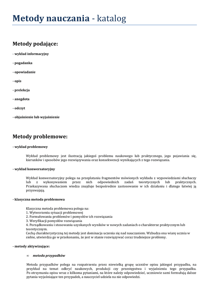Metody nauczania - katalog Metody podające: - wykład informacyjny - pogadanka - opowiadanie - opis - prelekcja - anegdota - odczyt - objaśnienie lub wyjaśnienie Metody problemowe: - wykład problemowy Wykład problemowy jest ilustracją jakiegoś problemu naukowego lub praktycznego, jego pojawiania się, kierunków i sposobów jego rozwiązywania oraz konsekwencji wynikających z tego rozwiązania. - wykład konwersatoryjny Wykład konwersatoryjny polega na przeplataniu fragmentów mówionych wykładu z wypowiedziami słuchaczy lub z wykonywaniem przez nich odpowiednich zadań teoretycznych lub praktycznych. Przekazywana słuchaczom wiedza znajduje bezpośrednie zastosowanie w ich działaniu i dlatego łatwiej ją przyswajają. - klasyczna metoda problemowa Klasyczna metoda problemowa polega na: 1. Wytworzeniu sytuacji problemowej 2. Formułowaniu problemów i pomysłów ich rozwiązania 3. Weryfikacji pomysłów rozwiązania 4. Porządkowaniu i stosowaniu uzyskanych wyników w nowych zadaniach o charakterze praktycznym lub teoretycznym. Cechą charakterystyczną tej metody jest dominacja uczenia się nad nauczaniem. Wzbudza ona wiarę ucznia w siebie, utwierdza go w przekonaniu, że jest w stanie rozwiązywać coraz trudniejsze problemy. - metody aktywizujące: • metoda przypadków Metoda przypadków polega na rozpatrzeniu przez niewielką grupę uczniów opisu jakiegoś przypadku, na przykład na temat odkryć naukowych, produkcji czy przestępstwa i wyjaśnieniu tego przypadku. Po otrzymaniu opisu wraz z kilkoma pytaniami, na które należy odpowiedzieć, uczniowie sami formułują dalsze pytania wyjaśniające ten przypadek, a nauczyciel udziela na nie odpowiedzi. • metoda sytuacyjna Metoda sytuacyjna polega na wprowadzeniu uczniów w jakąś złożoną sytuację, za której takim lub innym rozwiązaniem przemawiają racje „za” i „przeciw”. Zadanie uczniów polega na zrozumieniu tej sytuacji oraz podjęciu decyzji w sprawie jej rozwiązania. Następnie uczniowie muszą przewidzieć skutki tej decyzji. Metoda ta doskonale może sprawdzić się podczas realizacji zadań przygotowujących uczniów do wyboru dalszego kierunku kształcenia. • inscenizacja Metoda inscenizacji polega na graniu roli w sytuacji fikcyjnej. Istotnym czynnikiem w tej metodzie jest odtwarzanie przez uczniów zachowań jakiejś postaci, wcielenie się w nią, przejęcie na siebie jej roli. Inscenizacje o charakterze realnym służą do odtwarzania wydarzeń historycznych, biografii sławnych ludzi, funkcjonowania instytucji lub organizacji. Inscenizacje o charakterze fikcyjnym stosuje się w odtwarzaniu bajek, legend, utworów literackich, scen z życia. Celem tej metody może być poznanie czegoś nowego, przeżycie lub udzielenie komuś pomocy terapeutycznej. • • • gry dydaktyczne seminarium dyskusja dydaktyczna - związana z wykładem - okrągłego stołu Dyskusja okrągłego stołu to jedna z odmian dyskusji, której uczestnicy reprezentują odmienne, często przeciwstawne poglądy na określony temat. Jej celem jest znalezienie stanowiska słusznego, możliwego do przyjęcia przez obie strony. Cechą charakterystyczną tej metody jest to, że uczestnicy dyskusji zasiadają wokół okrągłego stołu lub w kręgu. Takie usytuowanie dyskutantów zakłada z góry, że racje obu stron są jednakowo ważne, a celem spotkania jest wypracowanie wspólnych ustaleń możliwych do zaakceptowania przez obie strony. - wielokrotna Polega na podziale uczniów na dwie grupy reprezentujące dwa odmienne stanowiska na dany temat. Każda z grup przygotowuje stosowne argumenty i stara się przekonać do swych racji przeciwników. - burza mózgów Polega na zebraniu jak największej ilości pomysłów celem rozwiązania jakiegoś problemu - panelowa Charakteryzuje ją istnienie dwóch ciał: - dyskutujących ekspertów (panel) - uczących się słuchaczy (audytorium). Najpierw wypowiadają się eksperci, wprowadzając w temat, potem dyskutują między sobą, a następnie głos może zabierać każda osoba z audytorium. - metaplan Metaplan - jedna z technik prowadzenia dyskusji zwana inaczej „cichą dyskusją". Polega ona na tym, że w czasie narady jej uczestnicy tworzą plakat, który jest graficznym skrótem dyskusji. Uczestnicy dyskusji zamiast zabierać głos, zapisują swoje myśli na kartkach określonego kształtu i koloru w krótkiej formie równoważników zdań. Następnie przypinają te kartki do arkusza papieru umieszczonego na tablicy lub planszy. Metody eksponujące: - film - sztuka teatralna - ekspozycja - pokaz połączony z przeżyciem Metody programowane: - z użyciem komputera - z użyciem maszyny dydaktycznej - z użyciem podręcznika programowanego Metody praktyczne: - pokaz Pokaz polega na demonstrowaniu uczniom naturalnych przedmiotów lub ich modeli, zjawisk, wydarzeń lub procesów i objaśnianiu ich istotnych cech. - ćwiczenia przedmiotowe Ćwiczenia przedmiotowe polegają na wielokrotnym wykonywaniu pewnych czynności dla nabycia wprawy i uzyskania coraz wyższej sprawności w działaniach intelektualnych i praktycznych. Szczególną rolę odgrywają w nauczaniu zasad ortografii, matematyki i języków obcych. - ćwiczenia laboratoryjne Podczas ćwiczeń laboratoryjnych uczniowie samodzielnie przeprowadzają eksperymenty biologiczne, chemiczne czy fizyczne. Eksperymenty te pozwalają na formułowanie pewnych uogólnień, zilustrowanie wcześniej poznanych praw, zasad i reguł (tradycyjna metoda laboratoryjna) oraz ułatwiają uczniom przewidywanie nie znanych im jeszcze zjawisk i procesów (problemowa metoda laboratoryjna). - ćwiczenia produkcyjne Ćwiczenia produkcyjne sprowadzają się do bezpośredniej realizacji zadań wytwórczych. Przebiegają one według następującego schematu: - uświadomienie sobie przez uczniów celu, warunków i środków oraz efektu końcowego realizacji danegozadania - opracowanie projektów, rysunków i modeli prac, które mają być wykonane