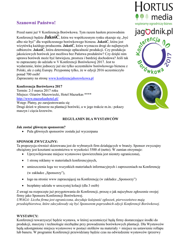 Szanowni Państwo! Przed nami już V Konferencja Borówkowa. Tym razem hasłem przewodnim Konferencji będzie JakośĆ, która we współczesnym rynku okazuje się „być albo nie być” dla współczesnego borówkowego biznesu. JakośĆ, która jest wizytówką każdego producenta. JakośĆ, która wyznacza drogi do najlepszych odbiorców. JakośĆ, która determinuje opłacalność produkcji. Czy produkcja jakościowych borówek jest możliwa bez Państwa produktów? Czy dzięki nim uprawa borówek może być łatwiejsza, prostsza i bardziej dochodowa? Jeśli tak to zapraszamy do udziału w V Konferencji Borówkowej 2017. Jest to wydarzenie, które jednoczy już nie tylko uczestników borówkowego biznesu z Polski, ale z całej Europy. Przypomnę tylko, że w edycji 2016 uczestniczyło ponad 700 osób! Zapraszamy na stronę www.konferencjaborowkowa.pl Konferencja Borówkowa 2017 Termin: 2-3 marca 2017 roku Miejsce: Ożarów Mazowiecki, Hotel Mazurkas **** http://www.mazurkashotel.pl/ Wstęp: Płatny, po zarejestrowaniu się Drugi dzień w plenerze na plantacji borówki, a w jego trakcie m.in.: pokazy maszyn i cięcia krzewów. REGULAMIN DLA WYSTAWCÓW Jak zostać głównym sponsorem? Pula głównych sponsorów została już wyczerpana SPONSOR ZWYCZAJNY: Ta propozycja również skierowana jest do wybranych firm działających w branży. Sponsor zwyczajny obciążony jest kosztami uczestnictwa w wysokości 5500 zł (netto). W zamian otrzymuje: Uprzywilejowane miejsce wystawowe (powierzchnia jest niestety ograniczona), 1 stronę reklamy w materiałach konferencyjnych, umieszczenia loga we wszystkich materiałach informacyjnych i zaproszeniach na Konferencję (w zakładce „Sponsorzy”), logo na stronie www zapraszającej na Konferencję (w zakładce „Sponsorzy”) bezpłatny udziału w uroczystej kolacji (dla 3 osób) Z uwagi na rozpoczęte już przygotowania do Konferencji, proszę o jak najszybsze zgłoszenie swojej firmy jako Sponsora Konferencji Borówkowej. UWAGA: Liczba firma jest ograniczona, decyduje kolejność zgłoszeń, pierwszeństwo mają przedsiębiorstwa, które zdecydowały się być Sponsorem poprzednich edycji Konferencji Borówkowej. WYSTAWCY: Konferencji towarzyszyć będzie wystawa, w której uczestniczyć będą firmy dostarczające środki do produkcji, maszyny i technologie niezbędne przy prowadzeniu borówkowych plantacji. Dla Wystawców będą udostępnione miejsca wystawowe w postaci stolików na materiały + miejsce na ustawienie rollapu lub baneru. W programie Konferencji przewidziany będzie czas na odwiedzenie wystawców (przerwy kawowe, obiadowa, czas przed rozpoczęciem Konferencji). Koszt wykupienia miejsca wystawowego wynosi 2500 zł (netto). Ponadto dla każdej firmy/wystawcy przepadać będą 2 zaproszenia na uroczystą wieczorną kolację w Hotelu MAZURKAS. Uwaga: LICZBA MIEJSC WYSTAWOWYCH JEST OGRANICZONA, KOLEJNOŚĆ ZGŁOSZEŃ DECYDUJE O PRZYDZIALE MIEJSCA WYSTAWOWEGO! Zgłoszenia przyjmowane poprzez elektroniczną rejestrację na stronie http://www.konferencjaborowkowa.pl/dla-wystawcow/ Pokazy w plenerze Drugi dzień Konferencji będzie się odbywał w plenerze na plantacji borówki. Będzie też możliwość (na ile pozwolą warunki pogodowe) prezentacji maszyn typu, rozdrabniacze, przyczepki, ciągniki, sekatory itp. Podczas pokazów będzie też możliwość krótkiego scharakteryzowania prezentowanych produktów na forum publicznym. Koszt udziału w pokazach wynosi 1200 zł/firmy – możliwość prezentacji maksymalnie 3 produktów. Reklama w materiałach konferencyjnych Dla wszystkich uczestników Konferencji zostaną przygotowane materiały zawierające streszczenia wykładów wygłoszonych w trakcie jej trwania. Materiały będą przygotowane i wydane przez firmę Hortus Media, format B5, kolor, nakład 1000 egzemplarzy. Egzemplarze, które pozostaną po Konferencji, będą sprzedawane m.in. za pośrednictwem portalu jagodnik.pl. Koszt reklamy w materiałach konferencyjnych: 1 strona – 1200 zł (netto) ½ strony – 700 zł (netto) Materiały reklamowe prosimy dostarczyć nie później jak do 31 stycznia 2017 roku. Zapraszamy do wykupu pakietów – WAŻNE DO 20 STYCZNIA: Miejsce wystawowe Pakiet podstawowy Pakiet Srebrny ☺ miejsce wystawowe ☺ miejsce wystawowe ☺ miejsce wystawowe ☺ udział w uroczystej ☺ udział w uroczystej ☺ udział w uroczystej kolacji dla 2 osób kolacji dla 2 osób kolacji dla 2 osób ☺ 1 strona reklamy w ☺ udział w pokazach materiałach plenerowych konferencyjnych 2400 zł (+ Vat) 3400 zł (+ Vat) 3400 zł (+ Vat) Pakiet Złoty ☺ miejsce wystawowe ☺ udział w uroczystej kolacji dla 2 osób ☺ 1 strona reklamy w materiałach konferencyjnych ☺ udział w pokazach plenerowych 4400 zł (+ Vat) oszczędzasz 200 zł oszczędzasz 200 zł oszczędzasz 400 zł UWAGA: Warunkiem uczestnictwa w Konferencji jest opłacenie wybranych usług do 15 lutego 2017 roku, według wystawionej Faktury zaliczki. Wybierz pakiet i zarejestruj się wypełniając Formularz Kontakt: [email protected] /608 500 501