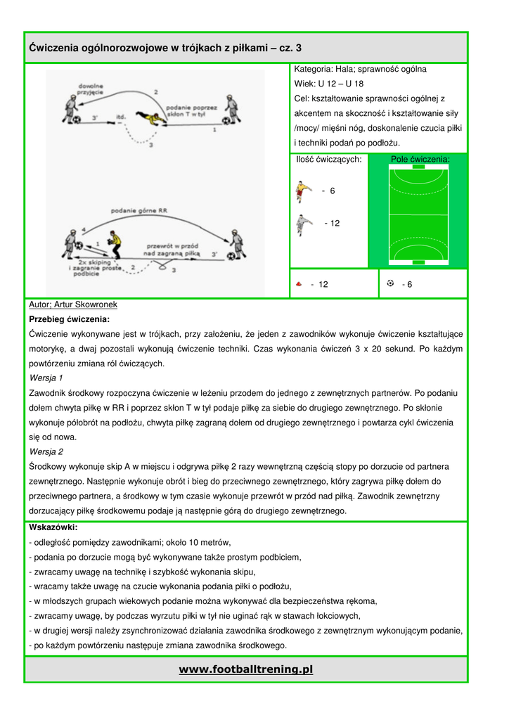 Ćwiczenia ogólnorozwojowe w trójkach z piłkami – cz. 3 Kategoria: Hala; sprawność ogólna Wiek: U 12 – U 18 Cel: kształtowanie sprawności ogólnej z akcentem na skoczność i kształtowanie siły /mocy/ mięśni nóg, doskonalenie czucia piłki i techniki podań po podłożu. Ilość ćwiczących: Pole ćwiczenia: - 6 - 12 - 12 -6 Autor; Artur Skowronek Przebieg ćwiczenia: Ćwiczenie wykonywane jest w trójkach, przy założeniu, że jeden z zawodników wykonuje ćwiczenie kształtujące motorykę, a dwaj pozostali wykonują ćwiczenie techniki. Czas wykonania ćwiczeń 3 x 20 sekund. Po każdym powtórzeniu zmiana ról ćwiczących. Wersja 1 Zawodnik środkowy rozpoczyna ćwiczenie w leżeniu przodem do jednego z zewnętrznych partnerów. Po podaniu dołem chwyta piłkę w RR i poprzez skłon T w tył podaje piłkę za siebie do drugiego zewnętrznego. Po skłonie wykonuje półobrót na podłożu, chwyta piłkę zagraną dołem od drugiego zewnętrznego i powtarza cykl ćwiczenia się od nowa. Wersja 2 Środkowy wykonuje skip A w miejscu i odgrywa piłkę 2 razy wewnętrzną częścią stopy po dorzucie od partnera zewnętrznego. Następnie wykonuje obrót i bieg do przeciwnego zewnętrznego, który zagrywa piłkę dołem do przeciwnego partnera, a środkowy w tym czasie wykonuje przewrót w przód nad piłką. Zawodnik zewnętrzny dorzucający piłkę środkowemu podaje ją następnie górą do drugiego zewnętrznego. Wskazówki: - odległość pomiędzy zawodnikami; około 10 metrów, - podania po dorzucie mogą być wykonywane także prostym podbiciem, - zwracamy uwagę na technikę i szybkość wykonania skipu, - wracamy także uwagę na czucie wykonania podania piłki o podłożu, - w młodszych grupach wiekowych podanie można wykonywać dla bezpieczeństwa rękoma, - zwracamy uwagę, by podczas wyrzutu piłki w tył nie uginać rąk w stawach łokciowych, - w drugiej wersji należy zsynchronizować działania zawodnika środkowego z zewnętrznym wykonującym podanie, - po każdym powtórzeniu następuje zmiana zawodnika środkowego. www.footballtrening.pl