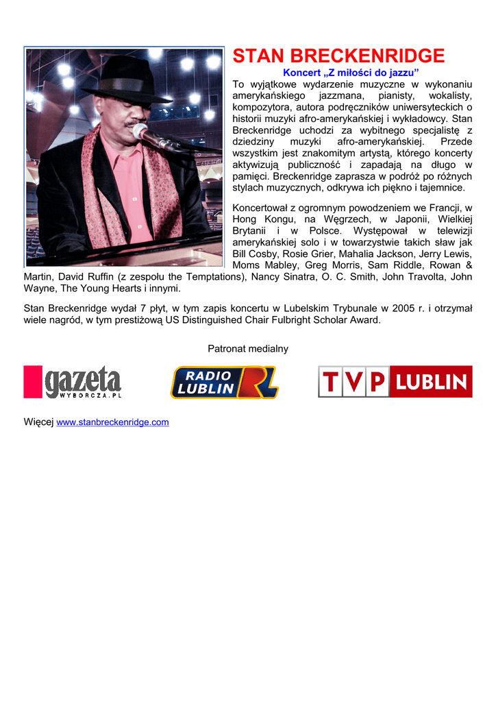 STAN BRECKENRIDGE Koncert „Z miłości do jazzu” To wyjątkowe wydarzenie muzyczne w wykonaniu amerykańskiego jazzmana, pianisty, wokalisty, kompozytora, autora podręczników uniwersyteckich o historii muzyki afro-amerykańskiej i wykładowcy. Stan Breckenridge uchodzi za wybitnego specjalistę z dziedziny muzyki afro-amerykańskiej. Przede wszystkim jest znakomitym artystą, którego koncerty aktywizują publiczność i zapadają na długo w pamięci. Breckenridge zaprasza w podróż po różnych stylach muzycznych, odkrywa ich piękno i tajemnice. Koncertował z ogromnym powodzeniem we Francji, w Hong Kongu, na Węgrzech, w Japonii, Wielkiej Brytanii i w Polsce. Występował w telewizji amerykańskiej solo i w towarzystwie takich sław jak Bill Cosby, Rosie Grier, Mahalia Jackson, Jerry Lewis, Moms Mabley, Greg Morris, Sam Riddle, Rowan & Martin, David Ruffin (z zespołu the Temptations), Nancy Sinatra, O. C. Smith, John Travolta, John Wayne, The Young Hearts i innymi. Stan Breckenridge wydał 7 płyt, w tym zapis koncertu w Lubelskim Trybunale w 2005 r. i otrzymał wiele nagród, w tym prestiżową US Distinguished Chair Fulbright Scholar Award. Patronat medialny Więcej www.stanbreckenridge.com Zdjęcia z koncertu w Trybunale Koronnym w Lublinie – grudzień 2005