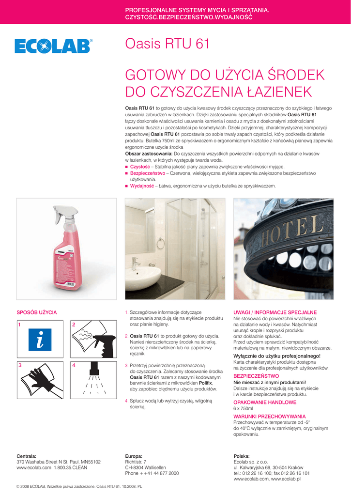 PROFESJONALNE SYSTEMY MYCIA I SPRZĄTANIA. CZYSTOŚĆ.BEZPIECZEŃSTWO.WYDAJNOŚĆ Oasis RTU 61 GOTOWY DO UŻYCIA ŚRODEK DO CZYSZCZENIA ŁAZIENEK Oasis RTU 61 to gotowy do użycia kwasowy środek czyszczący przeznaczony do szybkiego i łatwego usuwania zabrudzeń w łazienkach. Dzięki zastosowaniu specjalnych składników Oasis RTU 61 łączy doskonałe właściwości usuwania kamienia i osadu z mydła z doskonałymi zdolnościami usuwania tłuszczu i pozostałości po kosmetykach. Dzięki przyjemnej, charakterystycznej kompozycji zapachowej Oasis RTU 61 pozostawia po sobie trwały zapach czystości, który podkreśla działanie produktu. Butelka 750ml ze spryskiwaczem o ergonomicznym kształcie z końcówką pianową zapewnia ergonomiczne użycie środka Obszar zastosowania: Do czyszczenia wszystkich powierzchni odpornych na działanie kwasów w łazienkach, w których występuje twarda woda. Czystość – Stabilna jakość piany zapewnia zwiększone właściwości myjące. Bezpieczeństwo – Czerwona, wielojęzyczna etykieta zapewnia zwiększone bezpieczeństwo użytkowania. Wydajność – Łatwa, ergonomiczna w użyciu butelka ze spryskiwaczem. SPOSÓB UŻYCIA 1 2 1. Szczegółowe informacje dotyczące stosowania znajdują się na etykiecie produktu oraz planie higieny. 2. Oasis RTU 61 to produkt gotowy do użycia. Nanieś nierozcieńczony środek na ścierkę, ścierkę z mikrowłókien lub na papierowy ręcznik. 3 4 3. Przetrzyj powierzchnię przeznaczoną do czyszczenia. Zalecamy stosowanie środka Oasis RTU 61 razem z naszymi kodowanymi barwnie ścierkami z mikrowłókien Polifix, aby zapobiec błędnemu użyciu produktów. 4. Spłucz wodą lub wytrzyj czystą, wilgotną ścierką. UWAGI / INFORMACJE SPECJALNE Nie stosować do powierzchni wrażliwych na działanie wody i kwasów. Natychmiast usunąć krople i rozpryski produktu oraz dokładnie spłukać. Przed użyciem sprawdzić kompatybilność materiałową na małym, niewidocznym obszarze. Wyłącznie do użytku profesjonalnego! Karta charakterystyki produktu dostępna na życzenie dla profesjonalnych użytkowników. BEZPIECZEŃSTWO Nie mieszać z innymi produktami! Dalsze instrukcje znajdują się na etykiecie i w karcie bezpieczeństwa produktu. OPAKOWANIE HANDLOWE 6 x 750ml WARUNKI PRZECHOWYWANIA Przechowywać w temperaturze od -5° do 40°C wyłącznie w zamkniętym, oryginalnym opakowaniu. Centrala: 370 Washaba Street N St. Paul, MN55102 www.ecolab.com 1.800.35.CLEAN Europa: Richtistr. 7 CH-8304 Wallisellen Phone ++41 44 877 2000 © 2008 Ecolab, Wszelkie prawa zastrzeżone. Oasis RTU 61. 10.2008. PL Polska: Ecolab sp. z o.o. ul. Kalwaryjska 69, 30-504 Kraków tel.: 012 26 16 100; fax 012 26 16 101 www.ecolab.com, www.ecolab.pl