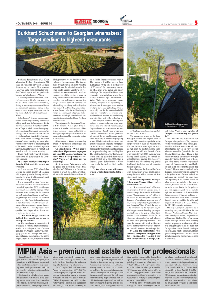 NOVEMBER 2011 ISSUE #9 MONTHLY SUPPLEMENT TO GEORGIA TODAY Burkhard Schuchmann to Georgian winemakers: Target medium to high-end restaurants Burkhard Schuchmann, 69, CEO of Alternative Railway Investments AG based in Frankfurt arrived in Georgia five years ago as a tourist. Now he owns a vineyard and a wine plant in the vinerich Kakheti region and his product is branded as Schuchmann – Wines. According to the businessman, Georgia’s investment friendly environment the effective reforms and initiatives, aiming at improving investment climate and sustainable economic policy in the country, have played the major role in the successful start of Schuchmann – Wines. Schuchmann’s German business represents a financing company for railway rolling stock and infrastructure. He is also Vice Chairman of the Board of Patentes Talgo a Madrid-based company, which produces high speed trains. After retiring from some other major executive industrial activities in 2005 he started to think about realizing “old-time dreams” about starting an own wine business somewhere “in an exciting part of the world.” So he came back again to Georgia, bought a winery in Kakheti and started to make his dream a reality. Invest Today interviewed Schuchmann about his experience in the Georgian business. Q: Can you recall your first trip to Georgia. What made the biggest impression? A: It was autumn 2006 when I discovered the small country of Georgia with its great potential, history, culture, hospitality, wine traditions and great nation full of hope and love. It was a coincidence that during the famous railway fair Innotrans in Berlin I attended September 2006, a colleague drew my attention to the Georgia rather unknown wine country in the western world. Months later I found myself traveling through this country for the first time in my life. As an industrial manager from the world of rail I was quite unprepared for the unspoilt natural beauty that greeted me. I vividly recall how quickly I developed close ties to the country and its people. Q: You are running a business in Kakheti. How easy it was for you to develop this business? A: For my dream to materialize, I succeeded in forming a remarkable successful cooperating Georgian - German team led by Angeles Tegtmeyer, managing partner and George Dakishvili, winemaker and inspiration of the entire project. He is, in fact, winemaker in the third generation of his family to have embraced the profession. The investment project started in 2008 with the acquisition of the wine fields and at that time small winery Vinoterra in Kisiskhevi. In 2009 we started a total reconstruction of the existing winery by using details of modern and traditional east Georgian architecture, constructing a large new wine cellar where brand new winemaking machinery and bottling line was installed, and building an additional new Kvevri cellar for Kakhetian style wines and erasing of integrated hotelrestaurant with high sophisticated services for international and local food and wine travelers. The major role for the successful start of Schuchmann - Wines played the investment friendly environment, effective government reforms and initiatives, aiming at improving the investment climate and sustainable economic policy in the country. Schuchmann – Wines counts today about 35 permanent employees and about 100 seasonal workers. Q: Schuchmann – Wines counts today about 35 permanent employees and about 100 seasonal workers as we know. What is the production volume? Which sort of wines are you producing? A: Schuchmann Wines owns both, the plants and the winery with a total wine land of 120 hectares at the two locations, of which 66 hectares are planted; about 51 ha are in Napareuli and 15 ha in Shilda. The rest serves as a reserve. The chateau in Kisiskhevi covers about 1.2 hectares. At the time of the takeover of “Vinoterra”, the chateau only consisted of a small wine cellar and empty buildings. The original buildings were completely renovated and comprehensively expanded by Schuchmann – Wines. Today, the entire complex is consistently designed in the typical regional style and is equipped with modern western European technology. This is especially true for the production buildings and warehouses, which are . equipped with modern air conditioning and viticulture and cellar technology. The complex contains two Qvevri cellars, two wine cellars, an open warehouse and two closed warehouses, a degustation room, a restaurant, various guest rooms, a laundry and a Georgian bakery. Schuchmann Wines possesses all state-of-the-art machines and equipment necessary to produce high quality wines. This include a de-stemming machine, segregation lines and wine presses, stainless steel tanks , qvevris and barriques for fermentation and aging and a complete labeling and bottling line. The total production of our high quality wines shall be extended from todays about 400,000 up to 600,000 bottles in the next years. Schuchmann – Wines completely focused on high quality wines. Q: And where are you selling your wines? What is the price of a bottle of wine? Burkhard Schuchmann owner of Schuchmann – Wines A: The local ex cellar prices per bottle run from 7 to 30 lari. We market our wines on the local Georgian Market and export them to former CIS countries, especially in the larger countries such as Kazakhstan, Ukraine, Belarus, Azerbaijan and more as well as in the most interesting European markets with the fantastic Georgian wine story of 8,000 years in wine history in this country, the special and autochthonous grapes, like Saperavi, Rkatsiteli and Kisi and the very special traditional Kachetian way of fermentation in Qvervis. In the long-run the demand for Georgian high quality wines could significantly increase with a reversal of Russia’s export ban. Q: As we know you have developed 2Ha project. Can you tell our readers what is it about? A: “Schuchmann Invest” - The new investment activity in 
