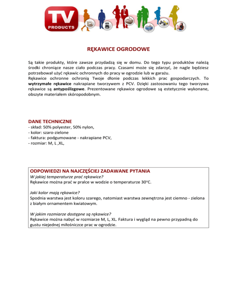 RĘKAWICE OGRODOWE Są takie produkty, które zawsze przydadzą się w domu. Do tego typu produktów należą środki chroniące nasze ciało podczas pracy. Czasami może się zdarzyć, że nagle będziesz potrzebował użyć rękawic ochronnych do pracy w ogrodzie lub w garażu. Rękawice ochronne ochronią Twoje dłonie podczas lekkich prac gospodarczych. To wytrzymałe rękawice nakrapiane tworzywem z PCV. Dzięki zastosowaniu tego tworzywa rękawice są antypoślizgowe. Prezentowane rękawice ogrodowe są estetycznie wykonane, obszyte materiałem skóropodobnym. DANE TECHNICZNE - skład: 50% polyester, 50% nylon, - kolor: szaro-zielone - faktura: podgumowane - nakrapiane PCV, - rozmiar: M, L ,XL, ODPOWIEDZI NA NAJCZĘŚCIEJ ZADAWANE PYTANIA W jakiej temperaturze prać rękawice? Rękawice można prać w pralce w wodzie o temperaturze 30oC. Jaki kolor mają rękawice? Spodnia warstwa jest koloru szarego, natomiast warstwa zewnętrzna jest ciemno - zielona z białym ornamentem kwiatowym. W jakim rozmiarze dostępne są rękawice? Rękawice można nabyć w rozmiarze M, L, XL. Faktura i wygląd na pewno przypadną do gustu niejednej miłośniczce prac w ogrodzie.