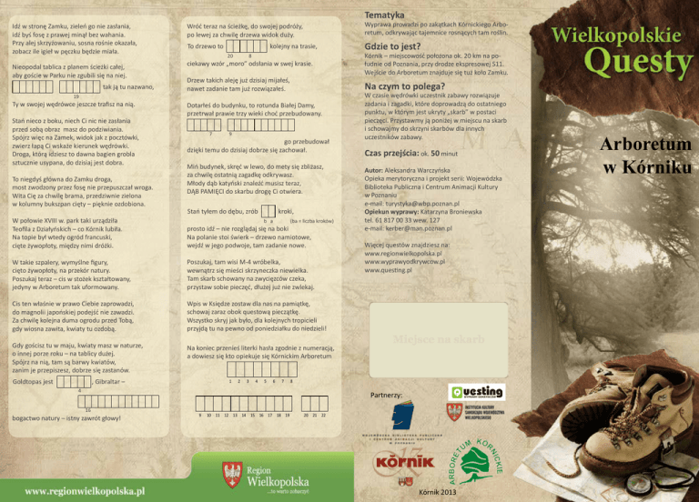 Tematyka Idź w stronę Zamku, zieleń go nie zasłania, idź byś fosę z prawej minął bez wahania. Przy alej skrzyżowaniu, sosna rośnie okazała, zobacz ile igieł w pęczku będzie miała. Wróć teraz na ścieżkę, do swojej podróży, po lewej za chwilę drzewa widok duży. Wyprawa prowadzi po zakątkach Kórnickiego Arboretum, odkrywając tajemnice rosnących tam roślin. To drzewo to Gdzie to jest? Nieopodal tablica z planem ścieżki całej, aby goście w Parku nie zgubili się na niej. ciekawy wzór „moro” odsłania w swej krasie. tak ją tu nazwano, kolejny na trasie, 20 8 Drzew takich aleję już dzisiaj mijałeś, nawet zadanie tam już rozwiązałeś. Na czym to polega? 19 Ty w swojej wędrówce jeszcze trafisz na nią. Stań nieco z boku, niech Ci nic nie zasłania przed sobą obraz masz do podziwiania. Spójrz więc na Zamek, widok jak z pocztówki, zwierz łapą Ci wskaże kierunek wędrówki. Droga, którą idziesz to dawna bagien grobla sztucznie usypana, do dzisiaj jest dobra. To niegdyś główna do Zamku droga, most zwodzony przez fosę nie przepuszczał wroga. Wita Cię za chwilę brama, przedziwnie zielona w kolumny bukszpan cięty – pięknie ozdobiona. Dotarłeś do budynku, to rotunda Białej Damy, przetrwał prawie trzy wieki choć przebudowany. 7 9 go przebudował dzięki temu do dzisiaj dobrze się zachował. Miń budynek, skręć w lewo, do mety się zbliżasz, za chwilę ostatnią zagadkę odkrywasz. Młody dąb katyński znaleźć musisz teraz, DĄB PAMIĘCI do skarbu drogę Ci otwiera. Stań tyłem do dębu, zrób kroki, W połowie XVIII w. park taki urządziła Teofila z Działyńskich – co Kórnik lubiła. Na topie był wtedy ogród francuski, cięte żywopłoty, między nimi dróżki. prosto idź – nie rozglądaj się na boki Na polanie stoi świerk – drzewo namiotowe, wejdź w jego podwoje, tam zadanie nowe. W takie szpalery, wymyślne figury, cięto żywopłoty, na przekór natury. Poszukaj teraz – cis w stożek kształtowany, jedyny w Arboretum tak uformowany. Poszukaj, tam wisi M-4 wróbelka, wewnątrz się mieści skrzyneczka niewielka. Tam skarb schowany na zwycięzców czeka, przystaw sobie pieczęć, dłużej już nie zwlekaj. Cis ten właśnie w prawo Ciebie zaprowadzi, do magnolii japońskiej podejść nie zawadzi. Za chwilę kolejna duma ogrodu przed Tobą, gdy wiosna zawita, kwiaty tu ozdobą. Wpis w Księdze zostaw dla nas na pamiątkę, schowaj zaraz obok questową pieczątkę. Wszystko skryj jak było, dla kolejnych tropicieli przyjdą tu na pewno od poniedziałku do niedzieli! Gdy gościsz tu w maju, kwiaty masz w naturze, o innej porze roku – na tablicy dużej. Spójrz na nią, tam są barwy kwiatów, zanim je przepiszesz, dobrze się zastanów. Na koniec przenieś literki hasła zgodnie z numeracją, a dowiesz się kto opiekuje się Kórnickim Arboretum Goldtopas jest b a , Gibraltar – 1 2 3 4 5 (ba = liczba kroków) 6 7 Kórnik – miejscowość położona ok. 20 km na południe od Poznania, przy drodze ekspresowej S11. Wejście do Arboretum znajduje się tuż koło Zamku. W czasie wędrówki uczestnik zabawy rozwiązuje zadania i zagadki, które doprowadzą do ostatniego punktu, w którym jest ukryty „skarb” w postaci pieczęci. Przystawmy ją poniżej w miejscu na skarb i schowajmy do skrzyni skarbów dla innych uczestników zabawy. Czas przejścia: ok. 50 minut Autor: Aleksandra Warczyńska Opieka merytoryczna i projekt serii: Wojewódzka Biblioteka Publiczna i Centrum Animacji Kultury w Poznaniu e-mail: [email protected] Opiekun wyprawy: Katarzyna Broniewska tel. 61 817 00 33 wew. 127 e-mail: [email protected] Więcej questów znajdziesz na: www.regionwielkopolska.pl www.wyprawyodkrywcow.pl www.questing.pl 8 4 Partnerzy: 16 bogactwo natury – istny zawrót głowy! 9 10 11 12 13 14 15 16 17 18 19 20 21 22 Kórnik 2013 Arboretum w Kórniku Co chwilę obrazy nowe widzą oczy Twoje, po lewej na polanie rosną – metasekwoje. Gatunek przez lata za wymarły uznawano, Znajdź, kiedy żywe okazy w naturze znajdowano. (rok) b Za mostkiem idź dalej, nie skręcaj w prawo ni w lewo, po prawej tablica, a za nią drzewo, tulipanowiec tu rośnie, w 21 jego ojczyzna, znajdziesz to na tablicy, to przecież łatwizna! Idź dalej jak prowadzi droga, aż na skrzyżowaniu stanie Twoja noga. Stań tu na chwilę, aleja przed Tobą, tu lipy wiekowe są piękną ozdobą. Latem, gdy upał na dworze doskwiera tu chłód cienia znajdziesz, tu słońce nie dociera. Aleja Zamoyskiej, 10 14 tak ją nazwano, ku czci Jadwigi, matki Władysława swe zyskała miano. Gdzie stoisz zobaczysz Kórnik jest dobrze wśród turystów znany, za sprawą Zamku i ducha Białej Damy. Dzisiaj od schematu nieco odejdziemy, spacer po parku Wam proponujemy. Idź dalej prosto, gdzie wielka tablica, na niej zaznaczona najbliższa okolica. Od wieków Zamek parkiem otoczony, piękny, niezwykły przyciąga uczonych. Pozwól, że najpierw nazwę Ci objaśnię – park w którym stoisz – Arboretum właśnie. spójrz liście jego są w kształcie 15 wśród rodzimych gatunków taki się nie zdarza. Rześki ten staruszek, z Chin był sprowadzony, z woli Działyńskiego tutaj posadzony. 13 c litera alfabetu zaczyna nazwę drzewa, Arboretum jest pełne drzew dojrzałych, rosną tutaj w formach nadzwyczaj okazałych. Za chwilę zobaczysz coś ciekawego – rodu ikona. 2 Idź prosto teraz, aż platanową znajdziesz aleję. Jak platany wyglądają? Wiesz chyba – taką mam nadzieję. Kora ich gładka, odpada płatami, patrząc na kształt liścia – mylą je z klonami. Gdy po chwili znajdziesz aleję platanów skręć w nią i który najcieńszy szybko się zastanów. To drzewo po lewej, z kolei, zaraz policzysz, a (a = numer drzewa) idź dalej śmiało, aż mostek zobaczysz. 5 18 11 podmokłe lubi stanowiska, tu zobaczyć go możesz na skraju bagniska. By korzenie miały dostęp do tlenu wystawia je ponad powierzchnię terenu. Pneumatofory to korzenie oddechowe