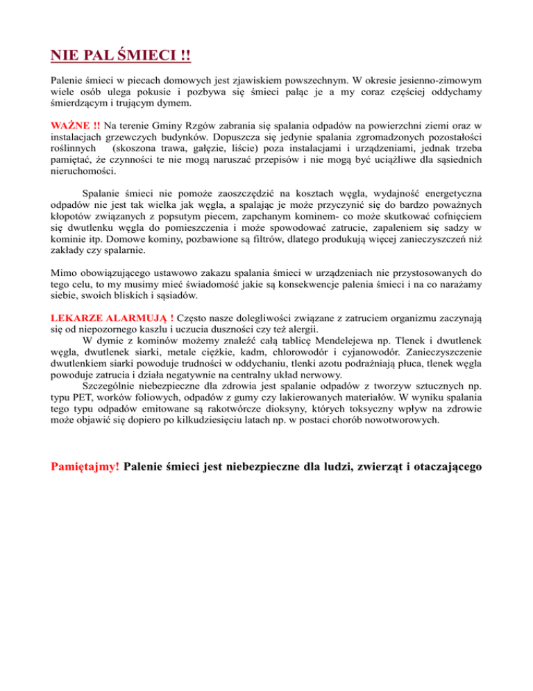 NIE PAL ŚMIECI !! Palenie śmieci w piecach domowych jest zjawiskiem powszechnym. W okresie jesienno-zimowym wiele osób ulega pokusie i pozbywa się śmieci paląc je a my coraz częściej oddychamy śmierdzącym i trującym dymem. WAŻNE !! Na terenie Gminy Rzgów zabrania się spalania odpadów instalacjach grzewczych budynków. Dopuszcza się jedynie spalania roślinnych (skoszona trawa, gałęzie, liście) poza instalacjami i pamiętać, że czynności te nie mogą naruszać przepisów i nie mogą nieruchomości. na powierzchni ziemi oraz w zgromadzonych pozostałości urządzeniami, jednak trzeba być uciążliwe dla sąsiednich Spalanie śmieci nie pomoże zaoszczędzić na kosztach węgla, wydajność energetyczna odpadów nie jest tak wielka jak węgla, a spalając je może przyczynić się do bardzo poważnych kłopotów związanych z popsutym piecem, zapchanym kominem- co może skutkować cofnięciem się dwutlenku węgla do pomieszczenia i może spowodować zatrucie, zapaleniem się sadzy w kominie itp. Domowe kominy, pozbawione są filtrów, dlatego produkują więcej zanieczyszczeń niż zakłady czy spalarnie. Mimo obowiązującego ustawowo zakazu spalania śmieci w urządzeniach nie przystosowanych do tego celu, to my musimy mieć świadomość jakie są konsekwencje palenia śmieci i na co narażamy siebie, swoich bliskich i sąsiadów. LEKARZE ALARMUJĄ ! Często nasze dolegliwości związane z zatruciem organizmu zaczynają się od niepozornego kaszlu i uczucia duszności czy też alergii. W dymie z kominów możemy znaleźć całą tablicę Mendelejewa np. Tlenek i dwutlenek węgla, dwutlenek siarki, metale ciężkie, kadm, chlorowodór i cyjanowodór. Zanieczyszczenie dwutlenkiem siarki powoduje trudności w oddychaniu, tlenki azotu podrażniają płuca, tlenek węgla powoduje zatrucia i działa negatywnie na centralny układ nerwowy. Szczególnie niebezpieczne dla zdrowia jest spalanie odpadów z tworzyw sztucznych np. typu PET, worków foliowych, odpadów z gumy czy lakierowanych materiałów. W wyniku spalania tego typu odpadów emitowane są rakotwórcze dioksyny, których toksyczny wpływ na zdrowie może objawić się dopiero po kilkudziesięciu latach np. w postaci chorób nowotworowych. Pamiętajmy! Palenie śmieci jest niebezpieczne dla ludzi, zwierząt i otaczającego