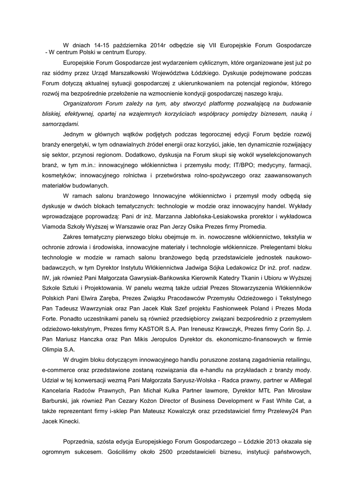 W dniach 14-15 października 2014r odbędzie się VII Europejskie Forum Gospodarcze - W centrum Polski w centrum Europy. Europejskie Forum Gospodarcze jest wydarzeniem cyklicznym, które organizowane jest już po raz siódmy przez Urząd Marszałkowski Województwa Łódzkiego. Dyskusje podejmowane podczas Forum dotyczą aktualnej sytuacji gospodarczej z ukierunkowaniem na potencjał regionów, którego rozwój ma bezpośrednie przełożenie na wzmocnienie kondycji gospodarczej naszego kraju. Organizatorom Forum zależy na tym, aby stworzyć platformę pozwalającą na budowanie bliskiej, efektywnej, opartej na wzajemnych korzyściach współpracy pomiędzy biznesem, nauką i samorządami. Jednym w głównych wątków podjętych podczas tegorocznej edycji Forum będzie rozwój branży energetyki, w tym odnawialnych źródeł energii oraz korzyści, jakie, ten dynamicznie rozwijający się sektor, przynosi regionom. Dodatkowo, dyskusja na Forum skupi się wokół wyselekcjonowanych branż, w tym m.in.: innowacyjnego włókiennictwa i przemysłu mody; IT/BPO; medycyny, farmacji, kosmetyków; innowacyjnego rolnictwa i przetwórstwa rolno-spożywczego oraz zaawansowanych materiałów budowlanych. W ramach salonu branżowego Innowacyjne włókiennictwo i przemysł mody odbędą się dyskusje w dwóch blokach tematycznych: technologie w modzie oraz innowacyjny handel. Wykłady wprowadzające poprowadzą: Pani dr inż. Marzanna Jabłońska-Lesiakowska prorektor i wykładowca Viamoda Szkoły Wyższej w Warszawie oraz Pan Jerzy Osika Prezes firmy Promedia. Zakres tematyczny pierwszego bloku obejmuje m. in. nowoczesne włókiennictwo, tekstylia w ochronie zdrowia i środowiska, innowacyjne materiały i technologie włókiennicze. Prelegentami bloku technologie w modzie w ramach salonu branżowego będą przedstawiciele jednostek naukowobadawczych, w tym Dyrektor Instytutu Włókiennictwa Jadwiga Sójka Ledakowicz Dr inż. prof. nadzw. IW, jak również Pani Małgorzata Gawrysiak-Bańkowska Kierownik Katedry Tkanin i Ubioru w Wyższej Szkole Sztuki i Projektowania. W panelu wezmą także udział Prezes Stowarzyszenia Włókienników Polskich Pani Elwira Zaręba, Prezes Związku Pracodawców Przemysłu Odzieżowego i Tekstylnego Pan Tadeusz Wawrzyniak oraz Pan Jacek Kłak Szef projektu Fashionweek Poland i Prezes Moda Forte. Ponadto uczestnikami panelu są również przedsiębiorcy związani bezpośrednio z przemysłem odzieżowo-tekstylnym, Prezes firmy KASTOR S.A. Pan Ireneusz Krawczyk, Prezes firmy Corin Sp. J. Pan Mariusz Hanczka oraz Pan Mikis Jeropulos Dyrektor ds. ekonomiczno-finansowych w firmie Olimpia S.A. W drugim bloku dotyczącym innowacyjnego handlu poruszone zostaną zagadnienia retailingu, e-commerce oraz przedstawione zostaną rozwiązania dla e-handlu na przykładach z branży mody. Udział w tej konwersacji wezmą Pani Małgorzata Saryusz-Wolska - Radca prawny, partner w AMlegal Kancelaria Radców Prawnych, Pan Michał Kulka Partner lawmore, Dyrektor MTŁ Pan Mirosław Barburski, jak również Pan Cezary Kożon Director of Business Development w Fast White Cat, a także reprezentant firmy i-sklep Pan Mateusz Kowalczyk oraz przedstawiciel firmy Przelewy24 Pan Jacek Kinecki. Poprzednia, szósta edycja Europejskiego Forum Gospodarczego – Łódzkie 2013 okazała się ogromnym sukcesem. Gościliśmy około 2500 przedstawicieli biznesu, instytucji państwowych, samorządowych, otoczenia biznesu i nauki. W ciągu dwóch dni obrad odbyły się 4 sesje plenarne, 10 salonów branżowych, 10 wydarzeń towarzyszących. Serdecznie zapraszamy do udziału w tym wydarzeniu. Wierzymy że VII Europejskie Forum Gospodarcze będzie ciekawym i inspirującym doświadczeniem i doskonałą okazją do budowania relacji biznesowych.