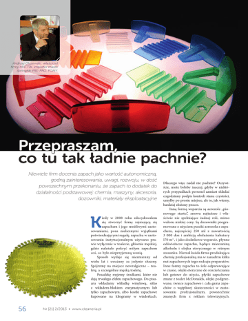 Technologie Andrzej Olszewski, właściciel firmy MATTIK, importer marek SpringAir, FRE-PRO, FOMY. Przepraszam, co tu tak ładnie pachnie? Niewiele firm docenia zapach jako wartość autonomiczną, godną zainteresowania, uwagi, rozwoju, w dość powszechnym przekonaniu, że zapach to dodatek do działalności podstawowej: chemia, maszyny, akcesoria, dozowniki, materiały eksploatacyjne K iedy w 2008 roku zdecydowałem się stworzyć firmę zajmującą się zapachem i jego możliwymi zastosowaniami, poza nielicznymi wyjątkami potwierdzającymi regułę, zapachu w zastosowaniu instytucjonalnym używano prawie wyłącznie w toalecie, głównie męskiej, gdzie należało pokryć miłym zapachem coś, co było nieprzyjemną wonią. Sposób wydaje się niezmienny od wielu lat i uważany za jedynie słuszny. Spójrzmy na miejsce newralgiczne – toaletę, a szczególnie męską toaletę. Posadzkę myjemy środkami, które nie dają trwałego efektu zapachowego. Do pisuaru wkładamy wkładkę winylową, sitko z wkładem-blokiem enzymatycznym lub tylko zapachowym, albo kostki zapachowe kupowane na kilogramy w wiaderkach. 56 Nr [21] 2/2013 • www.cleaneria.pl Dlaczego więc nadal nie pachnie? Oczywiście, może byłoby inaczej, gdyby w niektórych przypadkach personel zamiast składać cogodzinny podpis kontroli stanu czystości, umyłby po prostu miejsce, ale to, jak wiemy, bardziej złożony proces. Inną formą wsparcia są aerozole „pionowego startu”, znowu najtańsze i właściwie nie spełniające żadnej roli, mimo waloru niskiej ceny. Są dozowniki programowane z użyciem puszki aerozolu z zapachem, najczęściej 250 ml z zawartością 3 000 doz i ambicją obsłużenia kubatury 170 m3 , i jako dodatkowe wsparcie, płynne odświeżacze zapachu, będące mieszaniną alkoholu i olejku eterycznego w różnym stosunku. Niemal każda firma produkująca chemię profesjonalną ma w zanadrzu kilka nut zapachowych tego rodzaju preparatów. Inne formy zapachu to żele odparowujące w czasie, olejki eteryczne do rozcieńczania lub gotowe do użycia, płytki zapachowe znane z toalet McDonalds, olejki podgrzewane, świece zapachowe i cała gama zapachów o wątpliwej skuteczności w zastosowaniu profesjonalnym, powszechnie znanych firm z reklam telewizyjnych. Technologie Co powinieneś wiedzieć o zapachach W Czy wymieniłem wszystko? Z całą pewnością nie. Ale nawet gdyby tylko pobieżnie rzucić okiem na tę wyliczankę, to wydaje się niemożliwe, by rynek nie miał właściwej odpowiedzi na potrzeby klienta. Dlaczego klienci, choć nie generalizuję, wciąż odczuwają niedosyt, albo zwyczajnie nie są zadowoleni? Na rynku jest mnóstwo firm dostarczających firmom sprzątającym i klientom detalicznym higienę jako całościowy system. Niewiele firm docenia zapach jako wartość autonomiczną, godną zainteresowania, uwagi, rozwoju w dość powszechnym przekonaniu, że zapach to dodatek do działalności podstawowej: chemia, maszyny, akcesoria, dozowniki, materiały eksploatacyjne. To właśnie firmy handlowe kreują taki model produktowy, nie chcąc dostrzec ważności zapachu. Implikacją tego jest pobieżne traktowanie zapachu w pracy i serwisie firmy sprzątającej. Wielokrotnie, popołudniami, po zakończeniu pracy w różnych miejscach w Polsce, rozmawiam z napotkanymi pracownikami firm sprzątających, podglądam ich pracę i materiały, jakich używają do czyszczenia danego miejsca i pozostawienia swoistej pieczęci i podpisu zapachowego. Trudno mi czasem zrozumieć zastosowanie naprawdę najtańszych form aplikacji zapachu, jakże „drogich”, bo nie spełniających niczyich oczekiwań. Tym bardziej wydaje się irracjonalne ich zastosowanie, bo każdy klient, każdy zleceniodawca, każda firma sprzątająca przykłada wagę do kosztów. Jeśli nie uzyskujemy żadnego efektu i nikt nie jest zadowolony, dlaczego wydajemy własne pieniądze lub klienta na coś, co nie spełnia oczekiwań? Często pytam moich klientów, jakich cech oczekują od zapachu osobistej wody toaletowej dla siebie? Zawsze padają jednakowe odpowiedzi – unikalnej nuty zapachowej, dającej wrażenie oryginalności, wyłączności i trwałości. Czy w odniesieniu do zapachowej przestrzeni nas otaczającej zastosujemy inne kryteria? Zapach – dobry, zły, jakikolwiek – jest integralną częścią powietrza, które wdychamy. Oczy możemy zamknąć, uszy zakryć, możemy powstrzymać się od dotykania i smakowania. Węch natomiast jest jedynym zmysłem nie dającym się wyłączyć. Każdego dnia wykonujemy średnio 20 tysięcy wdechów, a z każdym wdechem odczuwamy jakiś zapach. To zapach jako pierwszy dostarcza nam poczucia komfortu, bezpieczeństwa, bądź jego braku. To zapach buduje naszą relację z miejscem. Jaka ona będzie, zależy od tego, czy zdajemy sobie sprawę z istotnego wpływu zapachu na emocje, a więc na nastrój i samopoczucie osób odwiedzających dane miejsce. Problematyczne zapachy Ze zrozumiałych względów na chwilę przystanąłem przy toalecie. To „gwóźdź programu”, a czasami przysłowiowy „gwóźdź do trumny” serwisu sprzątającego. Często klienci chcieliby zastosować zapach, ale nie wiedzą, jak uporać się z wonią wszechobecnej uryny. Można zastosować różnego rodzaju preparaty enzymatyczne, dobre, wręcz doskonałe, niestety wciąż drogie, a dla serwisów sprzątających po prostu zbyt drogie. W takim przypadku zawsze proponuję mój ulubiony sposób - dwutlenek chloru, ciągle niestosowany na powszechną skalę przez firmy z sektora utrzymania czystości. Najtańszy, o ciekawym spektrum oddziaływania i wszechstronnym zastosowaniu dezynfekant, a jego uboczną właściwością szyscy stykamy się z zapachami. Zapach wpływa na naszą świadomość od najmłodszych lat. Komórki czuciowe w nosie zamieniają cząsteczkę zapachu na impuls elektryczny, a ten zostaje zinterpretowany przez mózg zgodnie z naszym doświadczeniem i pamięcią. Nasz świat zaw