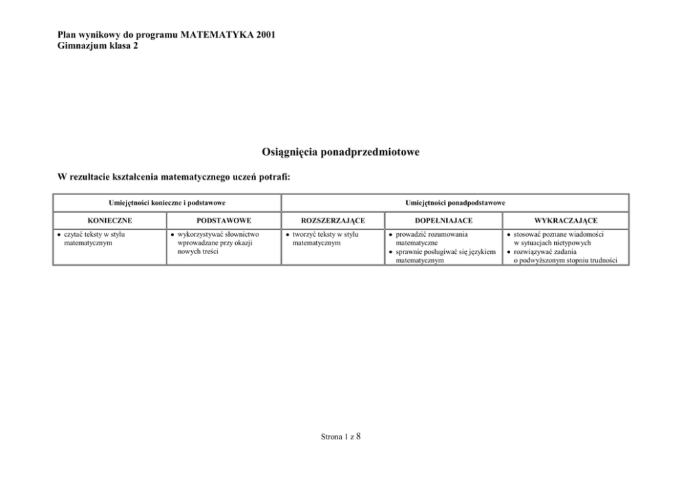Plan wynikowy do programu MATEMATYKA 2001 Gimnazjum klasa 2 Osiągnięcia ponadprzedmiotowe W rezultacie kształcenia matematycznego uczeń potrafi: Umiejętności konieczne i podstawowe KONIECZNE czytać teksty w stylu matematycznym PODSTAWOWE wykorzystywać słownictwo wprowadzane przy okazji nowych treści Umiejętności ponadpodstawowe ROZSZERZAJĄCE tworzyć teksty w stylu matematycznym Strona 1 z 8 DOPEŁNIAJACE WYKRACZAJĄCE prowadzić rozumowania matematyczne sprawnie posługiwać się językiem matematycznym stosować poznane wiadomości w sytuacjach nietypowych rozwiązywać zadania o podwyższonym stopniu trudności Plan wynikowy do programu MATEMATYKA 2001 Gimnazjum klasa 2 Osiągnięcia przedmiotowe W rezultacie realizacji modułu uczeń potrafi: Podręcznik klasa 2 nr ewid. 39/2/2009 Tytuł modułu Umiejętności podstawowe KONIECZNE 1. Statystyka odczytać informacje z tabeli odczytać informacje z diagramu 2. Mnożenie i dzielenie potęg o tych samych podstawach 3. Mnożenie i dzielenie potęg o tych samych wykładnikach przedstawić iloczyn potęg o tych samych podstawach w postaci potęgi jednej liczby przedstawić iloraz potęg o tych samych podstawach w postaci potęgi jednej liczby przedstawić potęgę potęgi w postaci potęgi jednej liczby wyznaczyć iloczyn potęg o takim samym wykładniku wyznaczyć iloraz potęg o takim samym wykładniku 4. Potęga o wykładniku całkowitym Umiejętności ponadpodstawowe ROZSZERZAJĄCE DOPEŁNIAJACE obliczyć średnią arytmetyczną sporządzić diagram słupkowy na podstawie tabeli uprościć wyrażenie korzystając ze wzorów na iloczyn i iloraz potęg o tych samych podstawach oraz potęgę potęgi wyznaczyć medianę danych wyników wyznaczyć modę danych wyników odczytać z diagramu słupkowego modę wyników obliczyć wartość wyrażenia stosując wzory dotyczące działań na potęgach stosować działania na potęgach o wykładniku dodatnim do przekształcania wyrażeń arytmetycznych obliczyć potęgę danej liczby także o wykładniku ujemnym przedstawić liczbę w postaci potęgi. skorzystać z poznanych wzorów dotyczących PODSTAWOWE WYKRACZAJĄCE odczytać z diagramu słupkowego medianę wyników zapisać związki pomiędzy jednostkami metrycznymi wykorzystując potęgi Strona 2 z 8 stosować działania na potęgach o wykładniku dodatnim do przekształcania wyrażeń algebraicznych zapisać związki pomiędzy jednostkami metrycznymi wykorzystując potęgi uzasadniać prawa działań na potęgach Plan wynikowy do programu MATEMATYKA 2001 Gimnazjum klasa 2 Podręcznik klasa 2 nr ewid. 39/2/2009 Tytuł modułu Umiejętności podstawowe KONIECZNE Umiejętności ponadpodstawowe ROZSZERZAJĄCE PODSTAWOWE potęg wyznaczyć liczbę zapisaną w postaci wykładniczej 5. Wielokąty wpisane w okrąg rozpoznać wielokąty wpisane w okrąg 6. Położenie prostej względem okręgu rozpoznać na rysunku styczne i sieczne 7. Wielokąty opisane na okręgu rozpoznać wielokąty opisane na okręgu 8. Obwód i pole koła określić zależność pomiędzy obwodem koła a jego promieniem wskazać środek okręgu opisanego na trójkącie opisać okrąg na trójkącie wskazać środek okręgu opisanego na czworokącie opisać okrąg na czworokącie skorzystać z własności wielokątów wpisanych w okrąg skorzystać z własności stycznych i siecznych w różnych sytuacjach wskazać środek okręgu wpisanego w trójkąt wyznaczyć środek okręgu wpisanego w trójkąt wyznaczyć środek okręgu wpisanego w czworokąt obliczyć pole koła obliczyć długość okręgu DOPEŁNIAJACE o wykładnikach ujemnych zapisać liczby dziesiętne wykorzystując potęgi o wykładnikach ujemnych zapisać liczby dziesiętne w notacji wykładniczej skonstruować sześciokąt foremny wpisany w okrąg skonstruować styczna do okręgu przechodząca przez dany punkt skorzystać z własności wielokątów opisanych na okręgu. obliczyć i oszacować z zadaną dokładnością długość okręgu, gdy dany jest jego promień. obliczyć z zadaną dokładnością długość Strona 3 z 8 WYKRACZAJĄCE uzasadnić poprawność konstrukcji stycznej do okręgu wyprowadzić wzór na pole trójkąta o danym obwodzie opisanego na okręgu o danym promieniu obliczyć pole wycinka kołowego obliczyć pole pierścienia kołowego rozpoznać odcinki kołowe obliczyć pole odcinka kołowego, na przykład gdy dany jest promień i kąt 30, 45, 60, 90 stopni. Plan wynikowy do programu MATEMATYKA 2001 Gimnazjum klasa 2 Podręcznik klasa 2 nr ewid. 39/2/2009 Tytuł modułu Umiejętności podstawowe KONIECZNE Umiejętności ponadpodstawowe ROZSZERZAJĄCE PODSTAWOWE DOPEŁNIAJACE WYKRACZAJĄCE promienia, gdy dana jest długość okręgu obliczyć z zadaną dokładnością pole koła, gdy dany jest jego promień 9. Mnożenie sum algebraicznych zredukować wyrazy podobne w sumie algebraicznej pomnożyć dwie sumy algebraiczne 10. Kwadrat sumy zapisać kwadrat sumy dwóch wyrażeń w postaci sumy algebraicznej zapisać kwadrat różnicy dwóch wyrażeń w postaci sumy algebraicznej 11. Różnica kwadratów skorzystać ze wzoru na różnicę kwadratów dwóch wyrażeń 12. Przekształcanie wyznaczyć określoną wielkość z podanego wzoru wyrażeń algebraicznych wyrażeń algebraicznych wzorów 13. Twierdzenie Pitagorasa 14. Wprowadzenie pojęcia pierwiastka obliczyć pole kwadratu zbudowanego na jednym z boków trójkąta prostokątnego sprawdzić, czy trójkąt jest prostokątny wskazać liczbę taką, że po podniesieniu jej rozpoznać liczbę niewymierną pomnożyć przez siebie więcej niż dwie sumy algebraiczne uprościć wyrażenia, w których występuje kwadrat sumy dwóch wyrażeń uprościć wyrażenia, w których występuje kwadrat różnicy dwóch wyrażeń skorzystać z wzorów skróconego mnożenia udowodnić twierdzenie Pitagorasa obliczać wartości pierwiastków drugiego i Strona 4 z 8 oszacować pierwiastek danej liczby z zadaną przekształcić sumę algebraiczną na