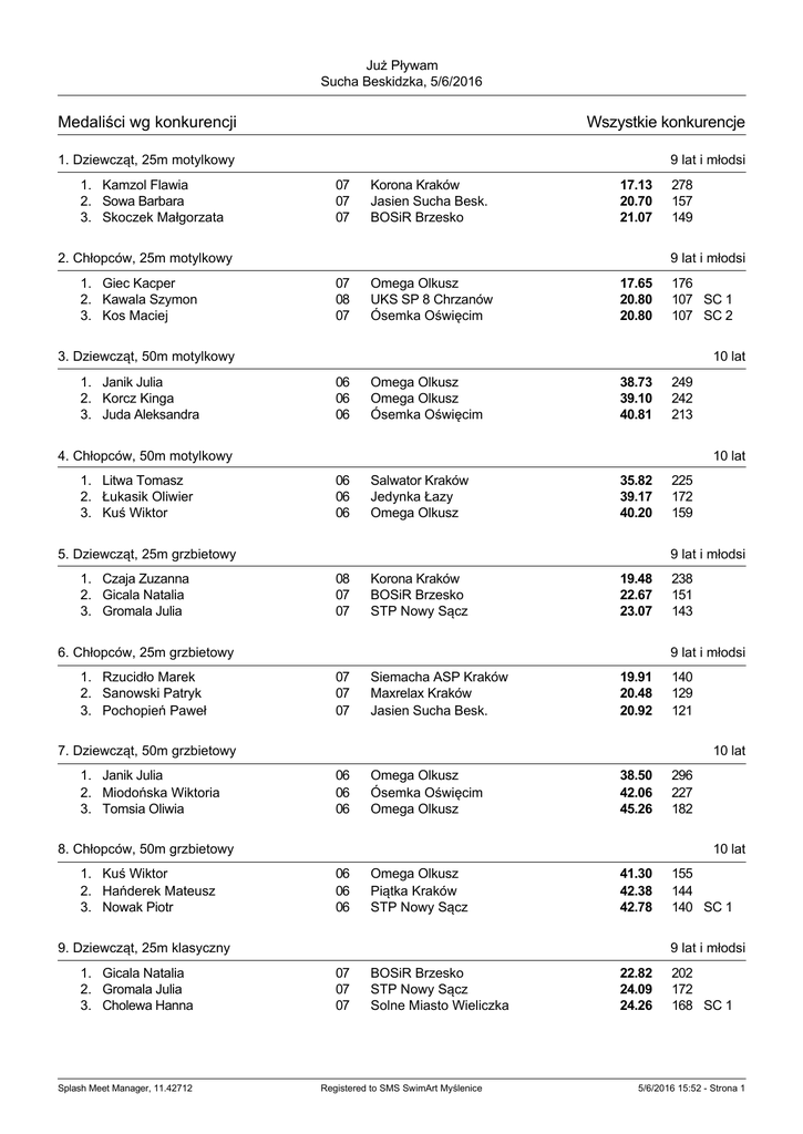 Już Pływam Sucha Beskidzka, 5/6/2016 Medaliści wg konkurencji Wszystkie konkurencje 1. Dziewcząt, 25m motylkowy 9 lat i młodsi 1. Kamzol Flawia 2. Sowa Barbara 3. Skoczek Małgorzata 07 07 07 Korona Kraków Jasien Sucha Besk. BOSiR Brzesko 17.13 20.70 21.07 2. Chłopców, 25m motylkowy 1. Giec Kacper 2. Kawala Szymon 3. Kos Maciej 278 157 149 9 lat i młodsi 07 08 07 Omega Olkusz UKS SP 8 Chrzanów Ósemka Oświęcim 17.65 20.80 20.80 176 107 SC 1 107 SC 2 3. Dziewcząt, 50m motylkowy 1. Janik Julia 2. Korcz Kinga 3. Juda Aleksandra 10 lat 06 06 06 Omega Olkusz Omega Olkusz Ósemka Oświęcim 38.73 39.10 40.81 249 242 213 4. Chłopców, 50m motylkowy 1. Litwa Tomasz 2. Łukasik Oliwier 3. Kuś Wiktor 10 lat 06 06 06 Salwator Kraków Jedynka Łazy Omega Olkusz 35.82 39.17 40.20 5. Dziewcząt, 25m grzbietowy 1. Czaja Zuzanna 2. Gicala Natalia 3. Gromala Julia 9 lat i młodsi 08 07 07 Korona Kraków BOSiR Brzesko STP Nowy Sącz 19.48 22.67 23.07 6. Chłopców, 25m grzbietowy 1. Rzucidło Marek 2. Sanowski Patryk 3. Pochopień Paweł 225 172 159 238 151 143 9 lat i młodsi 07 07 07 Siemacha ASP Kraków Maxrelax Kraków Jasien Sucha Besk. 19.91 20.48 20.92 140 129 121 7. Dziewcząt, 50m grzbietowy 1. Janik Julia 2. Miodońska Wiktoria 3. Tomsia Oliwia 10 lat 06 06 06 Omega Olkusz Ósemka Oświęcim Omega Olkusz 38.50 42.06 45.26 8. Chłopców, 50m grzbietowy 1. Kuś Wiktor 2. Hańderek Mateusz 3. Nowak Piotr 10 lat 06 06 06 Omega Olkusz Piątka Kraków STP Nowy Sącz 41.30 42.38 42.78 9. Dziewcząt, 25m klasyczny 1. Gicala Natalia 2. Gromala Julia 3. Cholewa Hanna Splash Meet Manager, 11.42712 296 227 182 155 144 140 SC 1 9 lat i młodsi 07 07 07 BOSiR Brzesko STP Nowy Sącz Solne Miasto Wieliczka Registered to SMS SwimArt Myślenice 22.82 24.09 24.26 202 172 168 SC 1 5/6/2016 15:52 - Strona 1 Już Pływam Sucha Beskidzka, 5/6/2016 10. Chłopców, 25m klasyczny 1. Kuna Jakub 2. Przystał Antonio 3. Chabasiewicz Jakub 9 lat i młodsi 07 07 07 Solne Miasto Wieliczka Solne Miasto Wieliczka Salwator Kraków 23.57 23.84 24.31 119 115 109 11. Dziewcząt, 50m klasyczny 1. Jarosz Helena 2. Bętkowska Zuzanna 3. Kaszuba Maja 10 lat 06 06 06 Omega Olkusz Optima Skawina Omega Olkusz 45.04 47.99 48.14 261 216 214 12. Chłopców, 50m klasyczny 1. Czyż Adam 2. Płonka Bartosz 3. Nosowicz Mikołaj 10 lat 06 06 06 Siemacha ASP Kraków Omega Olkusz Omega Olkusz 44.70 45.13 45.51 13. Dziewcząt, 25m dowolny 1. Kamzol Flawia 2. Sowa Barbara 3. Piętka Zuzanna 9 lat i młodsi 07 07 07 Korona Kraków Jasien Sucha Besk. STP Nowy Sącz 16.36 17.88 18.13 14. Chłopców, 25m dowolny 1. Giec Kacper 2. Nowakowski Oliwier 3. Gąsiorek Wiktor 180 175 170 273 209 200 9 lat i młodsi 07 07 07 Omega Olkusz Siemacha ASP Kraków Solne Miasto Wieliczka 16.61 17.84 18.02 166 134 130 15. Dziewcząt, 50m dowolny 1. Jarosz Helena 2. Korcz Kinga 3. Tomsia Oliwia 10 lat 06 06 06 Omega Olkusz Omega Olkusz Omega Olkusz 34.73 35.24 35.99 299 286 269 16. Chłopców, 50m dowolny 1. Litwa Tomasz 2. Łukasik Oliwier 3. Choma Maksym 10 lat 06 06 06 Salwator Kraków Jedynka Łazy Omega Olkusz 32.64 35.14 35.42 239 191 187 17. Mieszane, 8 x 25m dowolny 1. Omega Olkusz 1 2. Jasien Sucha Besk. 1 3. STP Nowy Sącz 1 10 lat Omega Olkusz Jasien Sucha Besk. STP Nowy Sącz 2:24.07 2:39.04 2:39.68 9 lat i młodsi 17. Mieszane, 8 x 25m dowolny 1. Mistrzowie z Wieliczki 2. Maxrelax Kraków 1 3. Marbi-Sport Żywiec 1 Solne Miasto Wieliczka Maxrelax Kraków Marbi-Sport Żywiec 2:36.91 3:00.76 3:36.51 18. Dziewcząt, 4 x 50m zmienny 1. Omega Olkusz 1 2. Ósemka Oświęcim 1 3. AS Progres 1 Splash Meet Manager, 11.42712 10 lat Omega Olkusz Ósemka Oświęcim Siemacha ASP Kraków Registered to SMS SwimArt Myślenice 2:41.13 3:01.66 3:02.71 269 187 184 5/6/2016 15:52 - Strona 2 Już Pływam Sucha Beskidzka, 5/6/2016 18. Dziewcząt, 4 x 50m zmienny 1. AS Progres 2 9 lat i młodsi Siemacha ASP Kraków 3:38.20 108 19. Chłopców, 4 x 50m zmienny 1. Omega Olkusz 1 2. Ósemka Oświęcim 1 3. AS Progres Splash Meet Manager, 11.42712 10 lat Omega Olkusz Ósemka Oświęcim Siemacha ASP Kraków Registered to SMS SwimArt Myślenice 2:44.70 3:01.22 3:05.92 165 124 115 5/6/2016 15:52 - Strona 3
