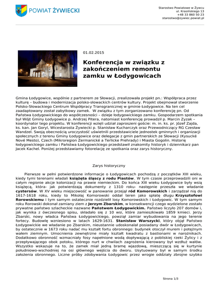 Starostwo Powiatowe w Żywcu ul. Krasińskiego 13 +48 33 860 50 23 [email protected] 01.02.2015 Konferencja w związku z zakończeniem remontu zamku w Łodygowicach Gmina Łodygowice, wspólnie z partnerem ze Słowacji, zrealizowała projekt pn.: Współpraca przez kulturę – budowa i modernizacja polsko-słowackich centrów kultury. Projekt obejmował stworzenie Polsko-Słowackiego Centrum Współpracy Transgranicznej w gminie Łodygowice. Na ten cel zaadaptowany został zabytkowy zamek. W związku z tym zorganizowano konferencję pn. Od Państwa Łodygowickiego do współczesności – dzieje łodygowickiego zamku. Gospodarzem spotkania był Wójt Gminy Łodygowice p. Andrzej Pitera, natomiast konferencję prowadził p. Marcin Zyzak – koordynator tego projektu. W konferencji wzięli udział zaproszeni goście: m. in. ks. pr. Józef Zajda, ks. kan. Jan Goryl, Wicestarosta Żywiecki p. Stanisław Kucharczyk oraz Przewodniczący RG Czesław Wandzel. Swoją obecnością uroczystość uświetnili przedstawiciele jednostek gminnych i organizacji społecznych z terenu Gminy Łodygowice oraz delegacje z gmin partnerskich ze Słowacji (Kysucké Nové Mesto), Czech (Mikroregion Zermanické a Terlicke Prehrady) i Miasta Gogolin. Historię łodygowickiego zamku i Państwa Łodygowickiego przedstawił znakomity historyk i dziennikarz pan Jacek Kachel. Poniżej przedstawiamy fotorelację ze spotkania oraz zarys historyczny. Zarys historyczny Pierwsze w pełni potwierdzone informacje o Łodygowicach pochodzą z początków XIII wieku, kiedy tymi terenami władali książęta śląscy z rodu Piastów . W tym czasie przeprowadzili oni w całym regionie akcje kolonizacji na prawie niemieckim. Do końca XIII wieku Łodygowice były wsią książęcą, która- jak potwierdzają dokumenty z 1310 roku- następnie przeszła we władanie cystersów. W XV wieku miejscowość w panowanie przejął ród Komorowskich i zarządzał nią do 1617-1618 roku, kiedy to Mikołaj Komorowski oddał teren jako spłatę długu Krzysztofowi Rorowskiemu i tym samym ostatecznie rozdzielił losy Komorowskich i Łodygowic. W tym samym roku Rorowski dokonał zamiany ziem z Jerzym Zbarskim, w konsekwencji czego wydzielone zostało prywatne państwo szlacheckie nazwane Państwem Łodygowickim. Państwo liczyło 207 domów i, jak wynika z ówczesnego spisu, składało się z 10 wsi, które zamieszkiwało 1859 kmieci. Jerzy Zbarski, nowy władca Państwa Łodygowickiego, powziął zamiar wybudowania na jego terenie fortecy. Budowlę wzniesiono w latach 1629-1631. Stanisław Warszycki, który objął Państwo Łodygowickie we władanie po Zbarskim, nieustannie udoskonalał posiadany dwór w Łodygowicach, by ostatecznie w 1673 roku nadać mu kształt fortu obronnego: budynek otoczył murem i potężnym wałem ziemnym. Umocnienia zewnętrzne miały kształt kwadratu z bastionami w narożnikach. Dodatkowo obronność wzmacniały fosy napełnione wodą dopływającą z pobliskiej rzeki Żylicy i z przepływającego obok potoku, którego nurt w chwilach zagrożenia kierowany był wzdłuż wałów. Wszystko wskazuje na to, że zamek miał jedną bramę wjazdową, mieszczącą się w kurtynie południowo-wschodniej na osi głównego wejścia do dworu. Usytuowany był w samym środku założenia obronnego. Liczne próby zdobywania Łodygowic przez wrogie oddziały zbrojne szybko Strona 1/3 Starostwo Powiatowe w Żywcu ul. Krasińskiego 13 +48 33 860 50 23 [email protected] kończyły się fiaskiem. Założenia obronne fortu wymagały bowiem długotrwałego oblężenia. Przez potomnych Warszycki zapamiętany został jako despotyczny i surowy pan. Po jego śmierci zamek w Łodygowicach wielokrotnie przechodził z rąk do rąk poszczególnych członków jego rodziny. Fortalicja do celów wojennych po raz ostatni wykorzystywana była za czasów Konfederacji Barskiej #℣佐⌡⌀㜀㘀㠀ⴀ㜀㜀㈀⌡⍃倣℣, później straciła znaczenie obronne. W 1772 roku nastąpił pierwszy rozbiór Polski, w wyniku którego Państwo Łodygowickie weszło w skład Cesarstwa Austrii. W 1773 roku Państwo Łodygowickie przejął Ignacy Kalinowski i stał się pierwszym dziedzicem, który na stałe rezydował w łodygowickim zamku. Wśród kolejnych władców Państwa Łodygowickiego wymienić należy: księcia pszczyńskiego Anhalta Cothena #℣佐⌡⌀ 省䈀愁嬀挀椀眀攀 渀愀稀眀椀猀欀漀 䬀琀栀攀渀ⴀ倀氀攀猀猀⌡⍃倣℣; siostrzenicę Anhalta i żonę generała pruskie Hrabinę Charlottę de Stollberg Wernigerode; Rudolfa Theodora Seeligera, Józefa Karola Humborga; barona Artura Lüttwitza; dr Maksymiliana Lüttwitza #℣佐⌡⌀琀攀渀 漀猀琀愀琀渀椀 瀀漀搀挀稀愀猀 眀漀樀渀礀 瀀爀甀猀欀漀ⴀ愀甀猀琀爀椀愀挀欀椀攀 szpiegował na rzecz Prus, a z łodygowickiego zamku uczynił swoją kwaterę szpiegowską. Nie mogąc dłużej przebywać na terenie Państwa Łodygowickiego 25 września 1866 roku sprzedał Łodygowice Klementynie Primavesi de Weber#℣䍐⌡⌀Ⰰ Klementynę Primavesi de Weber. Nowa właścicielka nie doceniła walorów historycznych zamku, traktując go nie jako pamiątkę historyczną, ale jako swój wymagający remontu dom. Z tego powodu kazała do zamku dobudować pseudogotycki ganek i zmienić pokrycie z gontów na dachówkę powlekaną. Zajęła się również parkiem. Wiekowe umocnienia runęły, nie pod naporem wrogich armii, ale za sprawą decyzji delikatnej kobiety. Córka hrabiny Klementy, również Klementyna, poślubiła Adolfa von Klobusa- syna Ignacego i Elżbiety Brombackey. Wkrótce młode małżeństwo stało się właściwymi zarządcami Państwa Łodygowickiego. Z ich związku narodziło się pięcioro dzieci: Paweł, Otto, Rudolf, Robert i Klementyna. Rodzina Klobusów szczyciła się wokolicy bardzo dobrą opinią. Za jej panowania zamek i park przeszły całkowitą metamorfozę. Z początkiem lat 70. XIX stulecia zniwelowano wały i częściowo za